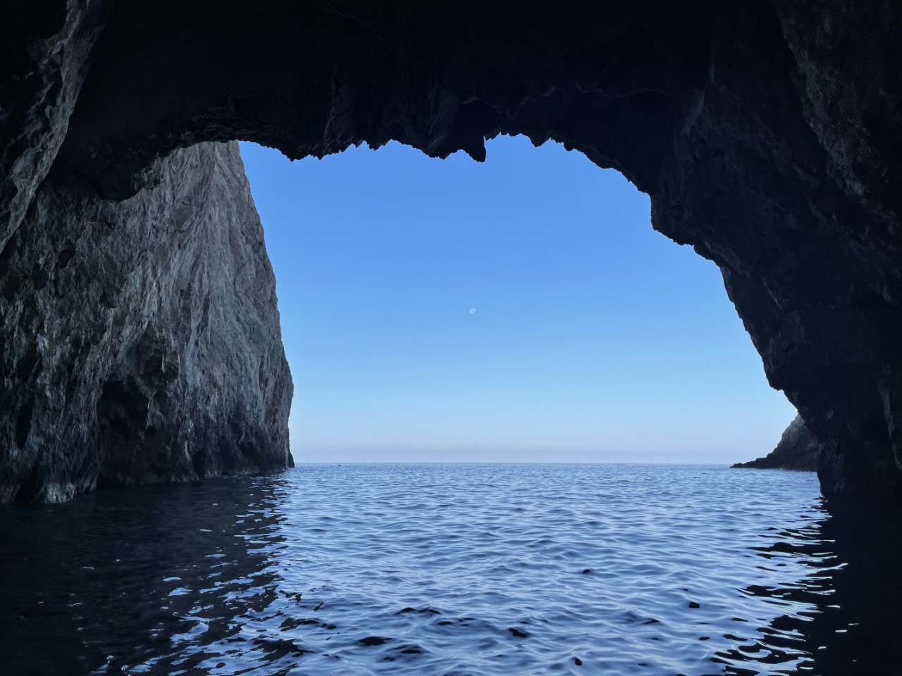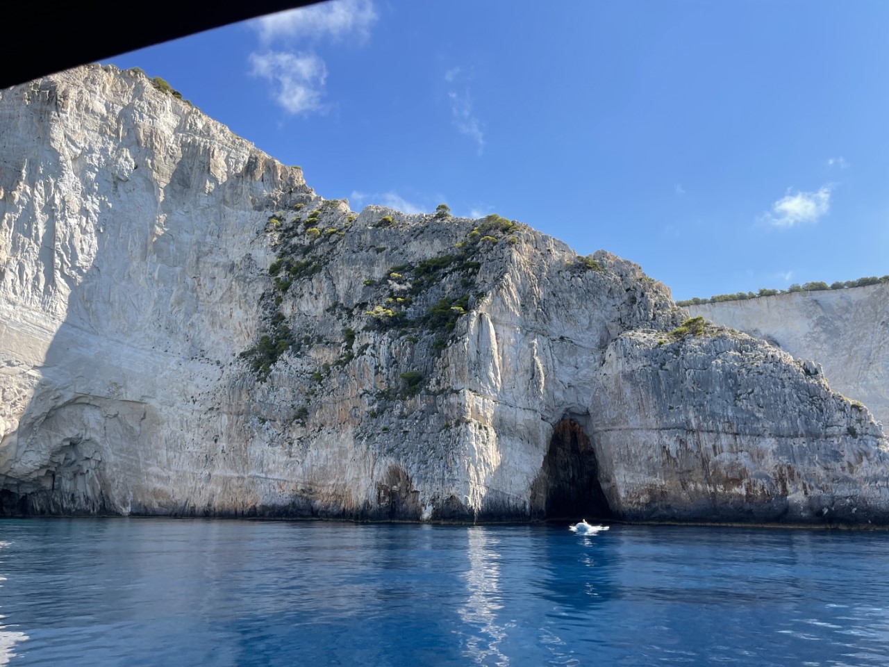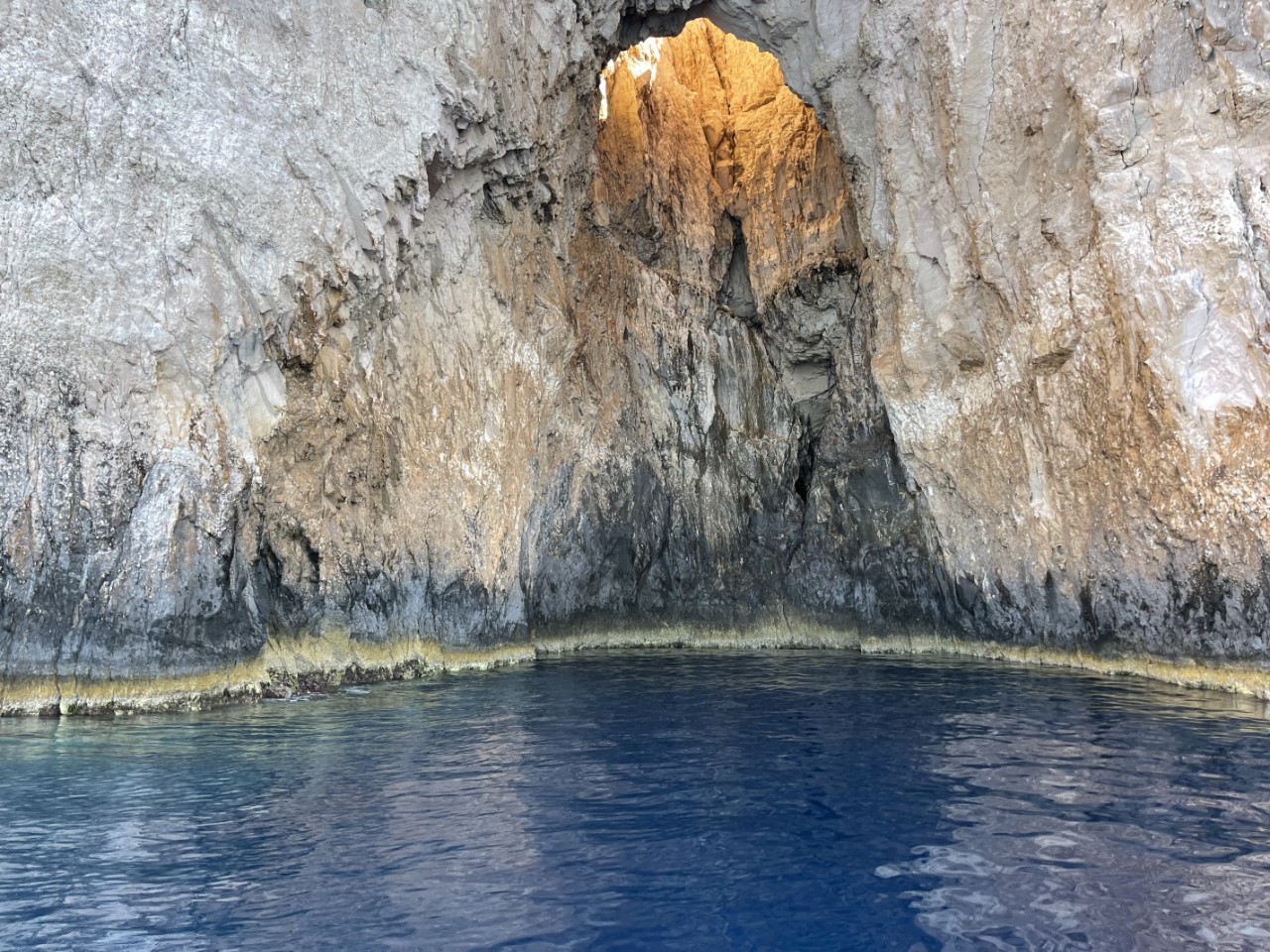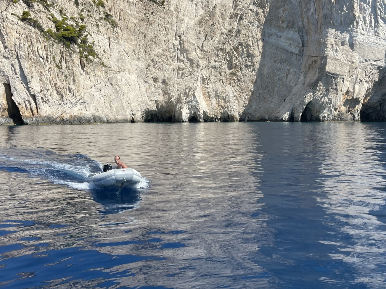 We zijn vanmorgen al vroeg aan het varen. Niet met de Just, maar met het bijbootje. Samen met Daniel ga ik roeiend de grotten bezoeken. Marianne blijft nog lekker even in de voorkajuit liggen.