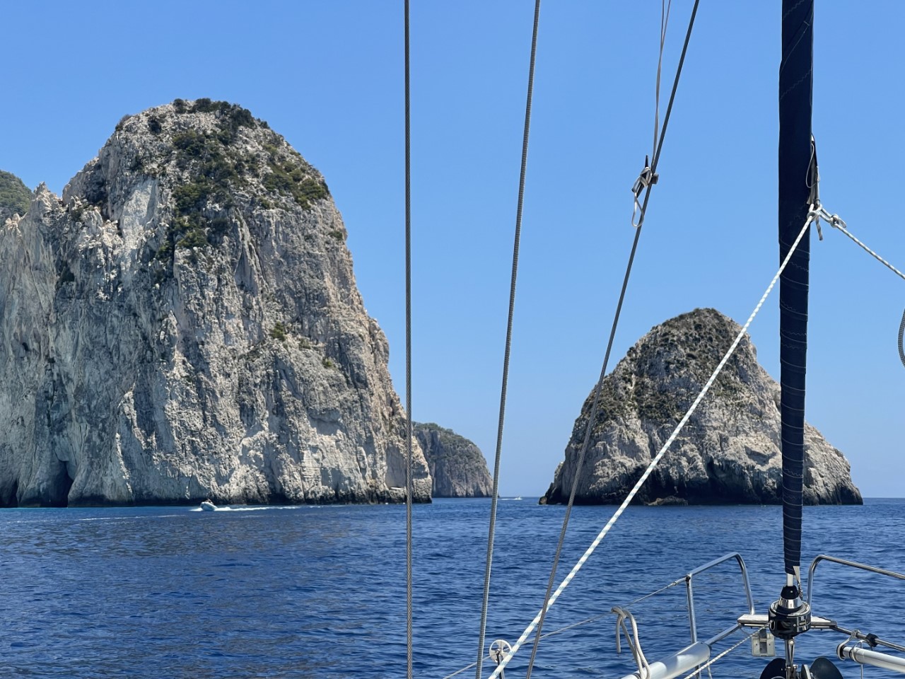 Na het passeren van twee grote puntige rotsen, waar we tussen doorvaren, laten we voor de derde keer ons anker zakken, nu voor een late lunchstop. We varen nog wat baaitjes in met nog vele interessante grotten en dan zetten we langzaam koers naar ons eindpunt voor vandaag. Keri, een ankerplekje, dat ons beschutting moet geven voor het verwachte noodweer van morgenmiddag. Er zou heftige regen, onweer, bliksem en 35 knopen wind komen.