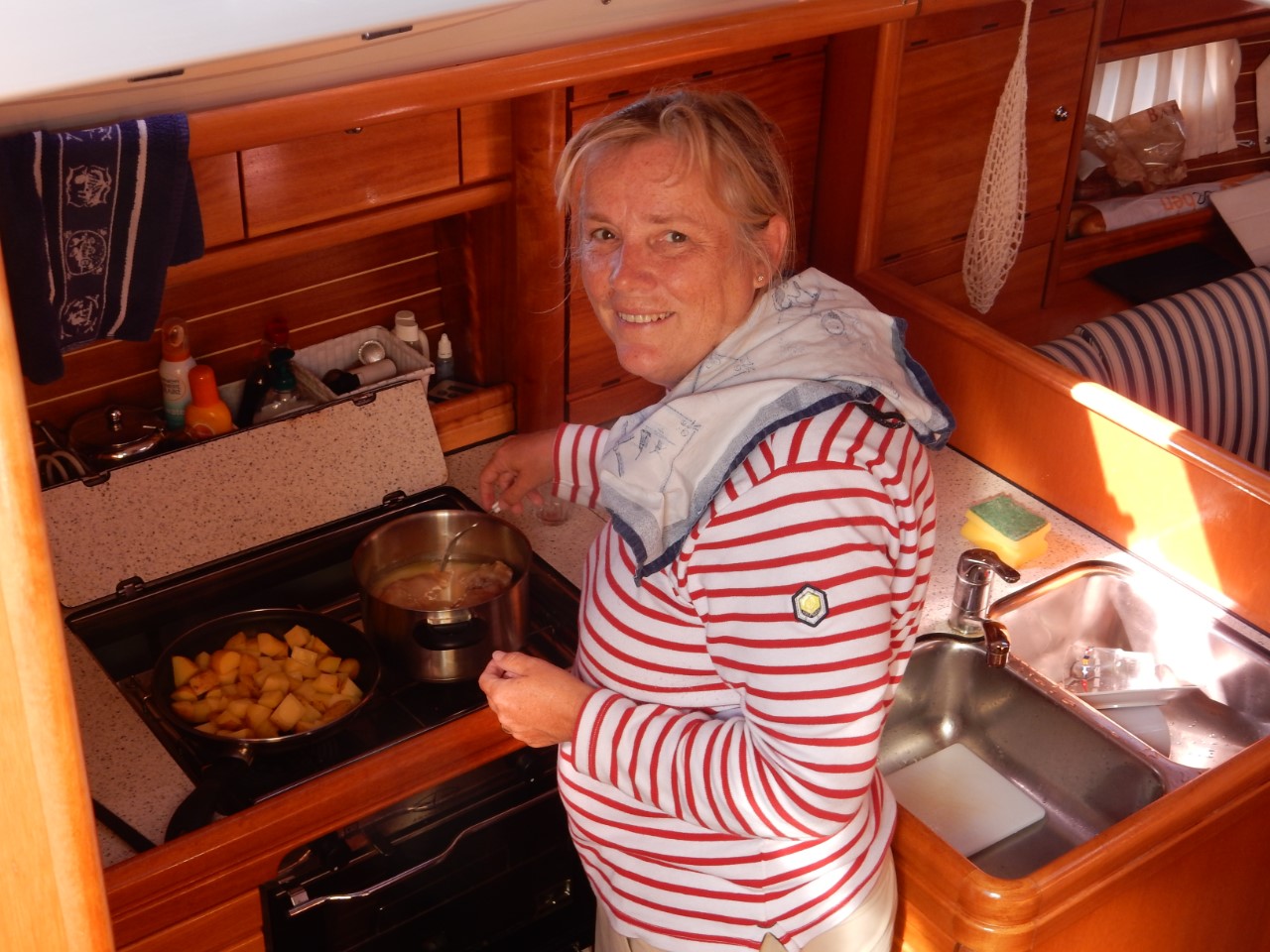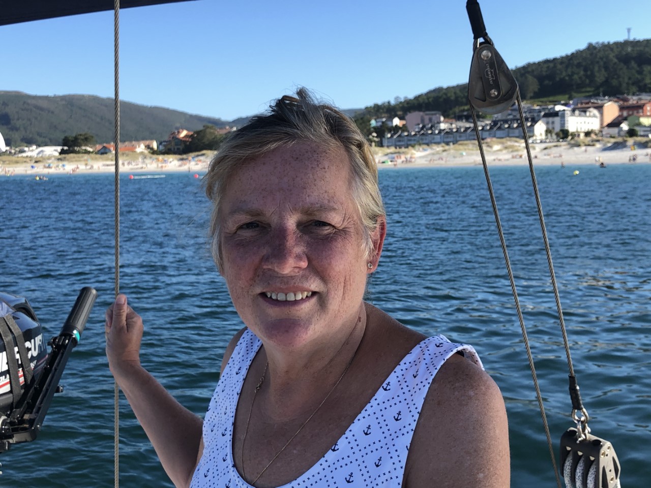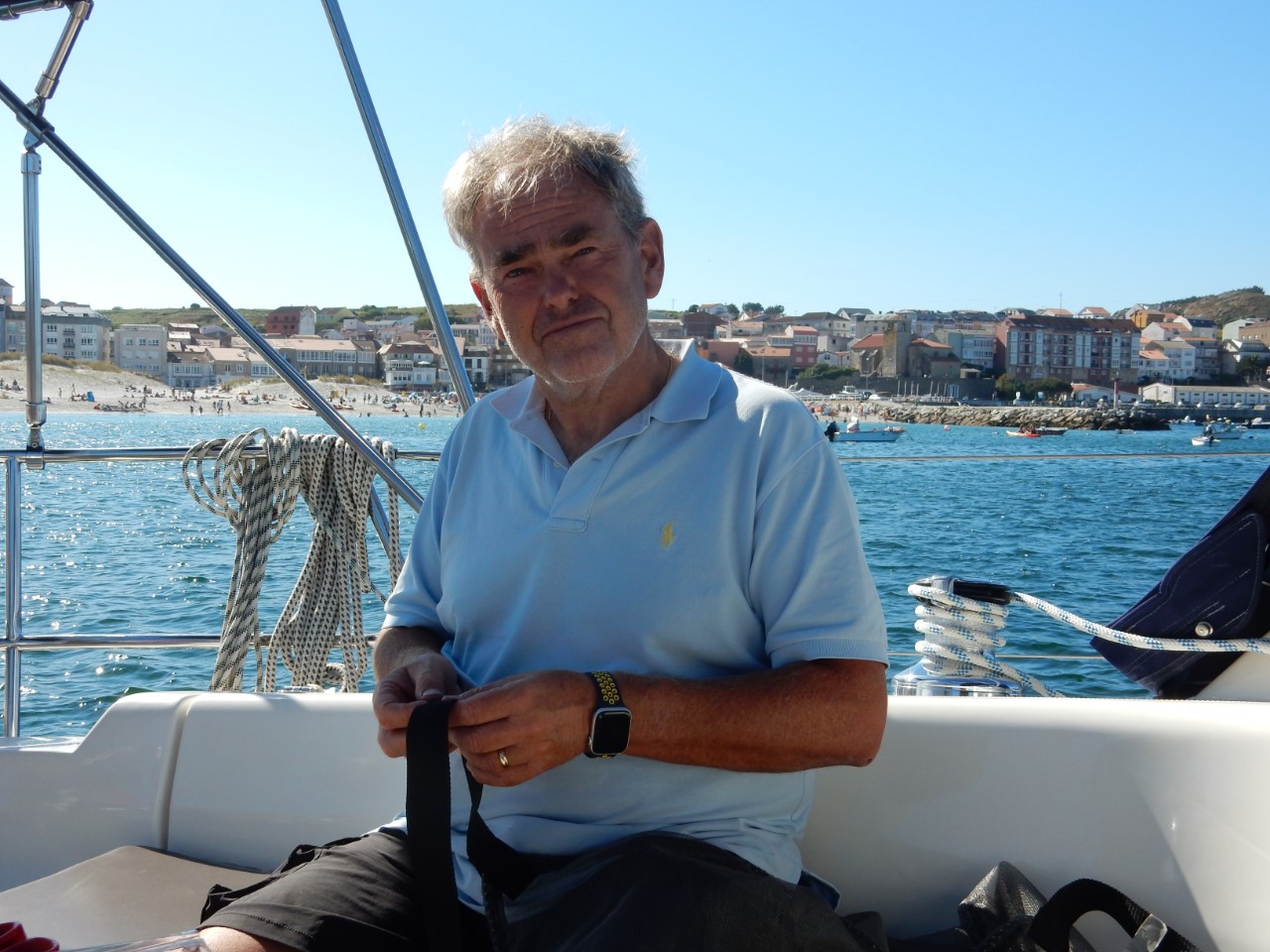 We vertrokken uit een mistig La Coruña. We hadden best nog aardig zicht, maar dat veranderde snel eenmaal buitengaats. We hadden toen nog maar een zicht van ongeveer 20 meter rondom de Just. Al snel klaarde het op door een sterk zonnetje. Het enige jammere was, dat we geen mooie drone opname konden maken van de vuurtoren Torre de Hercules, die was niet te zien. De mist bracht mee dat het windstil was en een vlakke zee. Zo weinig wind dat de zee olieachtig glanst. De motor draaide z’n toeren. Ongeveer 10 mijl van La Coruña hoorden we een harde piep. Op het display sprong het lampje van de koelwatertemperatuur op rood. Snel deden we de motor uit en ging ik de oorzaak zoeken. Daniel probeerde met weinig/geen wind te zeilen, dus we dobberden een beetje rond. In eerste instantie dacht ik, het is de impeller. Dus heb ik die vervangen. Geen resultaat, er kwam geen koelwater uit de uitlaat. Toen maar het wierfilter schoongemaakt, ook dat was niet de oplossing. Wat is het dan? Iets voor de waterinlaat? Dus alle slangen doorgeblazen, ook dat hielp niet. Ondertussen hebben we de koers verlegd, terug naar La Coruña. Tijdens het doorblazen merkte ik wel dat het wierfilter valse lucht aanzoog. Vervolgens heb ik de slangen van het wierfilter met een koppelstukje aan elkaar verbonden, en ja hoor, we hadden koelwater. Het wierfilter heb ik gedemonteerd en gekeken wat de oorzaak kon zijn. Ik had nog wat rubber, waaruit ik een ring heb uitgesneden. Na het testen door hard te blazen was het wierfilter luchtdicht. Na alles weer gemonteerd te hebben en getest, werkte alles weer vanouds. We hebben de Just weer gekeerd en weer de oude koers opgepakt. Daniel ging weer vissen en riep ineens: dolfijnen! Iets te groot voor de paravaan en ze zwommen de andere richting uit. Niet veel later dook er een veel grotere groep dolfijnen op. Ongeveer 50 meter van de Just. Ook deze zwommen niet met ons mee, maar we zagen wel heel mooi de vinnen uit het water komen. Nee toch? Ja hoor, ongeveer 10 mijl voor onze bestemming weer een piep en weer een koelwateralarm. De motor deden we uit, de fok hebben we uitgeboomd en het ging zachtjes dobberend naar ons ankerplekje. De motor hebben we laten afkoelen en hebben we alleen nog even gebruikt tijdens het ankeren. We liggen nu in een mooie baai bij Laxe achter de strekdam direct voor een groot zandstrand. Op deze mooie zondag zijn er veel badgasten. Er zijn subboards, kajaks en jetski’s. Marianne heeft een zondagwaardige maaltijd bereid uit de voorraadbank. Confit de Canard, gebakken aardappels, sperziebonen en gebakken ui met champignons. Tegen de avond loopt het strand leeg en is het stil om ons heen. We horen de meeuwen en zien de zon zakken. Morgen kijken we wel naar de nieuwe oorzaak van het koelwater probleem. Tijd om van het uitzicht te genieten.