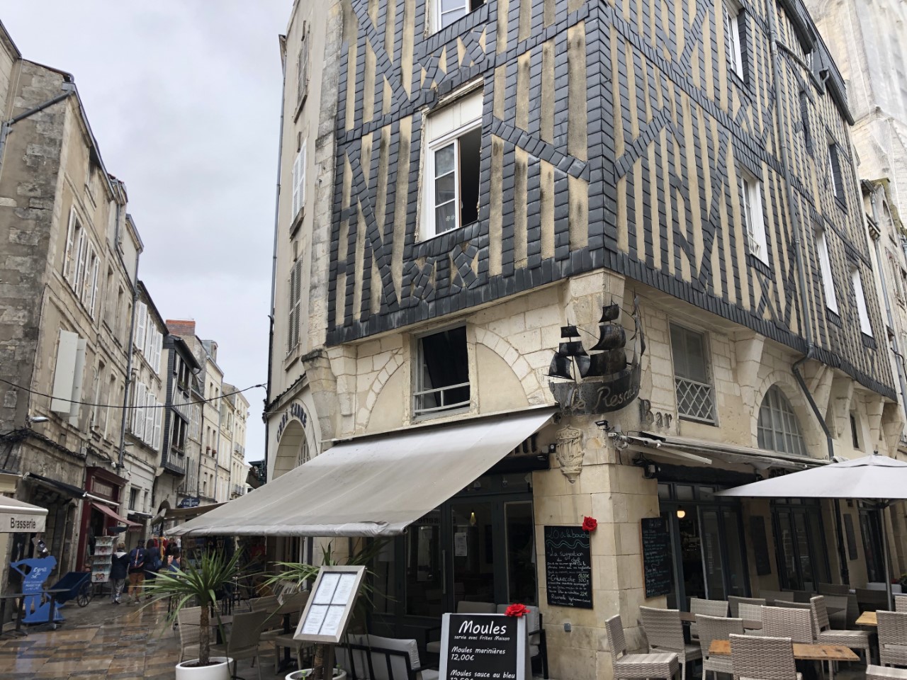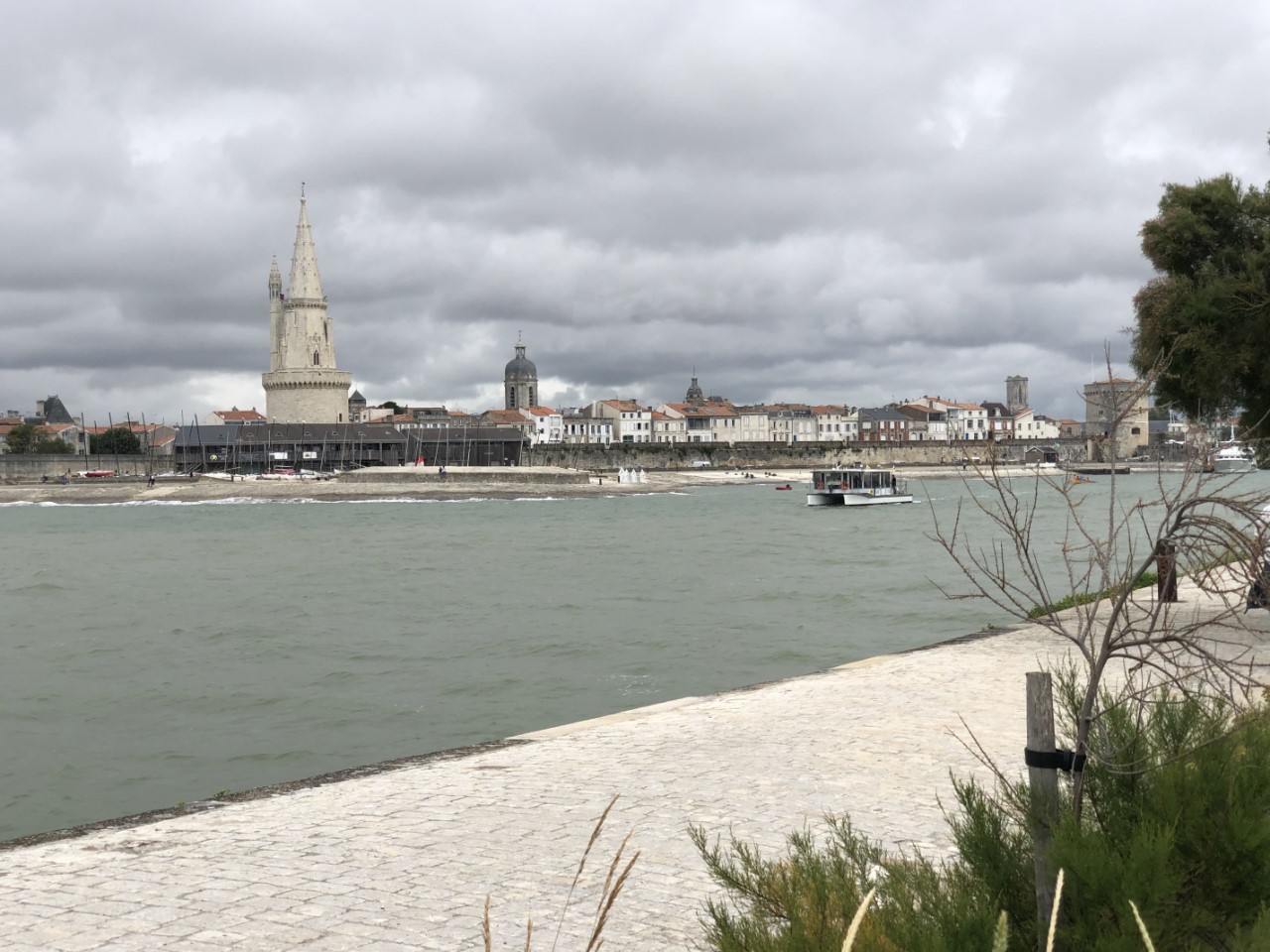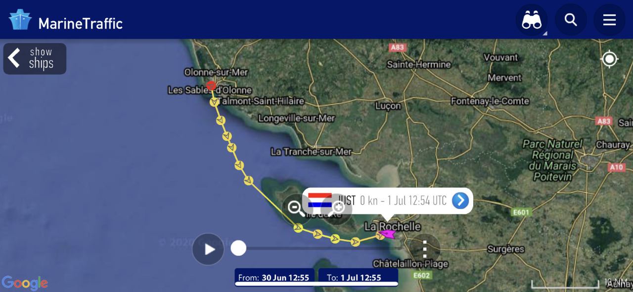 Vandaag eens vroeg op. Om 05:30 uur ging het wekkertje. We willen voor 06:00 uur uitvaren. We waren weer eens de enigen, die zo gek zijn. Maar voor het tij is dit toch de gunstigste tijd. Even voorbij de havenhoofden hebben we de zeilen gezet en al gelijk zeilden we met ruim 5 knopen. Met wat trimmen en de juiste koers werd het al snel ruim 6 knopen. Heel de tocht zijn we daar niet ondergekomen. De stuurautomaat deed z’n werk en ik pakte m’n e-boekje en de crew ging nog even onderuit. Rond 09:00 uur was iedereen weer paraat en maakten we een ontbijtje. We hadden zo’n mooie snelheid, dat ik opperde gelijk door te kunnen naar Spanje, maar daar was weinig animo voor. Ook bij mij, want La Rochelle wil ik toch niet overslaan. De zeiltocht hebben we in een recordtijd afgelegd en we waren ruim één uur eerder dan de planning in de haven. Ook Marianne was blij want de zee was vrijwel vlak ondanks de wind. Qua zeilen was het een topdag. Het weer is grijs, bewolkt en heel af en toe miezerregen. Deze grijze luchten zien we al dagenlang. Na een korte siësta zijn we naar de oude haven gewandeld. Er staan twee mooie karakteristieke torens en er zijn veel leuke straatjes. We hebben een rondje om de haven gemaakt. De boten liggen daar gezellig en er zijn heel wat terrasjes rondom de haven. We blijven toch maar liggen in de grote Port des Minimes. We liggen er prettig. We zijn nog wat winkelstraatjes ingelopen en met het pontje naar de overkant teruggevaren. De haven is enorm groot, er liggen zo’n 5.000 boten en je ziet een heel woud met masten. Al met al was het zo toch een wandeling van 3 uur, mede omdat we de hele haven rond moesten. Marianne begon aan de maaltijd en met hulp van Daniel heb ik geprobeerd om het ventiel van de rubberboot te maken, nog een klus van vorige jaar. Of het gelukt is zien we morgen wel. Onder de vloerluiken is het aardig droog en kunnen we na het volgende tochtje daar wat spullen onder verstouwen. Het water onder de vloerluiken is gekomen van een kapotte sifon in de badkamer. We hadden de kraan laten lopen om de watertanks wat door te spoelen. Dit stroomde dus onder de wastafel in het kastje en zo stroomt dat onder de vloerluiken. Maar gelukkig is al het water nu op gedweild of verdampt. Morgen gaan we uitgebreid passagieren in La Rochelle.