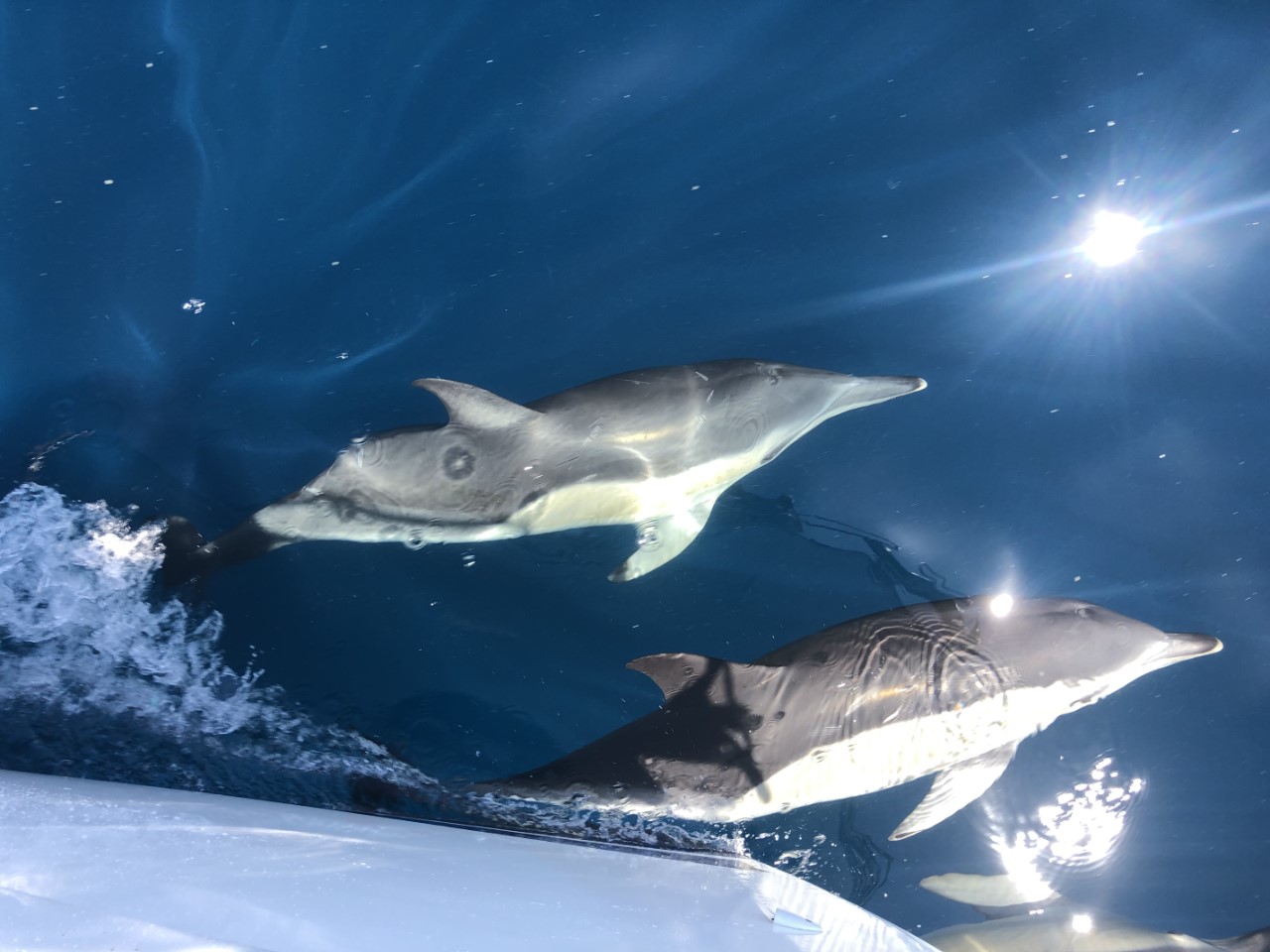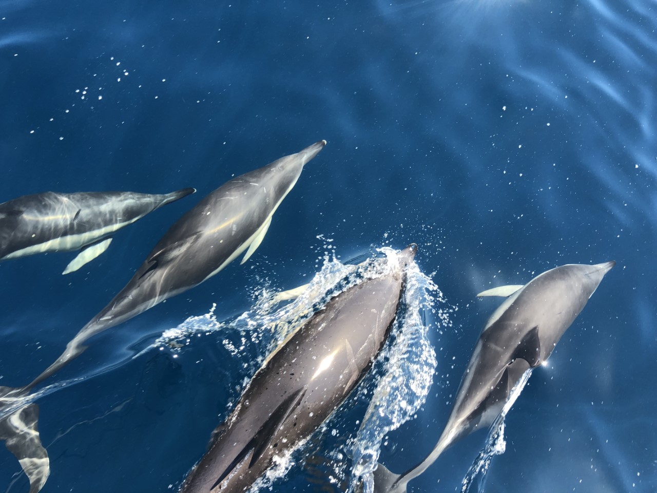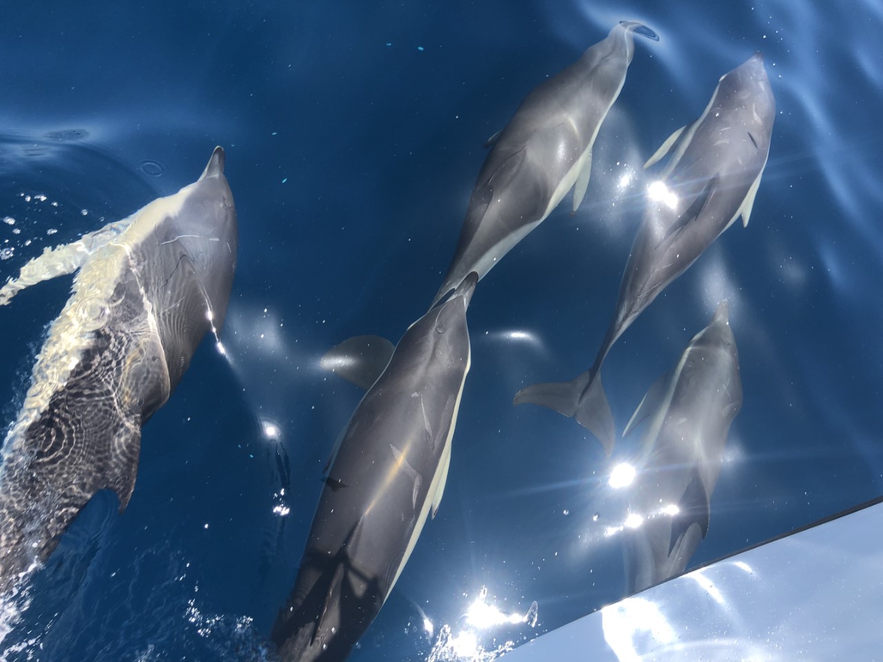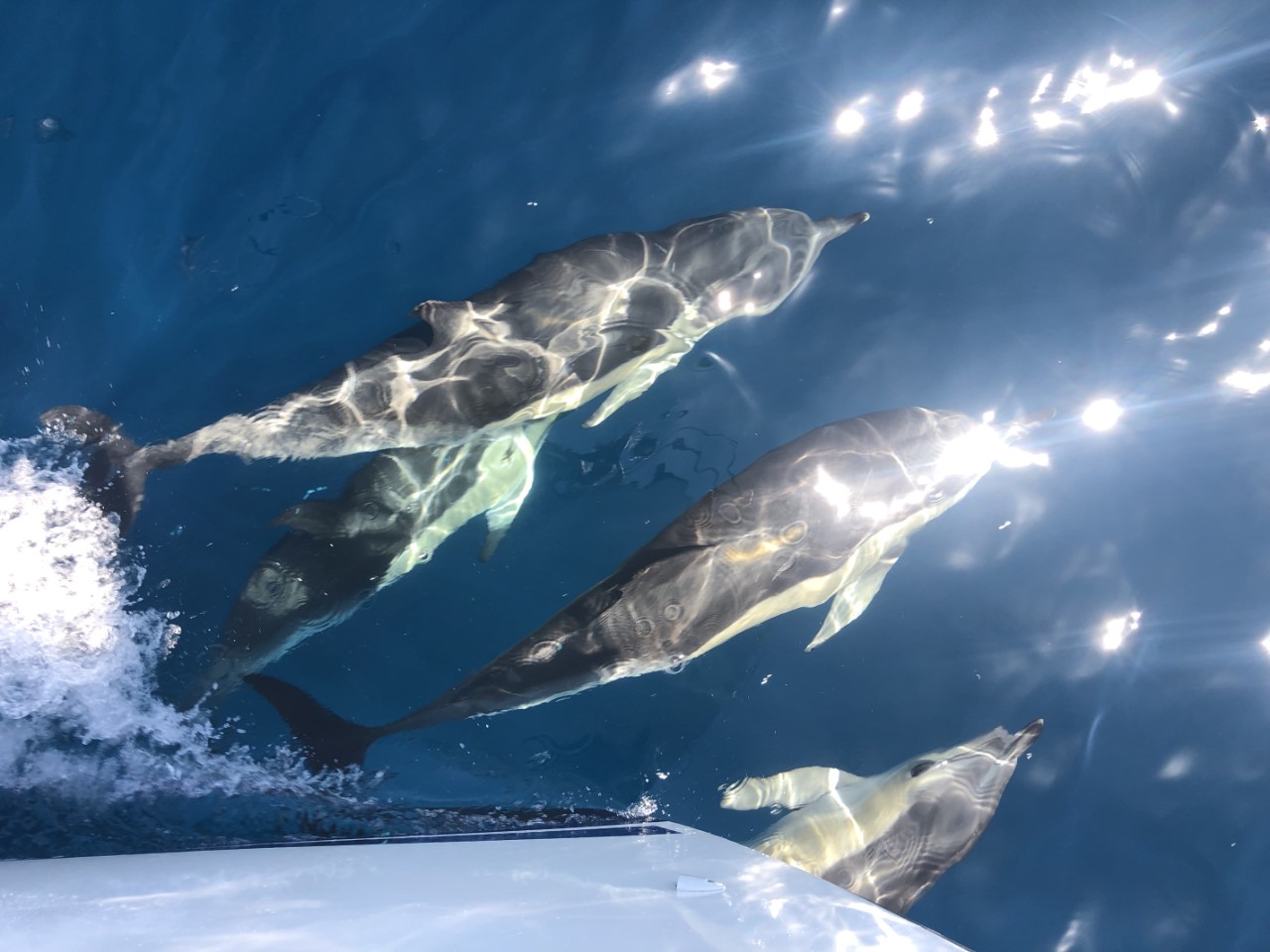 Een uurtje voor de haven varen we door een groep dolfijnen, die gezellig een dik kwartier de Just als speelkameraadje zien. Door het glasheldere water hebben wij volop genoten van ons eigen dolfinarium rond de Just. Het blijft een ongelofelijk mooi gezicht.