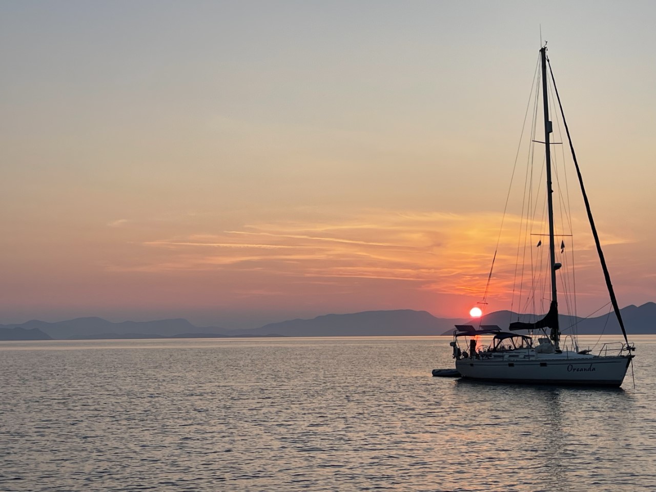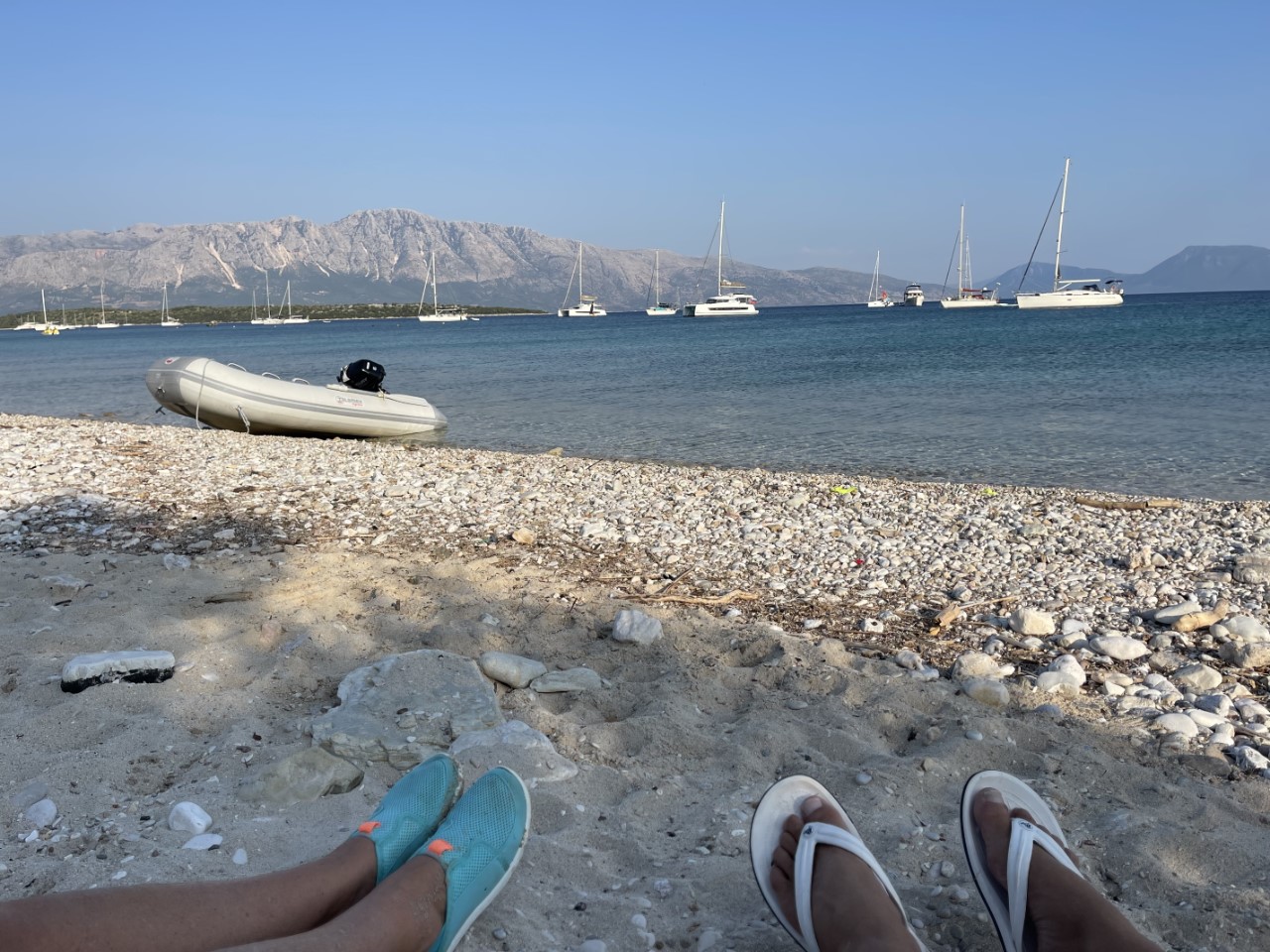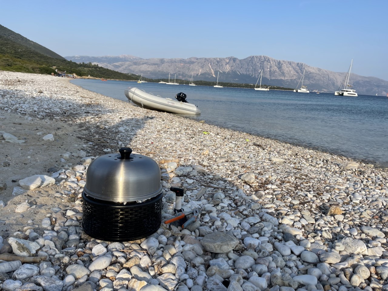 We vinden de baai bij Varka de beste optie. Het is wel een heel stuk noordelijker, maar er is een strand. Dat is een moetje, want we willen op het strand BBQ-en. De zee is spiegelglad en we pruttelen rustig langs de verschillende eilandjes.