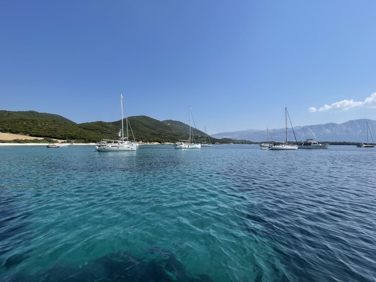 Aangekomen is het op het eerste gezicht erg druk. We vinden wel een plekje, maar ons anker ligt in het zeegras. Een uurtje later vertrekt er een zeilbootje iets achter ons, waar een riante zandplaat is. Wij halen snel ons anker op en verplaatsen de Just een tiental meters. We liggen nu dichter bij het strand op vijf meter diepte. Met mijn snorkel ga ik het water in en controleer het anker, die mooi is ingegraven.