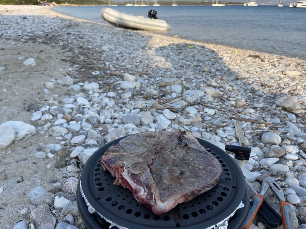 Tegen 17:00 uur beginnen we met de voorbereidingen voor de strand-BBQ. Een uurtje later gaat het eerste stukje vlees op de BBQ. We kijken lekker languit zittend op de baai, waar nog bootjes vertrekken en aankomen. We genieten van een drankje, een lamsvleesspies en een meer dan een kilo grote T-Bone, heerlijk.