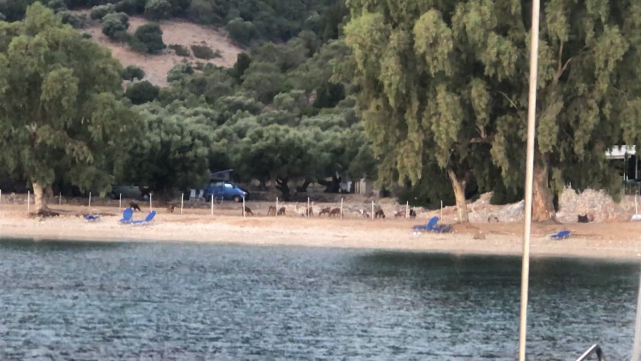 Marianne springt vanmorgen haar bed uit. Niet van een kraaiende haan, maar ze hoort belletjes. Een hele kudde geitjes loopt bij zonsopkomst over het strand. We zijn toch uit bed en dekken dan maar de tafel voor ons ontbijtje. Zodoende halen we vroeg ons anker op voor een beter ankerplekje, want we verwachten morgen al in de ochtend flinke wind, regen en bliksem.