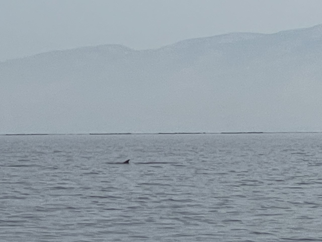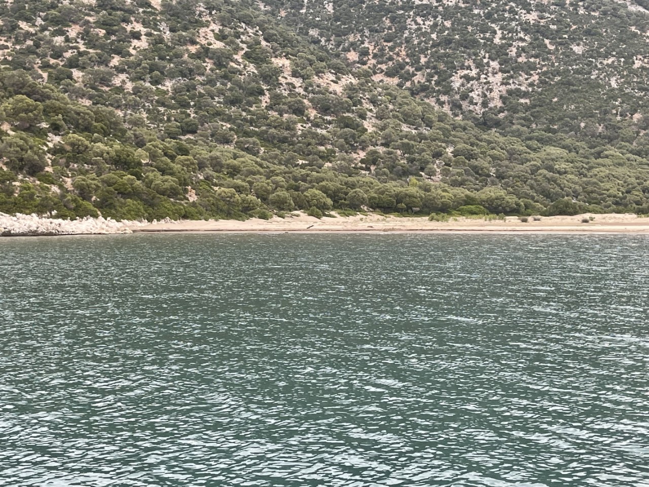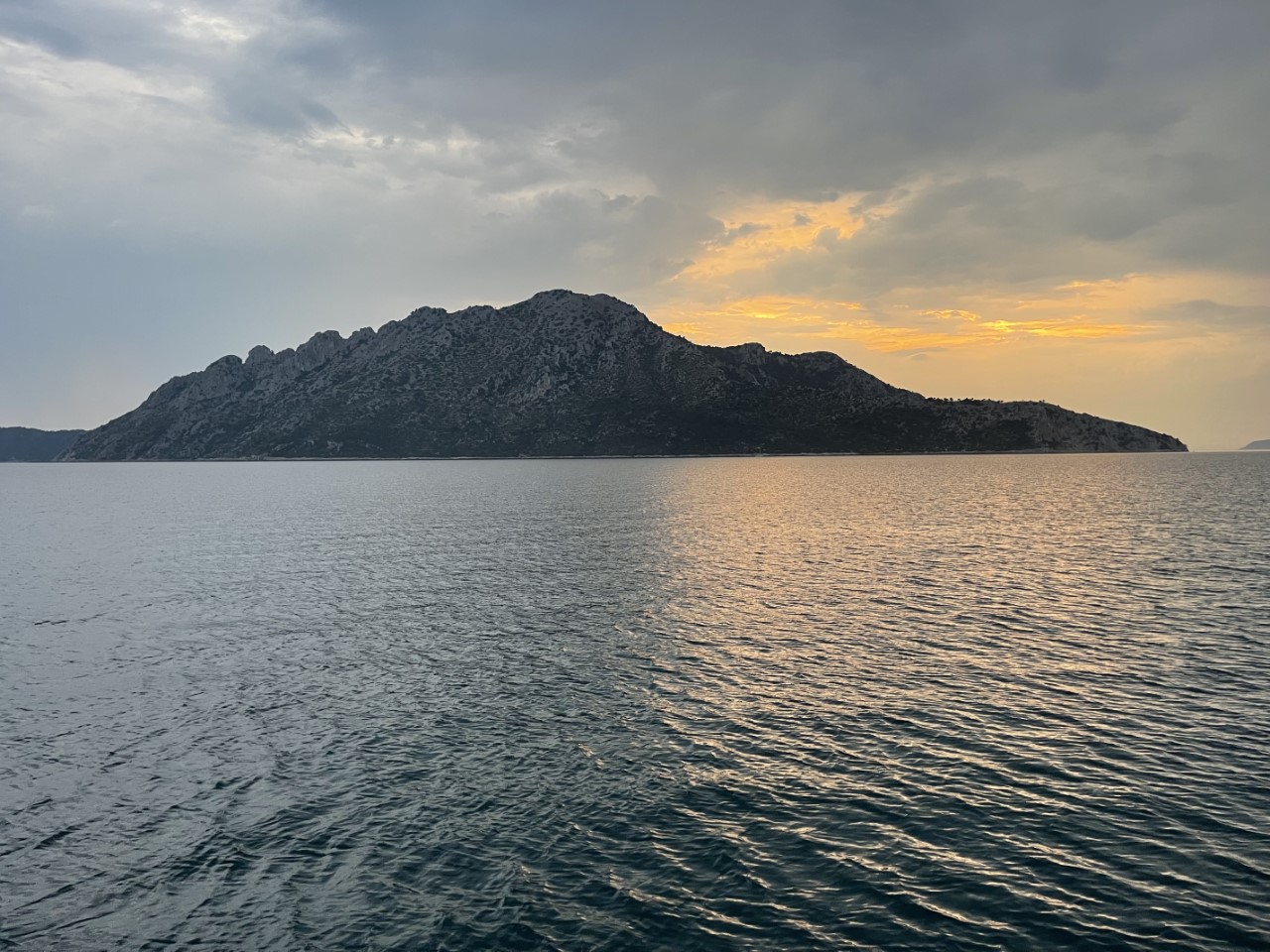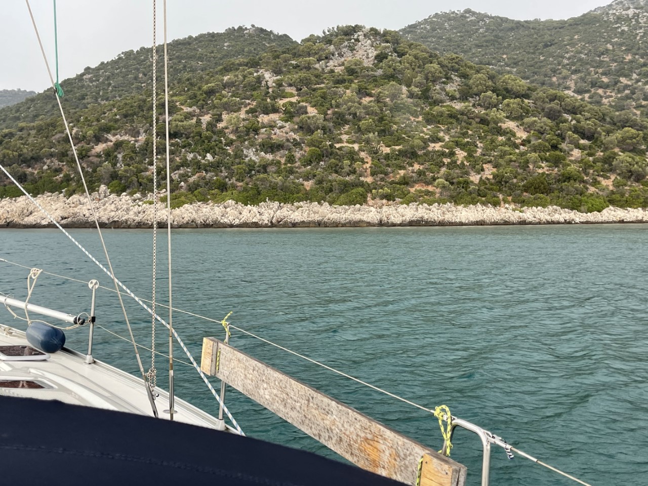 Met het grootzeil uitgedraaid varen we deze keer niet vlak langs de kustlijn. We moeten daar ruim vandaan blijven in verband met de diepte. Dat is lang geleden, we zien een grote groep dolfijnen. Ze zwemmen voor de Just langs. Het zijn Griekse dolfijnen en minder actief en hebben geen zin om even te spelen voor de boeggolf voor de Just.