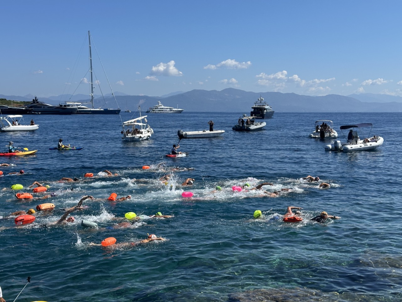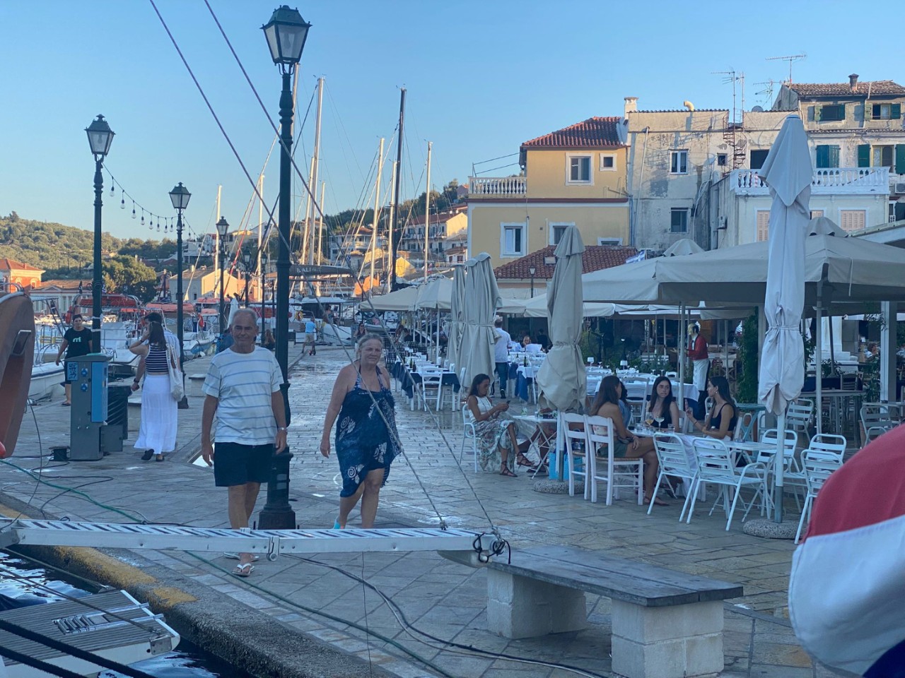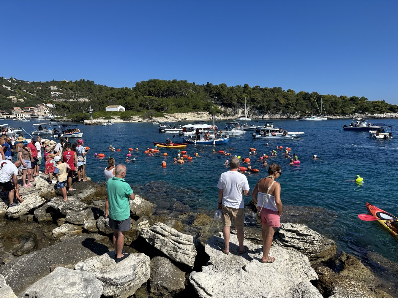 We maken direct een wandeling door het gezellige plaatsje en maken ook de start van een zwemwedstrijd mee. De zwemmers gaan van Paxos naar Anti Paxos, van horen zeggen doen ze daar 2 uur over. De rest van de middag besteden we aan luieren en naar cruisebootjes kijken. Ze zetten honderden toeristen af, die een aantal uur in Gaios gaan rondbanjeren. Bij het vertrek van de cruisebootjes loopt de optocht weer langs de Just om op tijd terug te zijn.