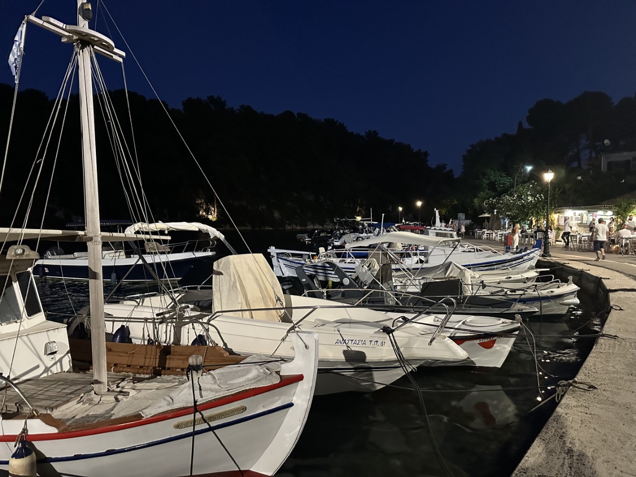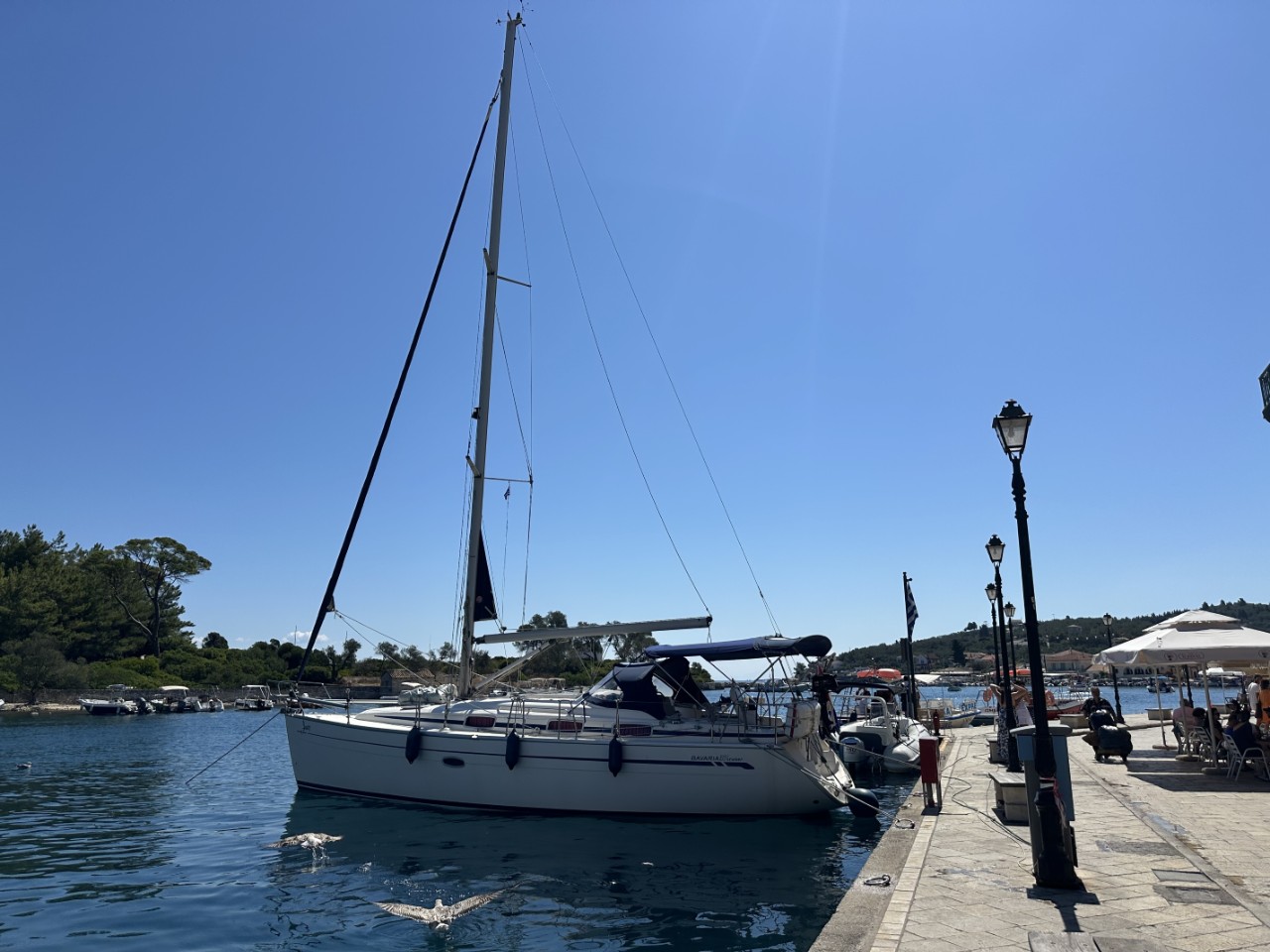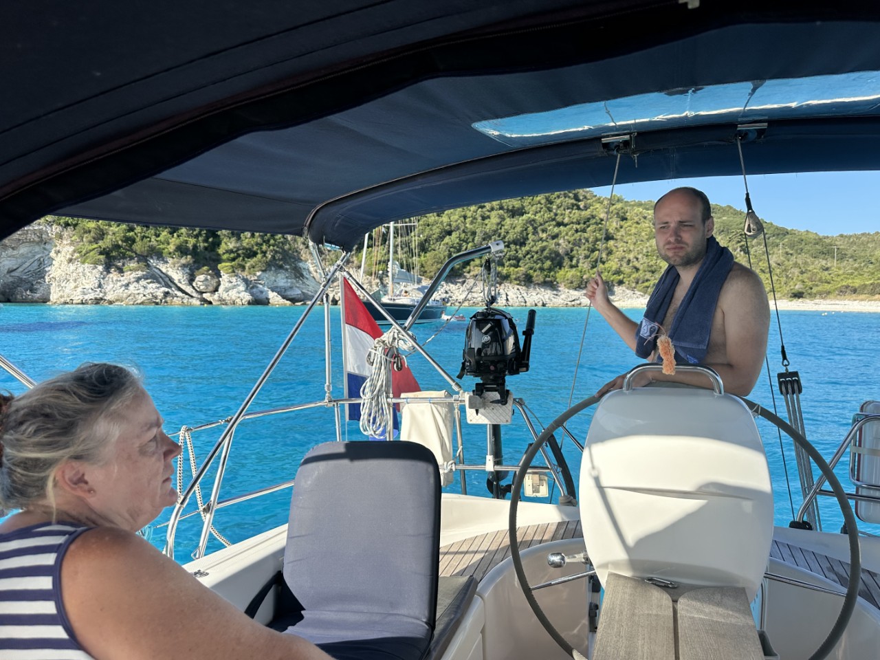 Voor het ontbijt liggen we al in het heerlijk warme water. We douchen even lekker af en nemen ons zondagse ontbijtje. Nog voor 10:00 uur vertrekken we van ons ankerplekje voor een kort tochtje naar het volgende eiland Paxos, waar we een plekje aan de kade van het plaatsje Gaios willen. Het binnenvaren naar de kade is heel mooi en gezellig met de bedrijvigheid op de kade. We hebben keus uit een drietal plekjes, waarvan de beste kiezen.