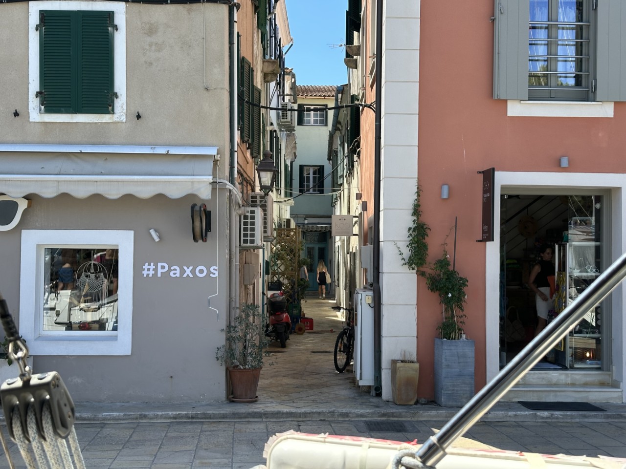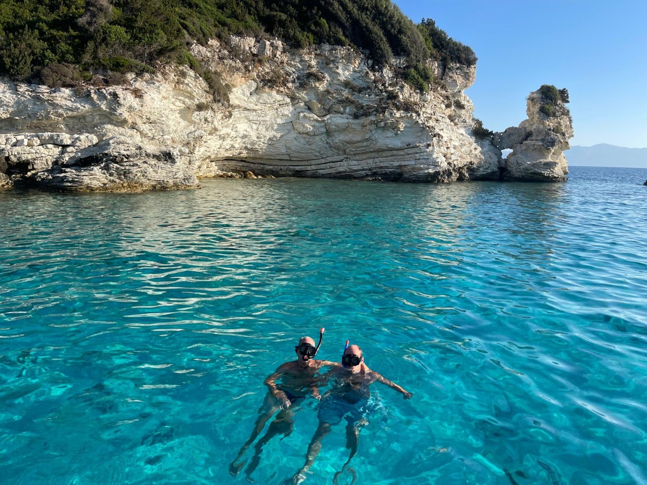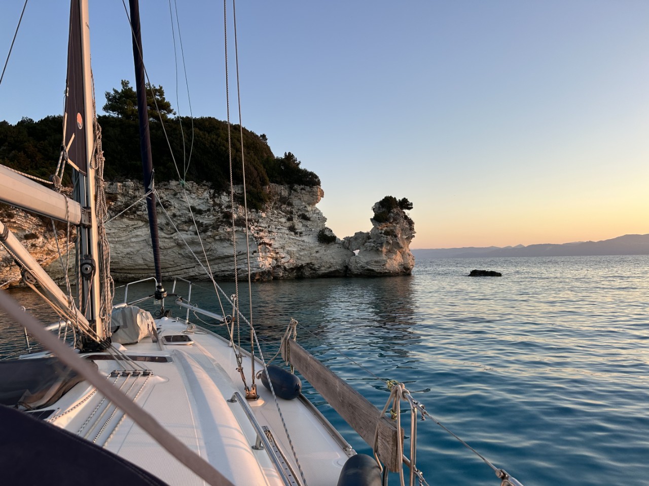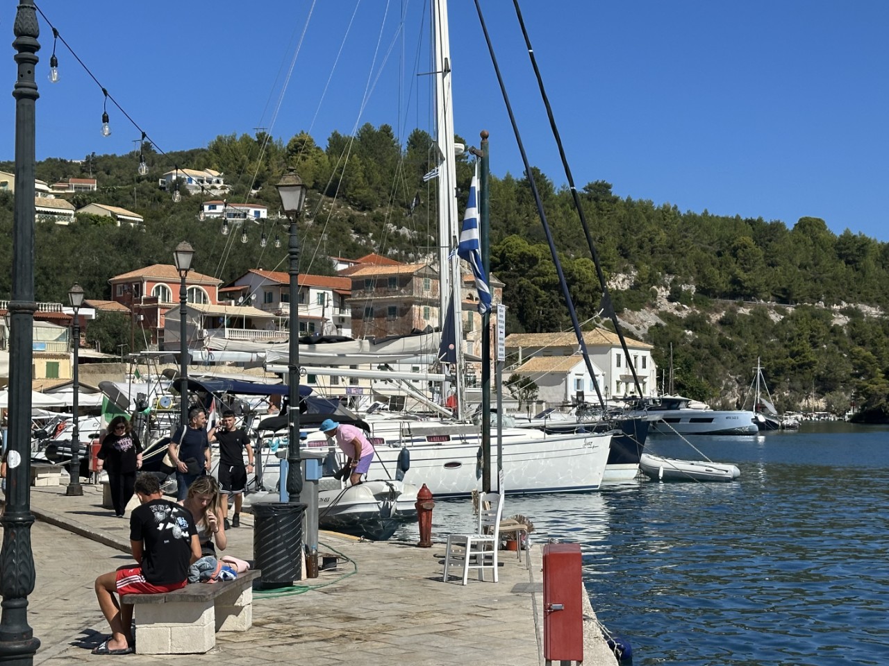 Voor het ontbijt liggen we al in het heerlijk warme water. We douchen even lekker af en nemen ons zondagse ontbijtje. Nog voor 10:00 uur vertrekken we van ons ankerplekje voor een kort tochtje naar het volgende eiland Paxos, waar we een plekje aan de kade van het plaatsje Gaios willen. Het binnenvaren naar de kade is heel mooi en gezellig met de bedrijvigheid op de kade. We hebben keus uit een drietal plekjes, waarvan de beste kiezen.