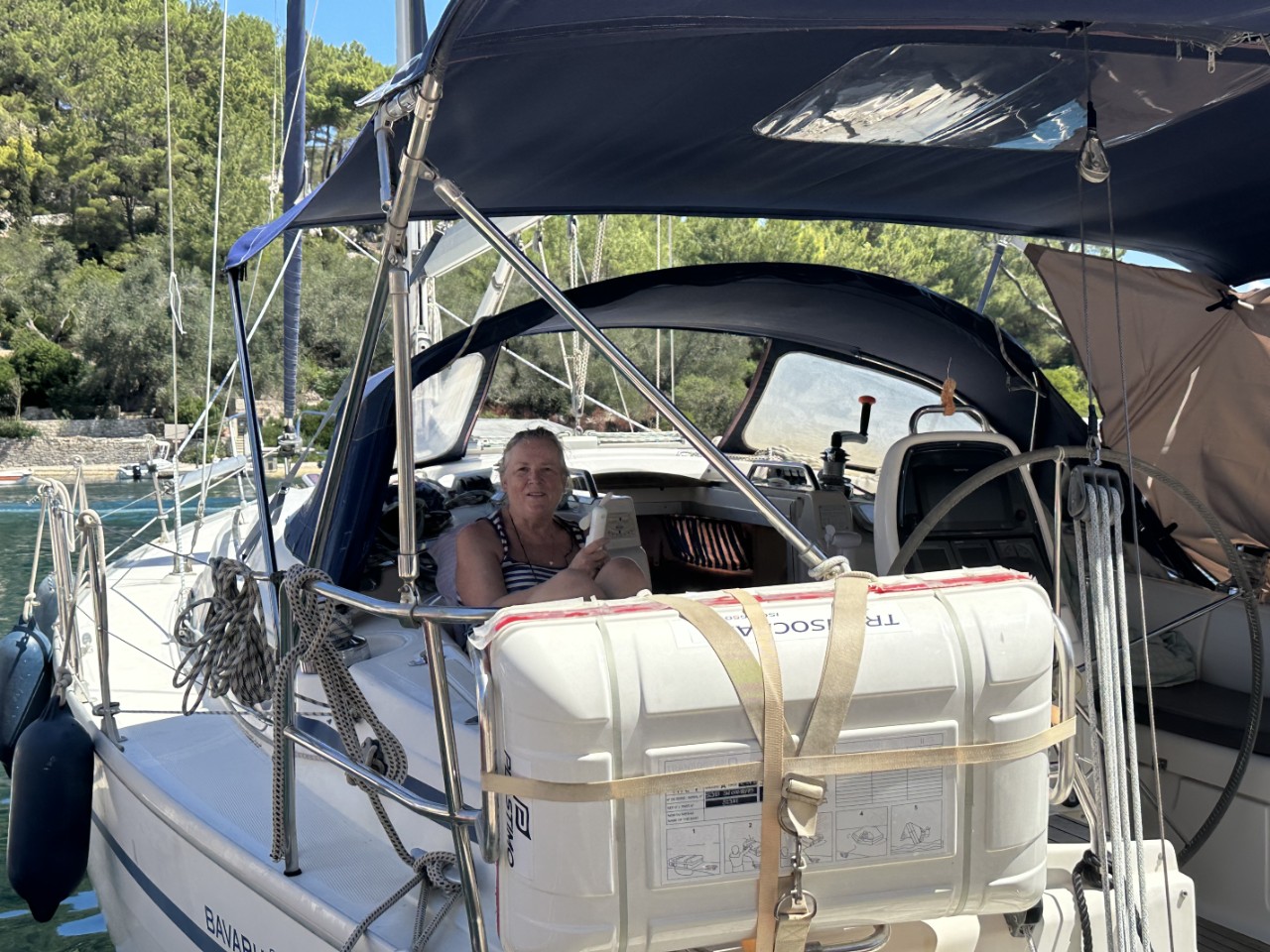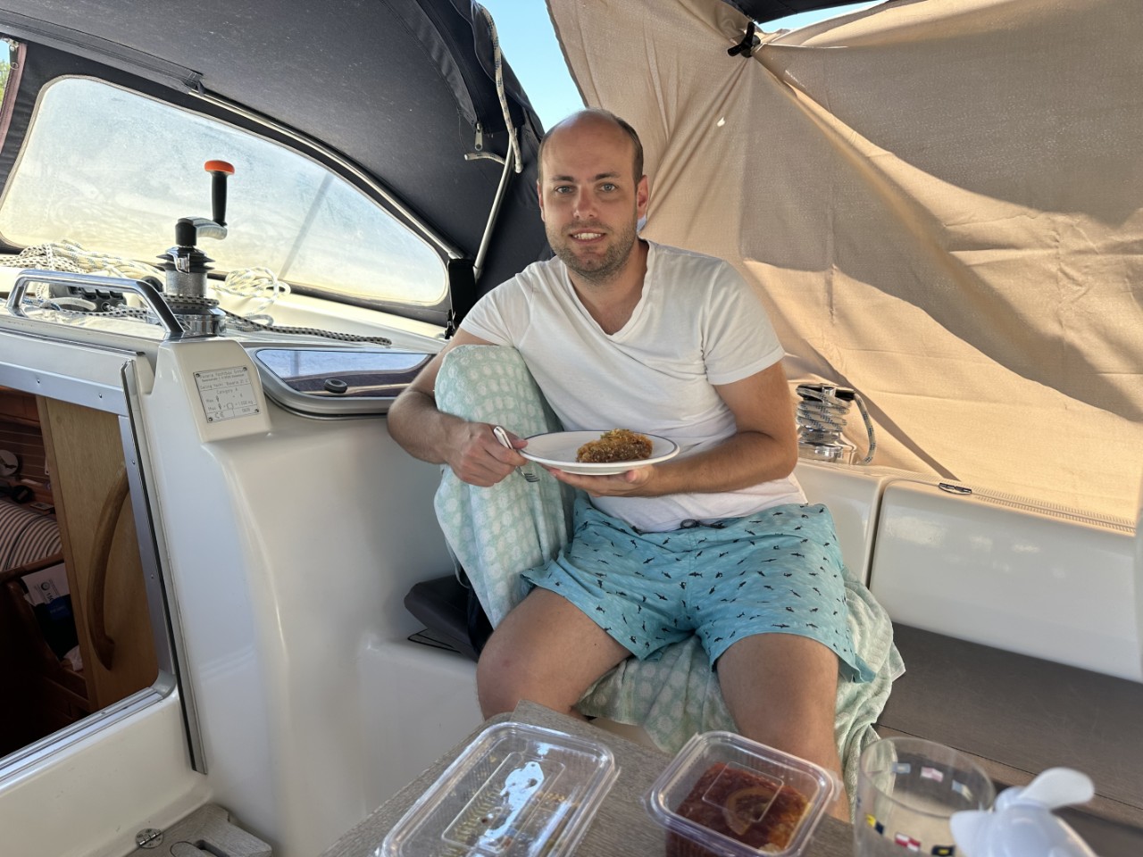In de avond hebben we nog wat lopen slenteren langs de kade om naar mooie bootjes te kijken. Ze variëren van authentieke Griekse vissersbootjes tot superjachten. Eenmaal terug op de Just denken we lekker te kunnen relaxen in het kuipje, maar de buurman besluit om een dikke lange bolknakker op te steken. Die lucht zijn we na een uurtje meer dan zat en we zoeken onze hutten op. Morgen weer een klein tochtje naar de baai van Lakka.