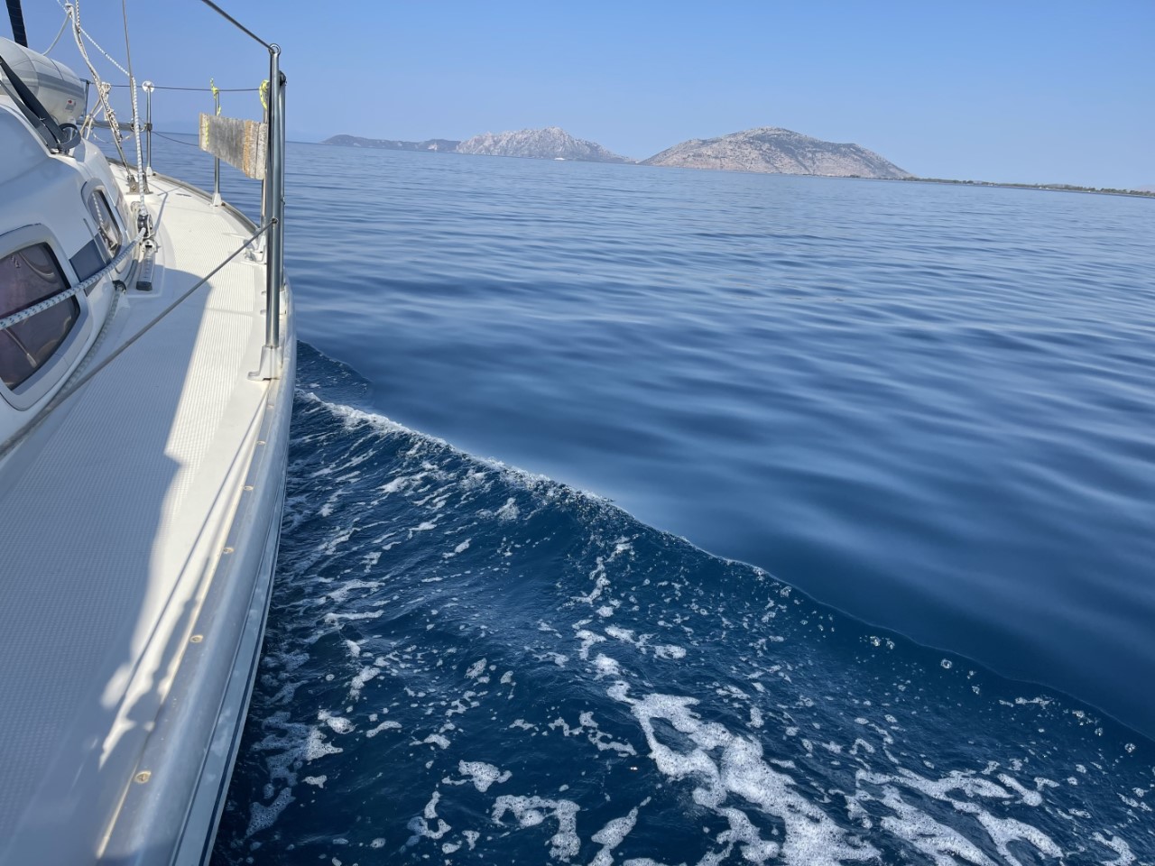 Als we weer op open water zijn, hebben we het grootzeil uitgerold en gaan vlotjes richting Ormos Skrófa North. Als we een haakse bocht naar stuurboord maken en tussen een paar hoge rotsen/bergjes varen, staat er best wat wind bij Ormos Skrófa North. De wind en golven staan er precies in en we vinden dat geen optie om te ankeren. Dan maar naar Ormos Dióni, waar we al eerder hebben geankerd en dat wel bescherming geeft aan deze wind en golven.