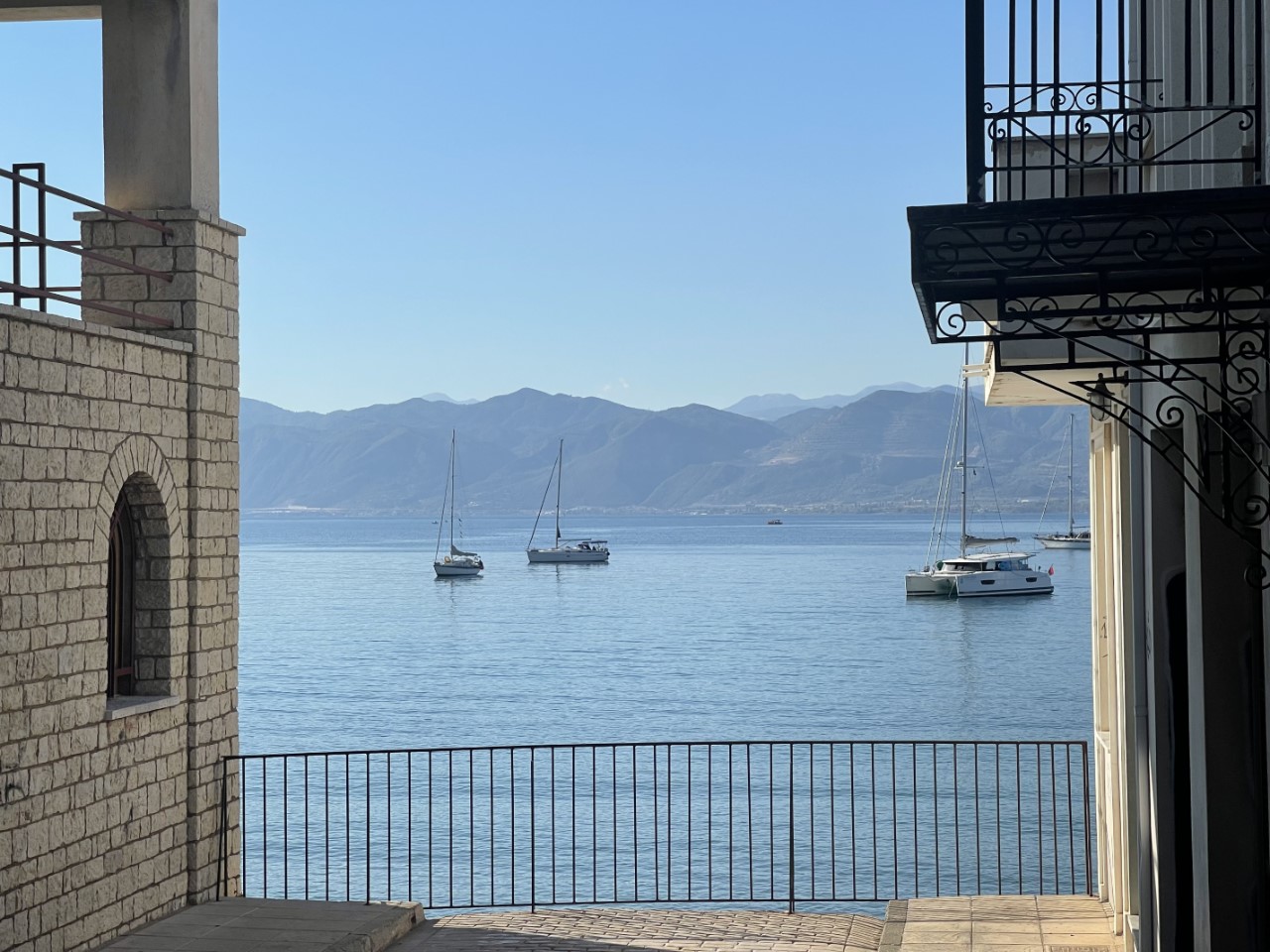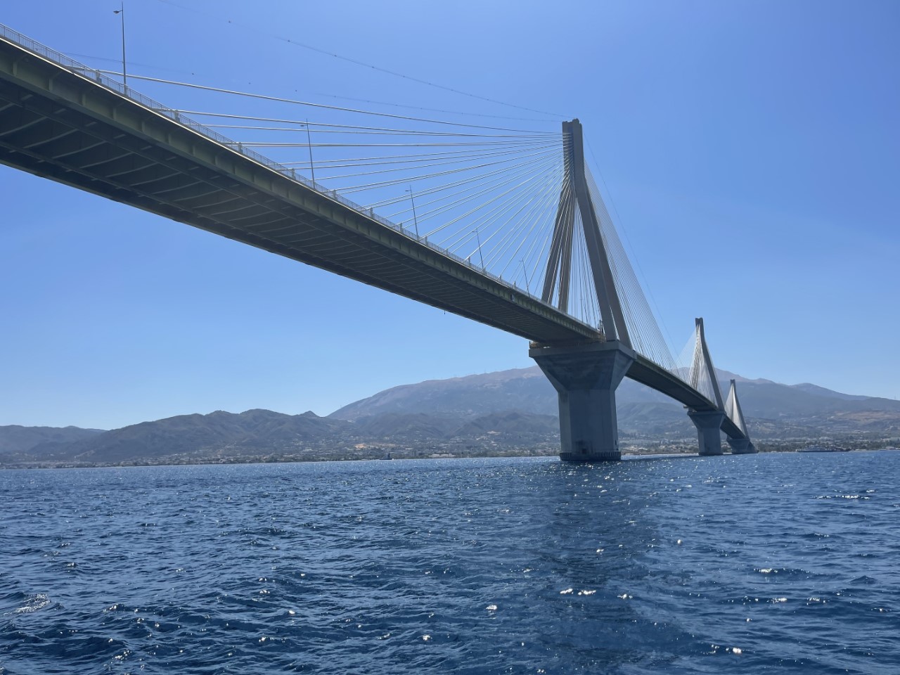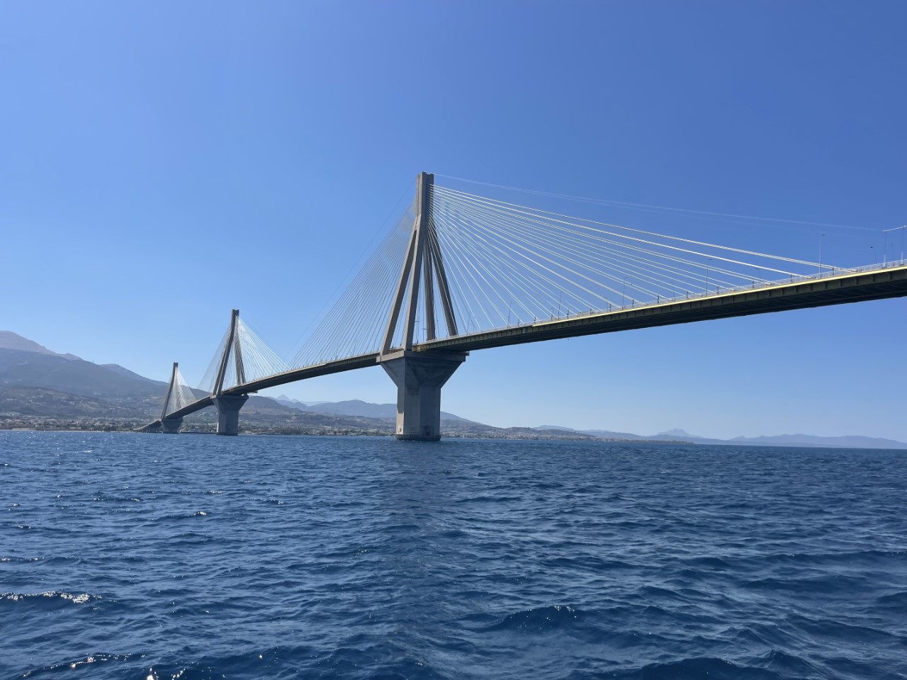 We hebben een heerlijk bezeild koersje. Iets voorbij de grote Rionbrug kiezen we toch om even langs Krioneri te varen. Dit was een van de mogelijkheden. Volgens de Navily-app is het een leuk apart klein plaatsje met een paar aanlegplekjes aan een kade met wat horeca. We inspecteren de boel met de verrekijker en vinden we het toch geen optie. Er is een geweldige, mooie hoge klif aan de oostzijde, maar volgens de waterkaart is er bij de aanlegplaatsen maar 2 tot 2,5 meter diep water. We vinden het toch iets te ondiep. Bovendien is er in de middag oostenwind 20 knopen en we vrezen valwinden.