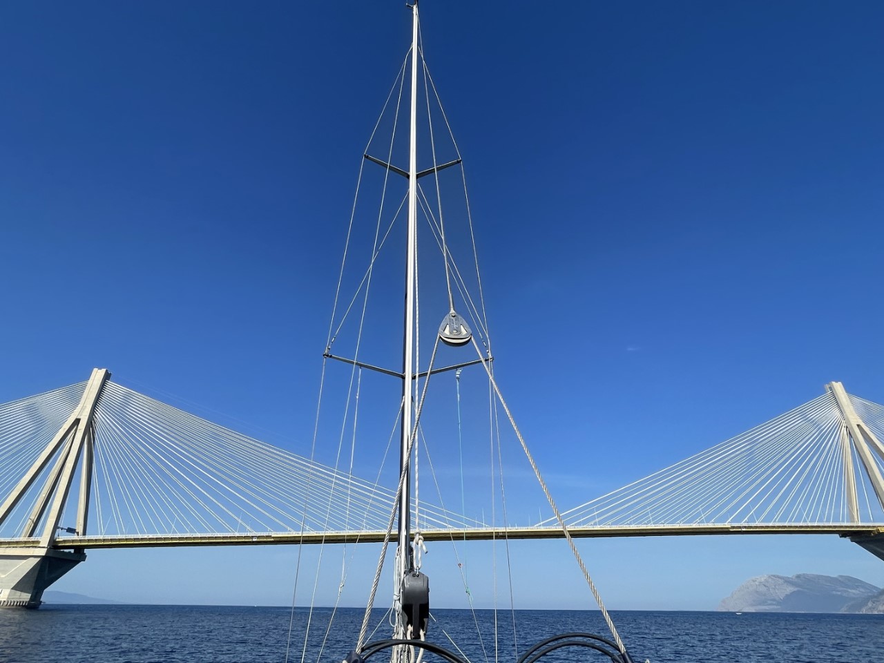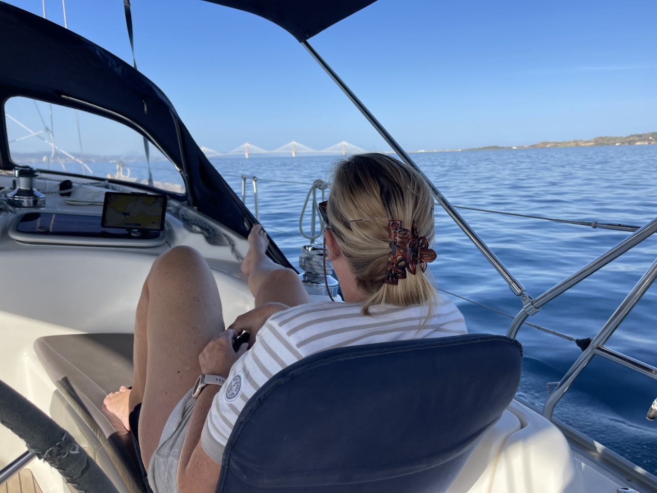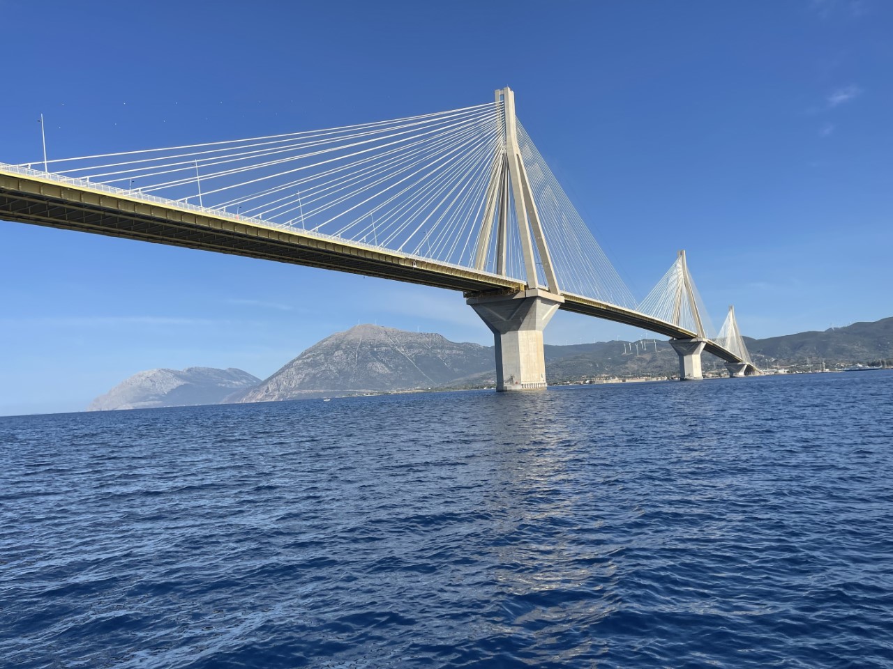Tijdens het Vaderdag-ontbijtje zijn we er nog steeds niet uit wat we gaan doen. Gisteravond laat keken we naar een filmpje van het historische treintje, dat hoog de bergen in rijdt. Marianne vraagt of ik genoeg gezien aan het filmpje of wil ik er echt graag heen. Ik vind, dat het een hoop geregel is, met de ritschema’s van de bus en het treintje die maar 2x per dag gaan en wat moeten we doen op die bergen en nemen we direct het treintje en bus weer terug naar Patras? De beslissing is snel genomen, we gaan niet. Maar wat dan? We besluiten om gewoon bij Patras een kijkje te gaan nemen. Vinden we het wat, dan blijven we en anders varen we door naar Vasiliki. We halen ons anker op en melden ons bij de Rianbrug, dat we onder de brug door willen.
