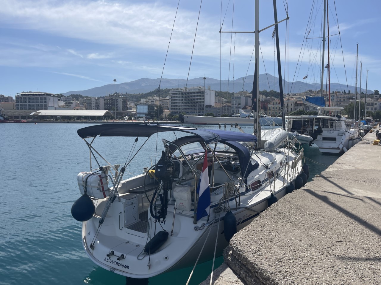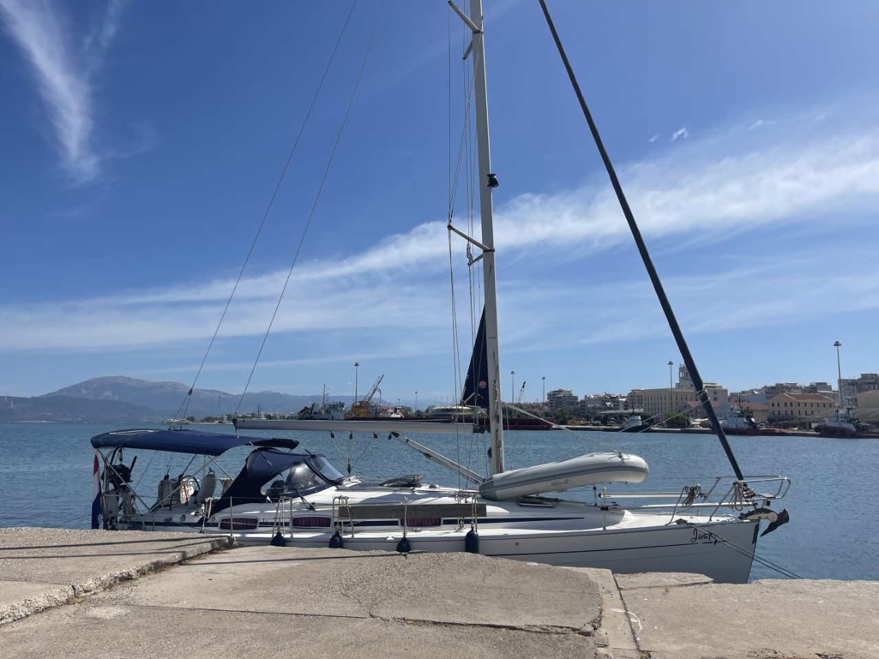 Twee uurtjes later melden we ons bij Patras Traffic dat we een kijkje in de haven willen nemen en als er plek is een nachtje blijven. We krijgen te horen, dat we aan kade 9 mogen aanleggen. We moeten nog wel even melden als we willen blijven. We vinden een prima ligplaatsje aan een kade, waar vroeger grote zeeschepen lagen aangemeerd. Het is een rustig plekje, wellicht omdat het zondag is.