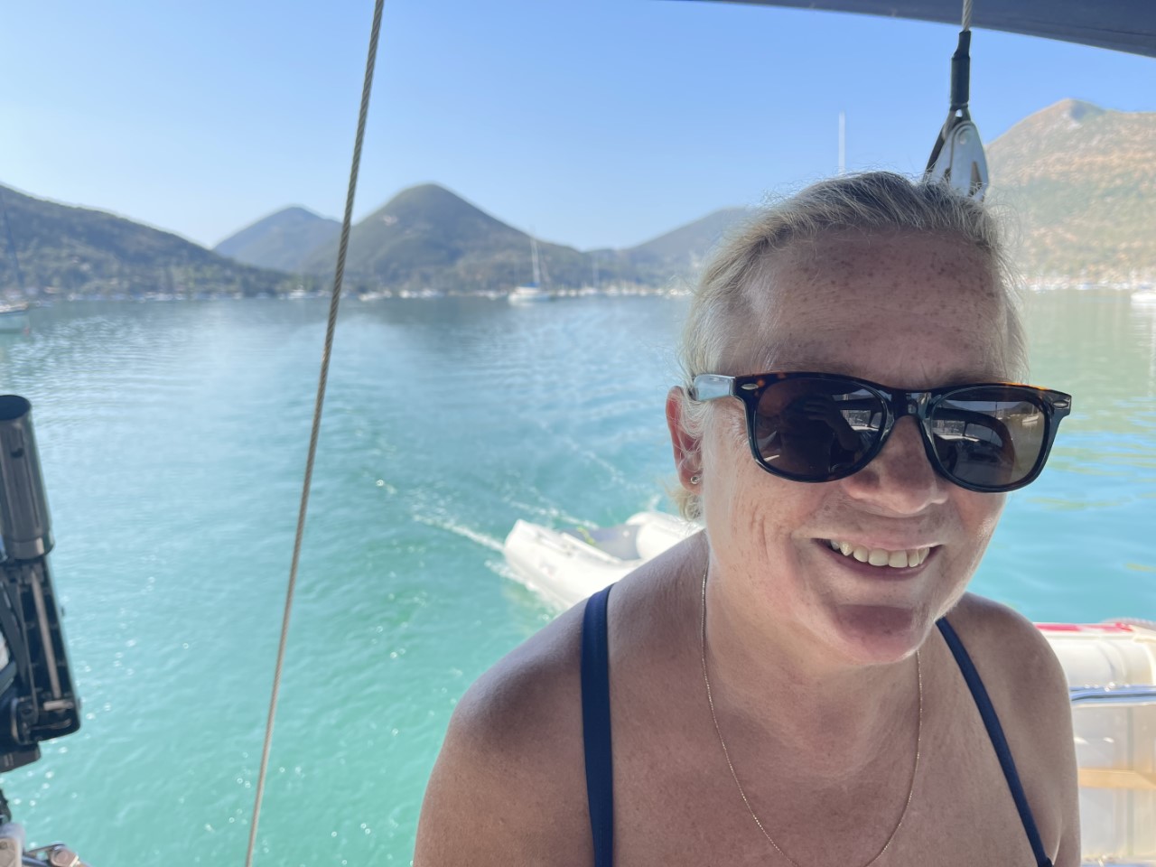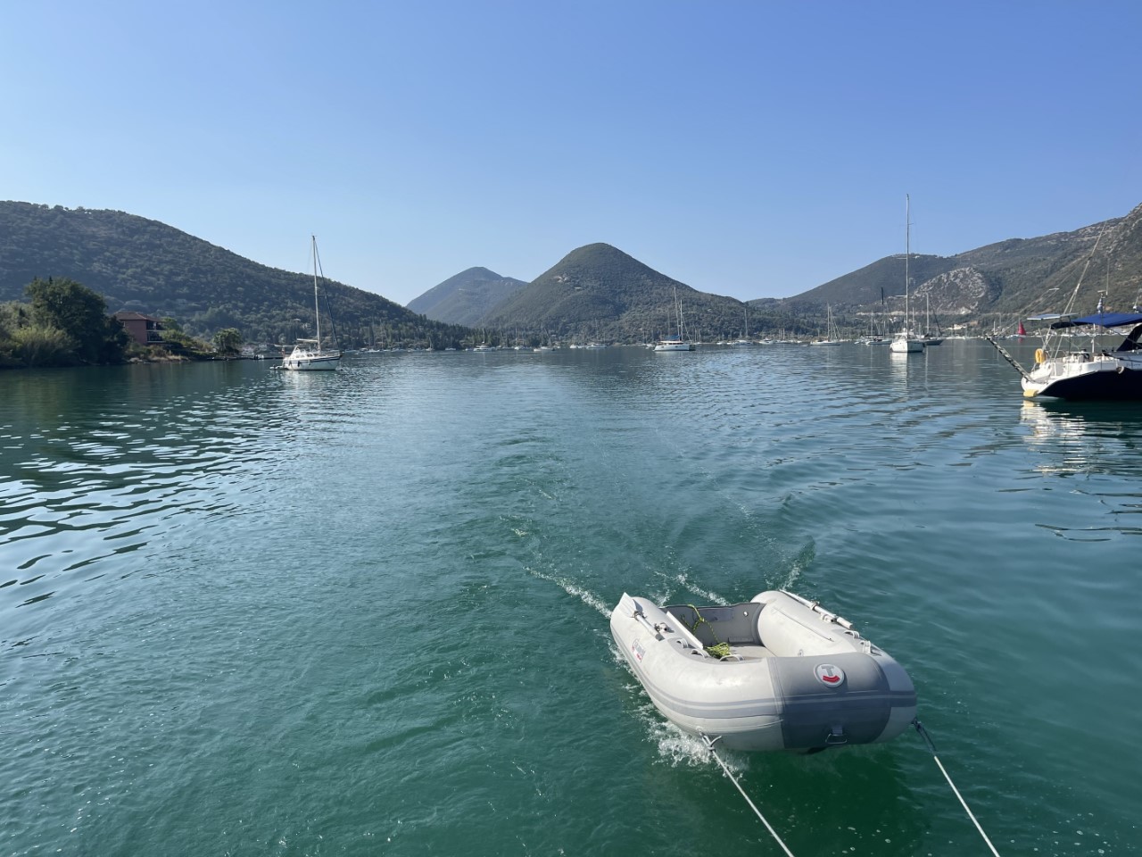 Met het bijbootje ga ik vanmorgen naar de lekkerste bakker van Nydri. Ik ben niet de enige want er staat een aardige rij. Met voldoende brood voor het ontbijt en voor de komende dag kom ik terug op de Just. Na het ontbijt halen we nog even boodschappen. We kennen hier al aardig de weg.
