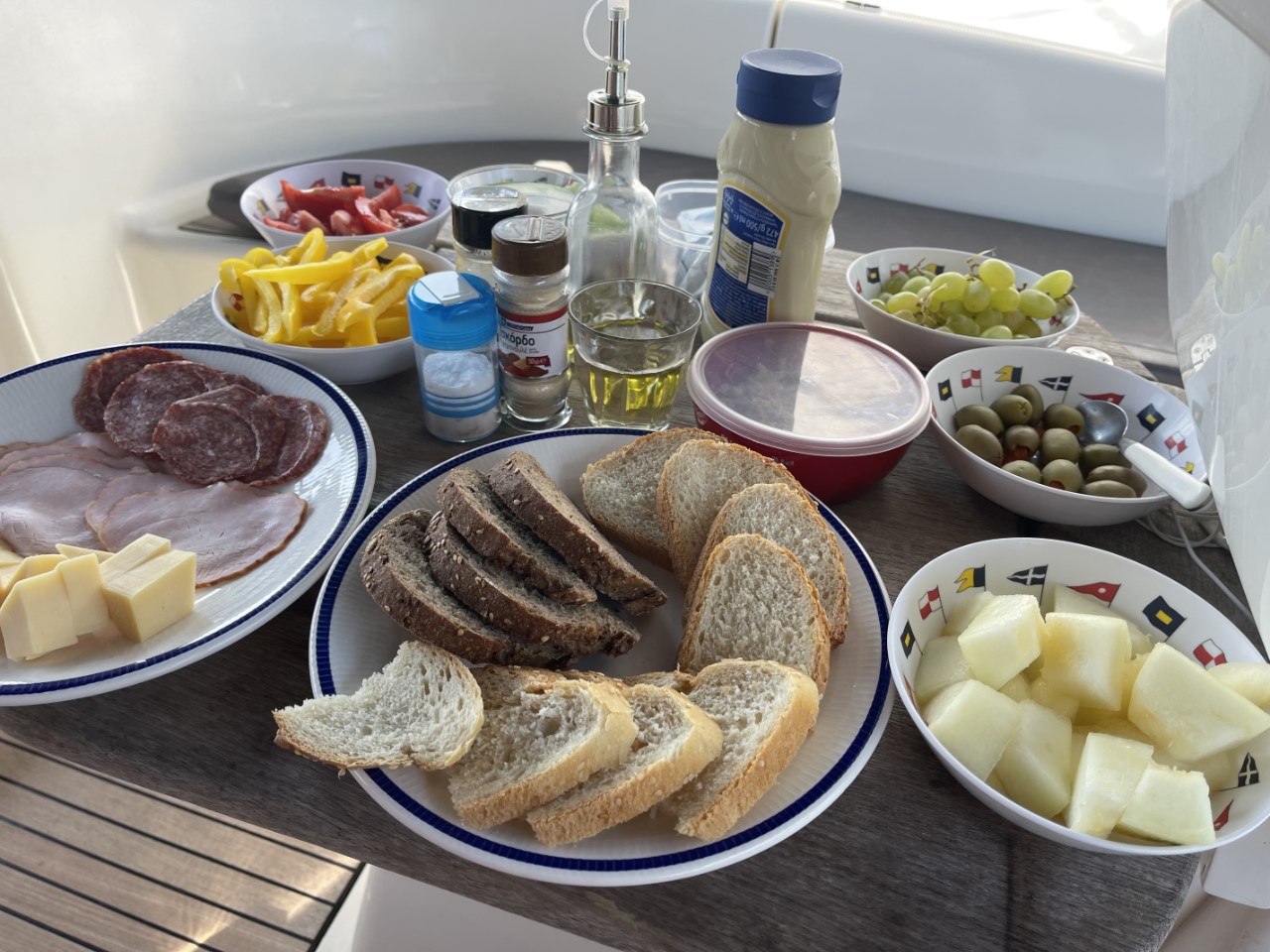 Voor de zaterdag had Marianne een antipasta bedacht met allemaal lekkere hapjes. Wat brood erbij gedaan en een wijntje. Eigenlijk gewoon geen zin om te koken. Naar de kwalificatie van de F1 kijkend begint er toch weer een windje op te steken. Onze schaduwdoeken worden los gerukt uit de knijpers. We verwachten dat de wind weer gaat afnemen, zoals elke dag. Voordat het zonnetje ondergaat zwemmen we nog wat rond de Just.