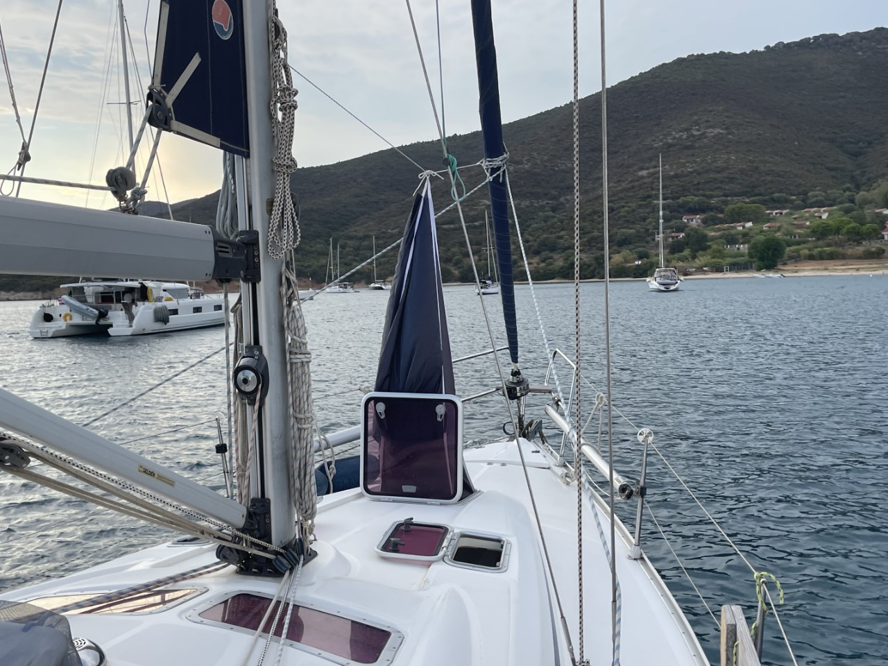 Gisterenavond hing er rond de berg naast de baai een zware donkere lucht en niet veel later kwam er een flinke windhoos. We hebben snel alle luiken moeten sluiten en muggennetjes en windvanger op moeten ruimen. Vervolgens veel bliksemflitsen en 10 minuten wat regen. De regen hield snel op en wat verderop heeft het nog lang gebliksemd. Tegen de avond komt er een vloot kleine motorbootjes langs, die gehuurd worden door dagjesmensen. Als de zon onder is, is het comfortabel stil en merken we zelfs geen kleine golfjes.