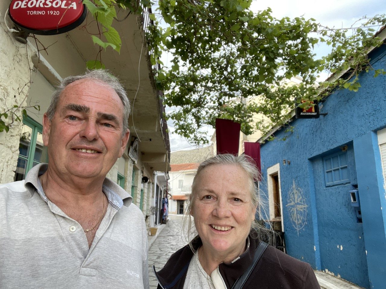 We wandelen bijna gelijk naar de supermarkt voor de nodige proviand. Op een kruispunt als we een heel stuk bergop hebben gelopen, ploffen we neer op een oud Grieks terrasje tussen een paar Zorba de Griek mannetjes. We zitten er gezellig mee te babbelen onder het genot van een Griekse koffie voor Marianne. Ik kies voor veilig en neem een watertje. De oude man spreekt redelijk Engels en vertelt vaak in Nederland te zijn geweest. Hij is gepensioneerd maar had hier aan de haven een restaurant dat Zorba heet. Dat verbaast ons niets. De serveerster babbelt ook mee en blijkt uit Georgië te komen. Een avonturierster die hier een maandje komt werken en dan weer verder reist.