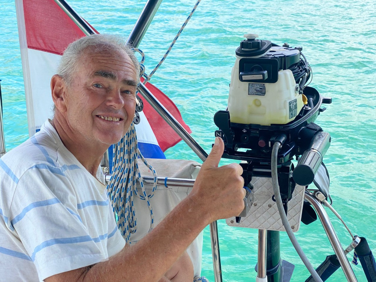 De storm viel reuze mee vannacht. Een klein beetje wind en om 02:30 uur een flinke bui van hooguit een half uurtje. Deze morgen is het een zondag zoals thuis, lekker rustig aan en om 10:00 uur een ontbijtje met gekookte eitjes. Na het ontbijt heb ik de carburateur van de buitenboordmotor van de rubberboot nogmaals ingespoten met schoonmaakmiddel. Ik heb alle pinnetjes en schroefjes weer teruggeplaatst en met wat gepuzzel weer gemonteerd op de buitenboordmotor. Daniel gaf één flinke ruk aan het koordje en het motortje liep als een zonnetje. Weer een klusje geklaard.
