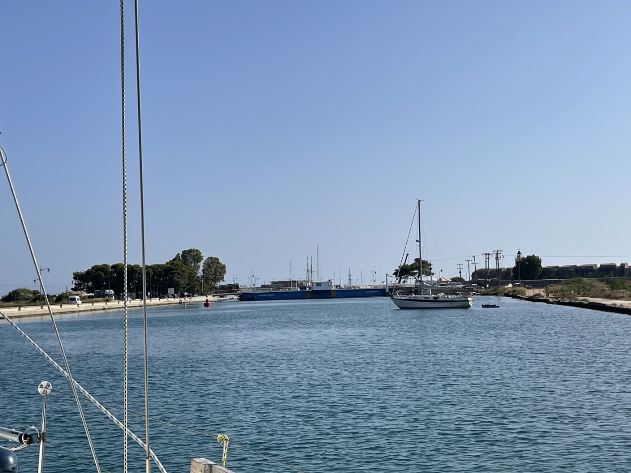 Aangekomen bij de brug ligt er één zeilboot voor anker. Wij hebben een klein half uurtje voor de draaibrug liggen draaien. Uiteindelijk gaan er totaal 10 boten door de draaibrug. Het laatste stukje naar Preveza is er weer eens wind tegen.