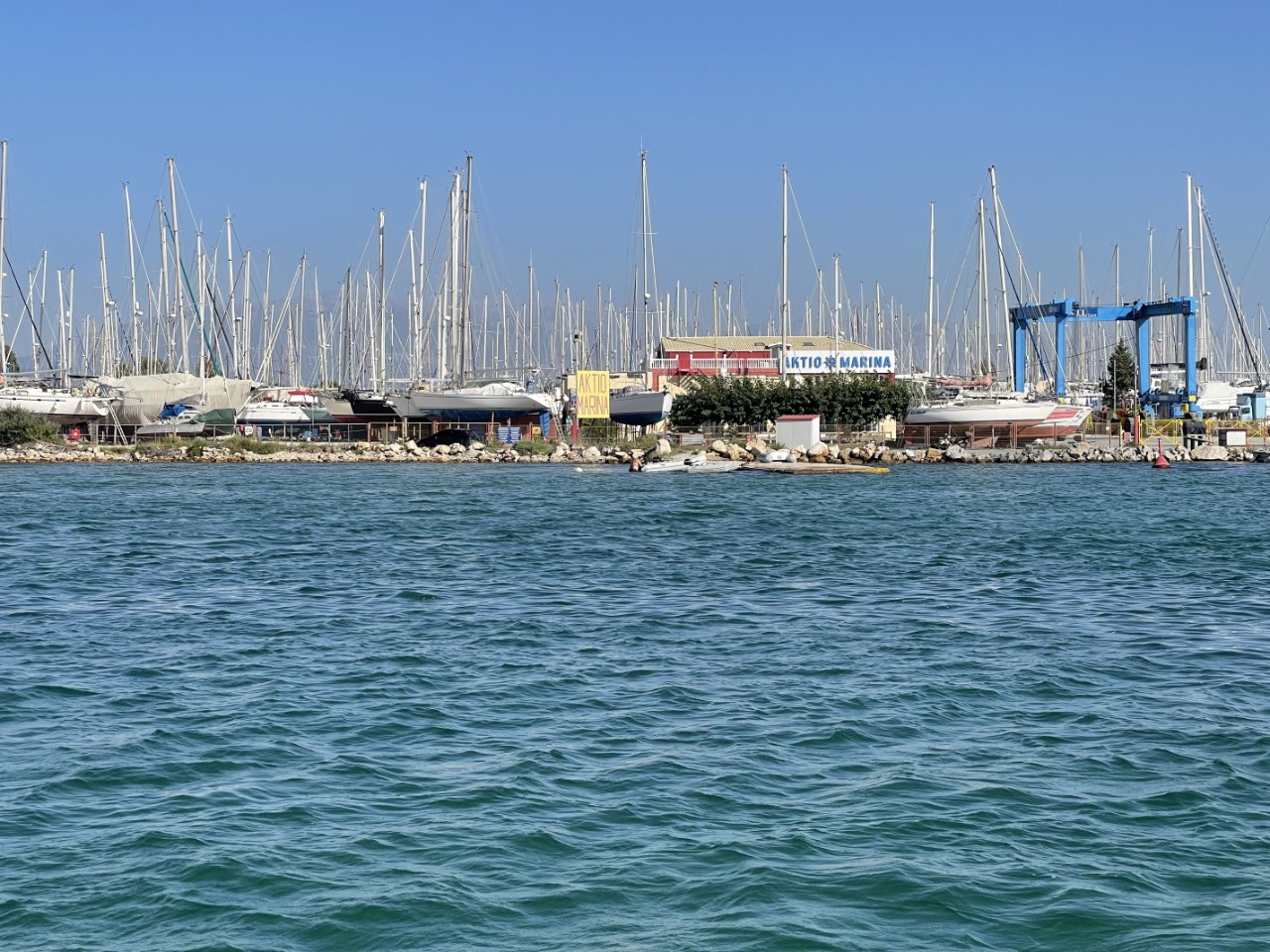 Na het passeren van de laatste rode ton, zoeken we naar een plekje. Gaan we aan de stadskade of kiezen we voor vrijheid en iets koeler achter ons anker en dan waar? We kiezen voor het anker en dan vlak voor de botenstalling van Aktio. Daar worden we in september de kant op gehesen. Het is gelijk een mooie gelegenheid om daar een kijkje te nemen. We zijn tevreden, bij de infobalie vragen we ook hoe de verbinding is naar het vliegveld en dat valt ook mee. 1,5 kilometer wandelen ofwel een halfuurtje. Misschien een betere optie dan met de bus vanuit Preveza stad.