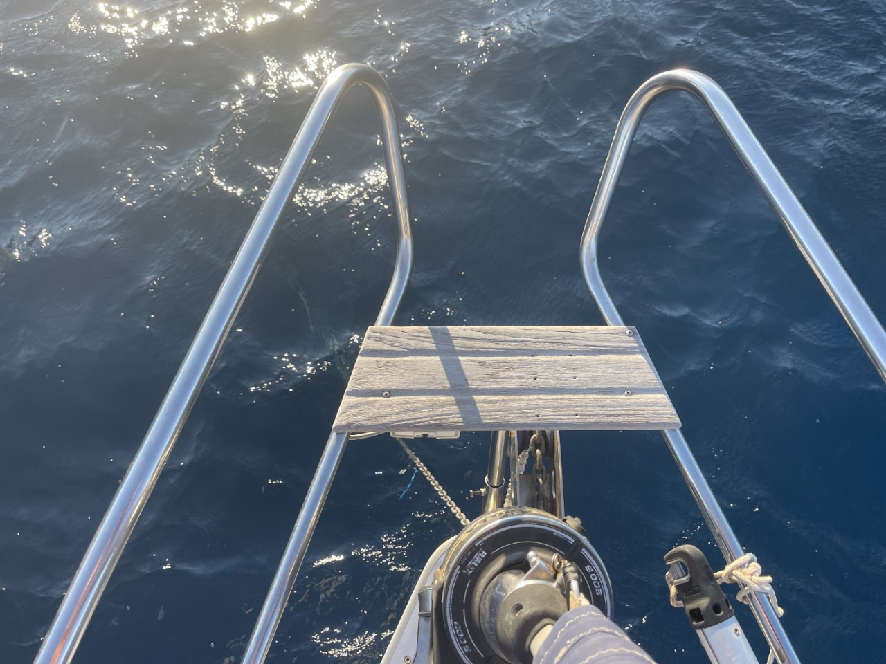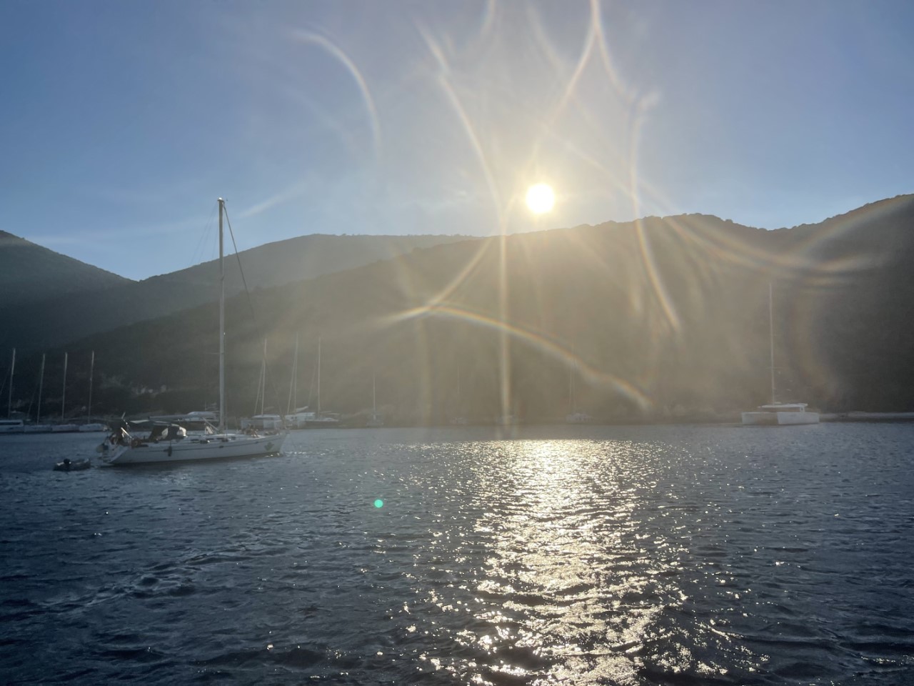 In de loop van de middag steekt er een flinke wind op met uitschieters van 30 knopen. Een catamaran achter ons verdwijnt steeds meer naar achteren, want z’n anker is aan het krabben. We denken even dat er niemand aan boord is, maar ineens is er beweging en starten ze de motor. Met die harde wind is het voor boten, die aankomen een hele klus om een ruim ankerplekje te vinden. Wat ons dan weer veel kijkplezier oplevert.