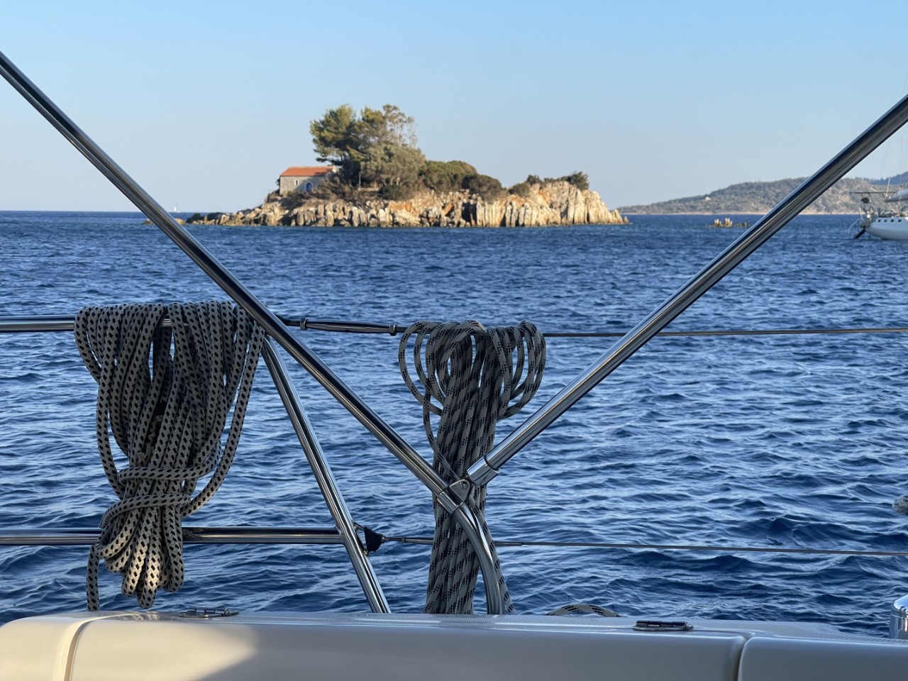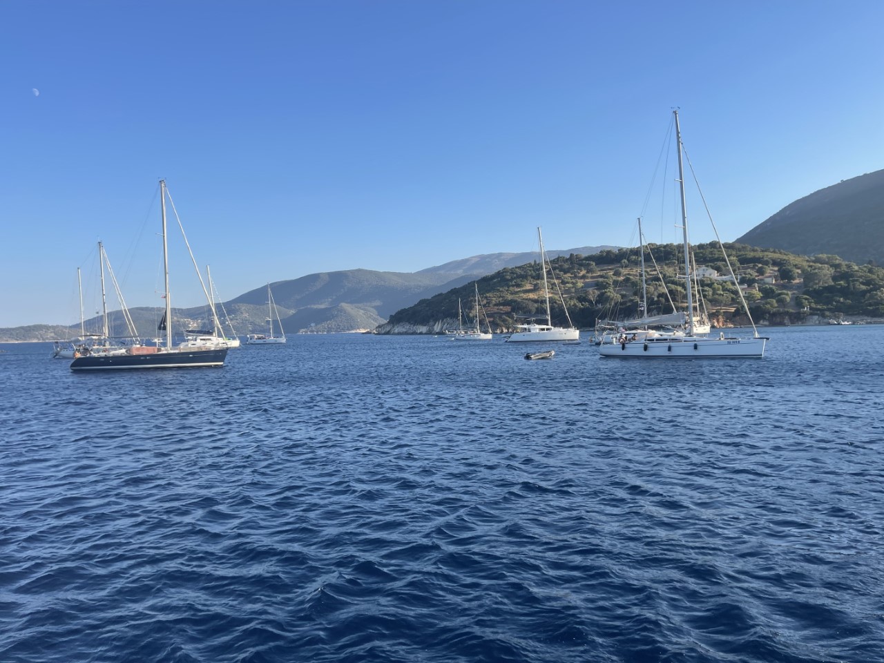 Ik ben alweer vroeg wakker en installeer de bimini en maak de Just vaarklaar. Marianne wordt ook wakker en we hebben het anker opgehaald voor een kort tochtje naar Ithaka. Aangekomen in de Marmagkas Bay is het aardig druk met veel charterzeilboten. Wij bemachtigen een ruim plekje aan de oostzijde.