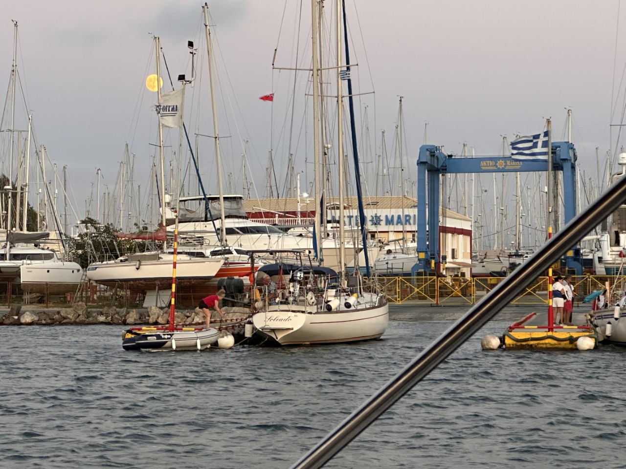 Het laatste stukje naar Preveza is hobbelig met hoge rollende golven dwars op de Just. Op het rustige water van het binnenwater van Preveza maak ik de Just klaar om eventueel aan te leggen aan de kade. Marianne vindt het onzin, omdat het weekend is en bijna alle ligplaatsen gereserveerd zijn door de chartermaatschappijen. We hebben echter geluk. Daniel spot een smal plekje, waar we de Just in kunnen proppen.