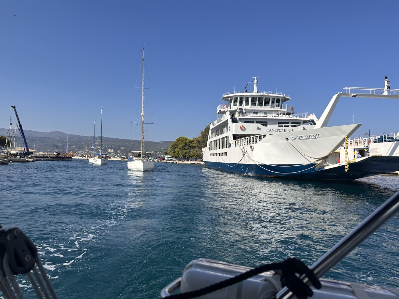 Vanmorgen als we opstaan is het water rond de Just als een spiegel zo glad. Wat een verschil met gisteravond. Precies om 07:30 uur halen we ons anker op en zetten koers naar de draai-veerpontbrug van Lefkas. Met een sukkelgangetje bereiken we samen met een veertigtal boten het smalle kanaaltje om daar in optocht te wachten op de opening. De opening gaat anders dan de vorige keer. Toen vaarde die veerpont bijna naar het openwater. Nu meert het schip af aan de kade.