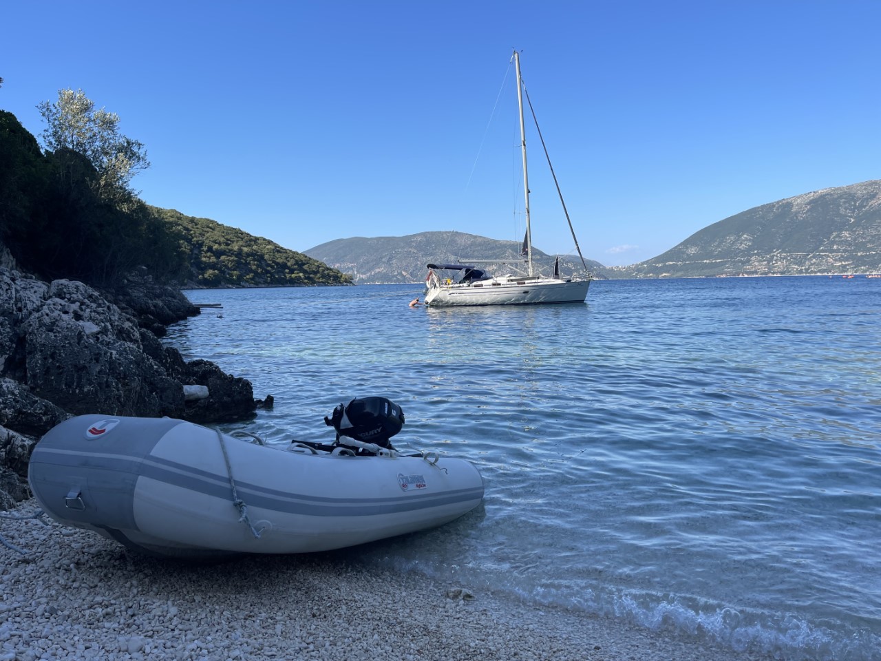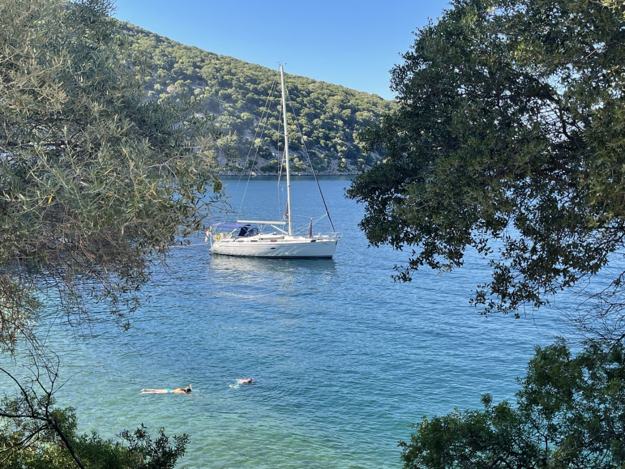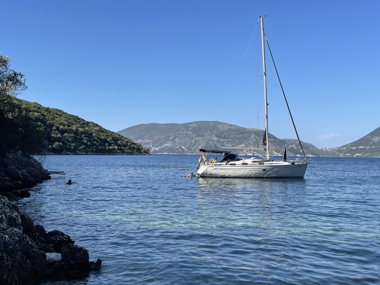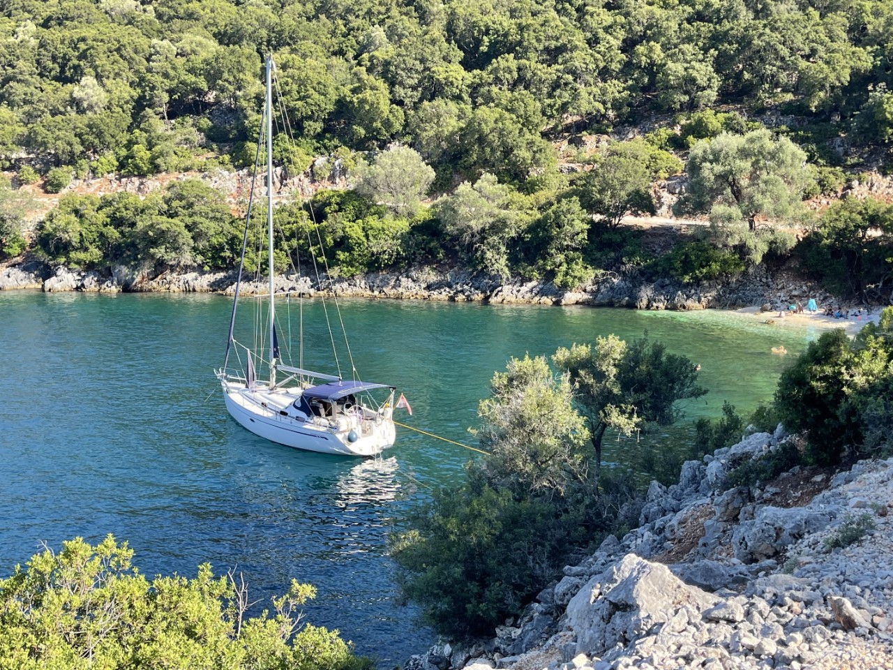 We zeilen door tot aan Fiskardo. Een leuk, maar heel druk plaatsje met weinig ankerplekjes. Bijna alle boten liggen afgemeerd met lange lijnen naar de kant. Daar hebben we niet zo zin in. We bekijken tot aan Kagogilos Beach elke baai en keuren de een na de ander af. De ene was te ondiep, de andere te druk of we vinden het geen gezellige baai. Bij Kagogilos is het ook zoeken naar een geschikt ankerplekje. Op de Navionics-kaart geven ze een diepte aan van 13 meter. maar onze dieptemeter geeft ruim 30 meter aan. Uiteindelijk vinden we aan de zuidkant een 10 meter diep plekje. We vinden het gelijk een mooi leermomentje om te ankeren met lijnen aan de achterspiegel naar de rotsen. Gelukt we liggen.