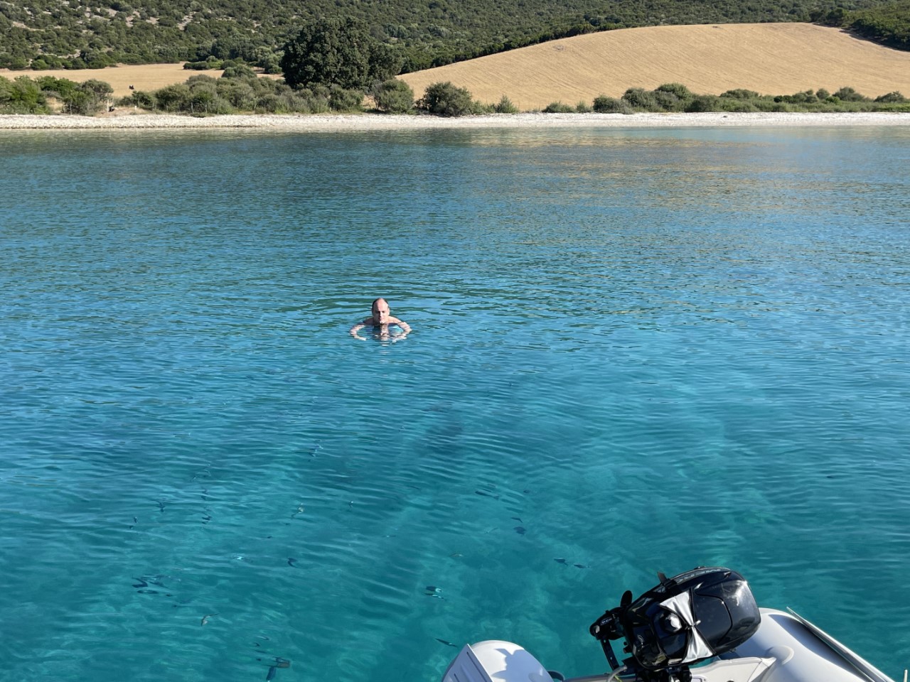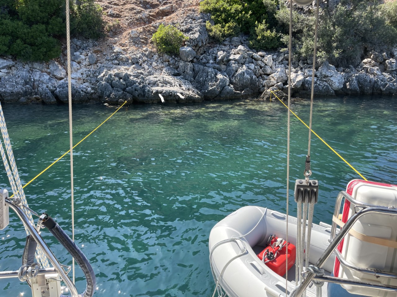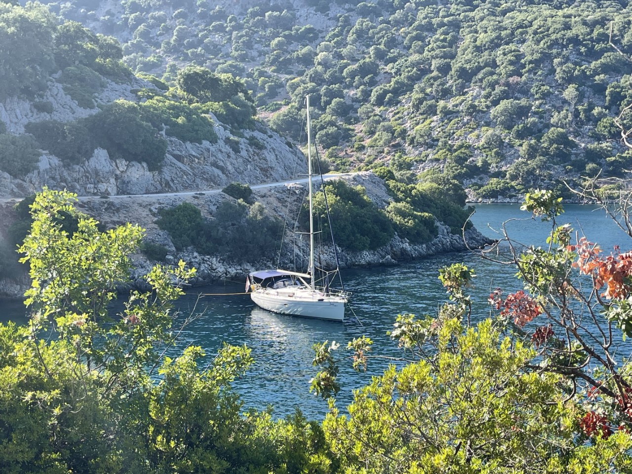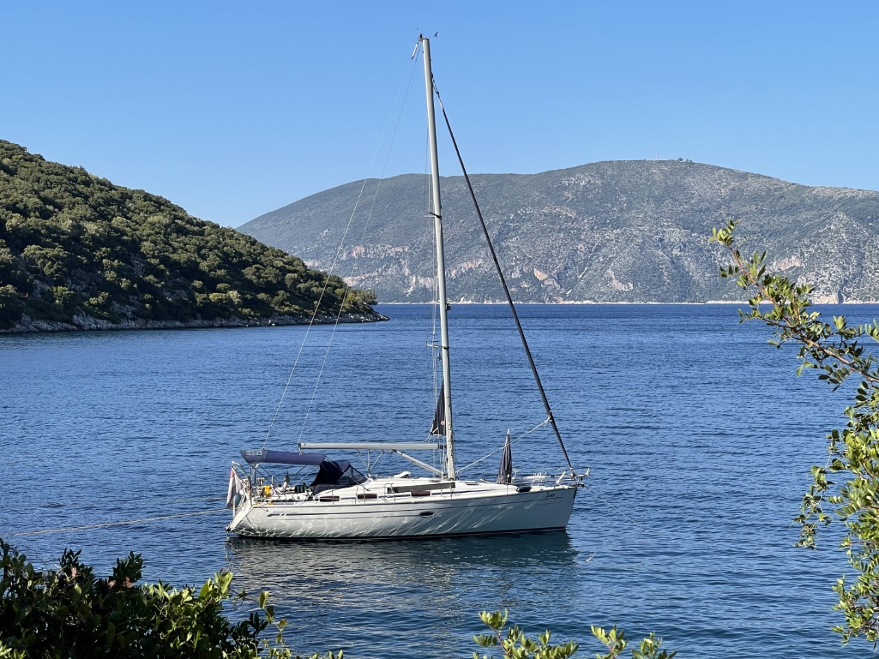 We zeilen door tot aan Fiskardo. Een leuk, maar heel druk plaatsje met weinig ankerplekjes. Bijna alle boten liggen afgemeerd met lange lijnen naar de kant. Daar hebben we niet zo zin in. We bekijken tot aan Kagogilos Beach elke baai en keuren de een na de ander af. De ene was te ondiep, de andere te druk of we vinden het geen gezellige baai. Bij Kagogilos is het ook zoeken naar een geschikt ankerplekje. Op de Navionics-kaart geven ze een diepte aan van 13 meter. maar onze dieptemeter geeft ruim 30 meter aan. Uiteindelijk vinden we aan de zuidkant een 10 meter diep plekje. We vinden het gelijk een mooi leermomentje om te ankeren met lijnen aan de achterspiegel naar de rotsen. Gelukt we liggen.