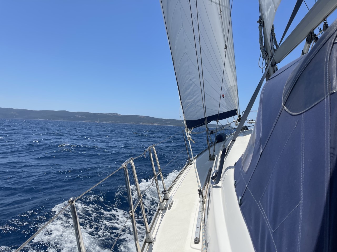 We zetten koers naar de baai van Afales op Ithaka, een tochtje van ongeveer vier uur. Nadat we ruim twee uur hebben gemotord, waarbij we weer eens wind tegen hebben, draait de wind en wij zetten de zeilen. Zo varen we deels de baai van Afales in. De bedoeling is om daar te ankeren en dan een berg van 195 meter te beklimmen om de School van Homerus en het paleis van Odysseus te bezoeken. Maar helaas de baai ligt onbeschermd tegen de huidige wind en het scheelt ons een fikse wandeling bergop.