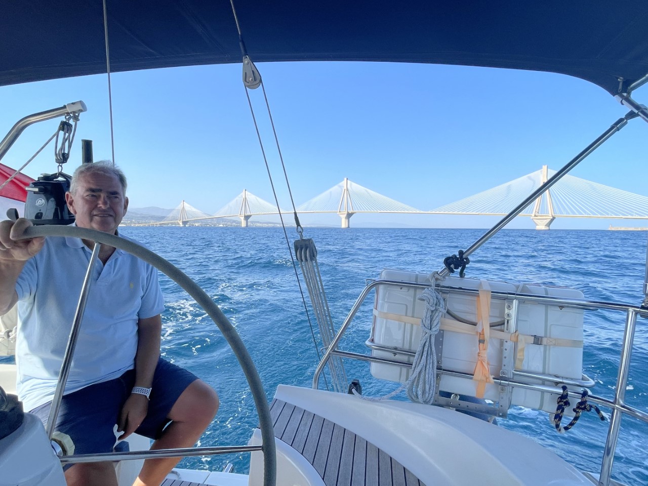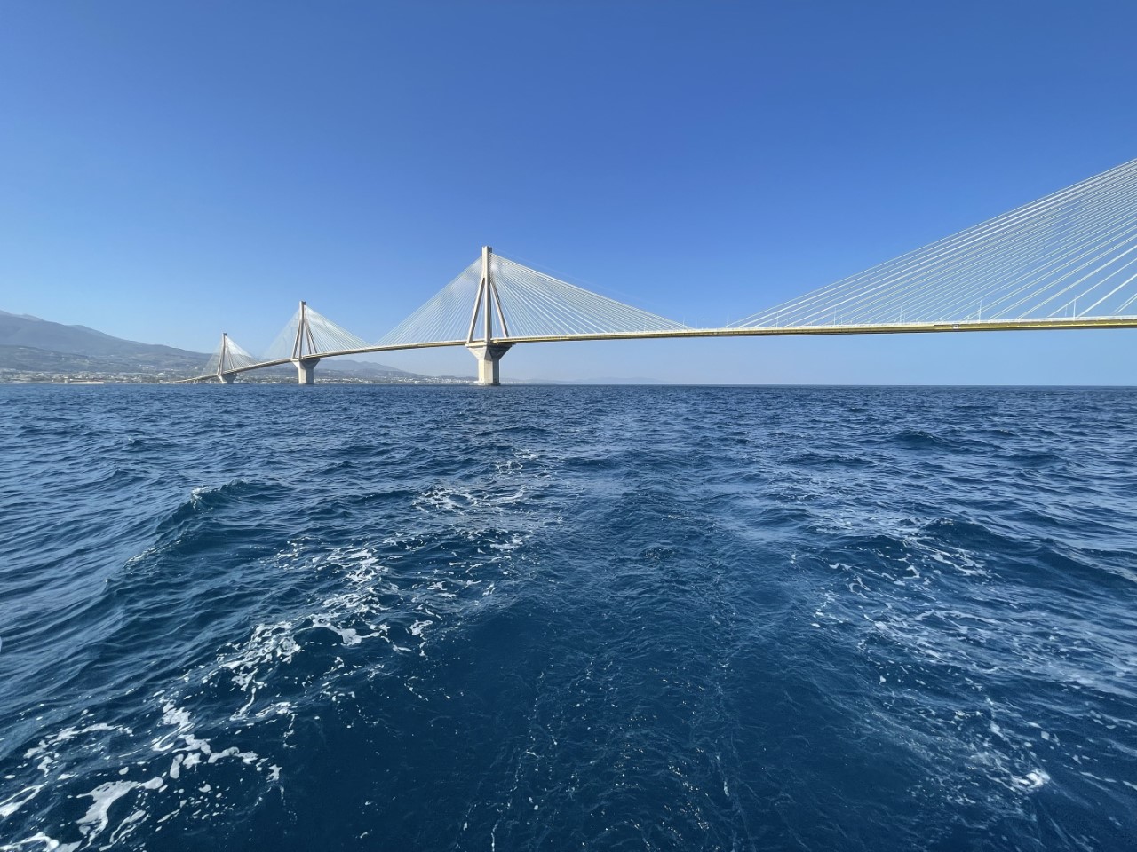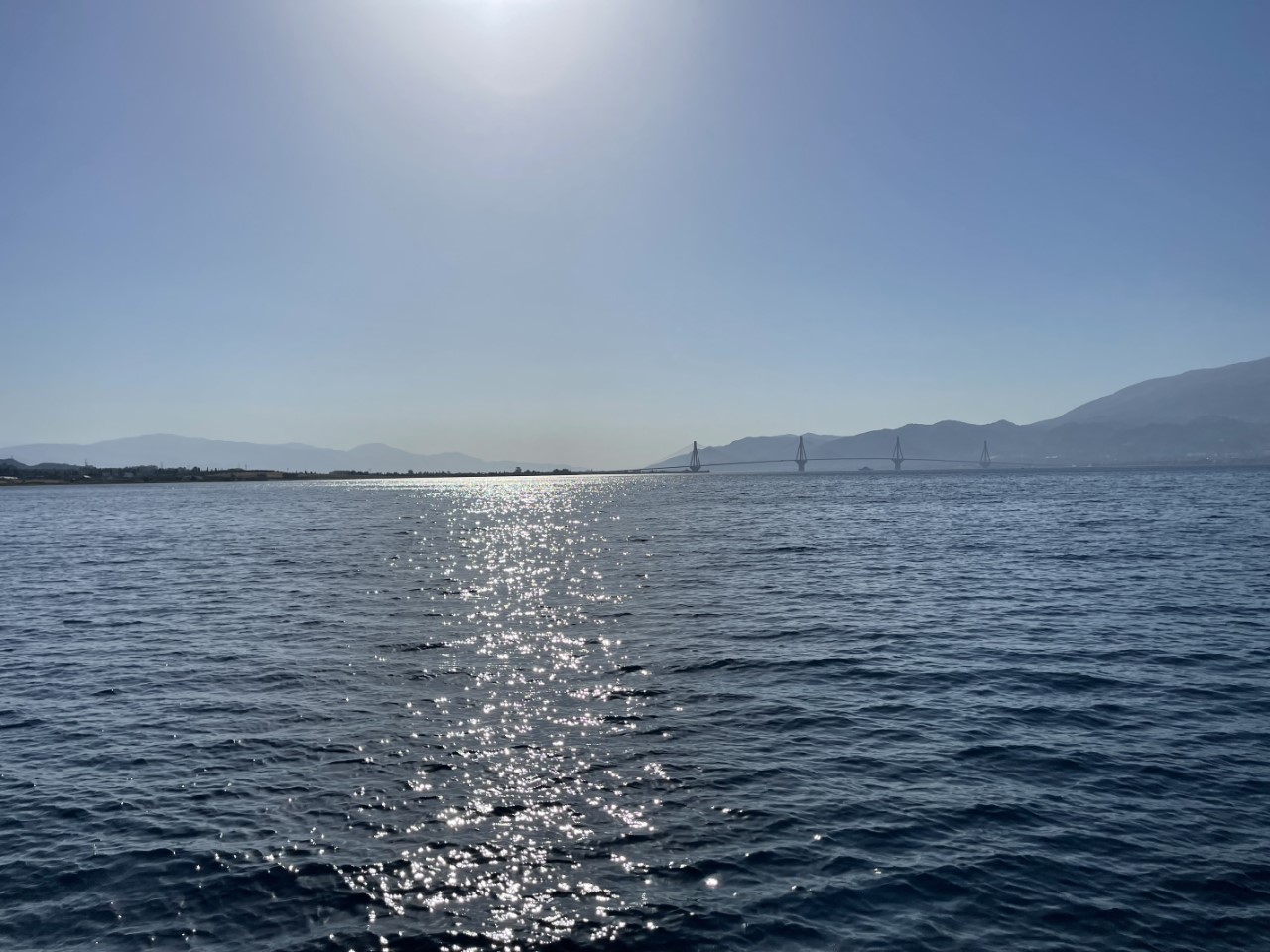 Tegen alle verwachting hebben we in deze baai heerlijk geslapen, geen golven en windstil. De Just lag stil alsof we in de haven lagen. We halen ons anker op en stellen de kaartplotter in voor de haven van Náfpaktos en ook voor de Rionbrug. Het invaren van de Golf van Korinthe is zo een punt dat je toch even de Almanak raadpleegt.