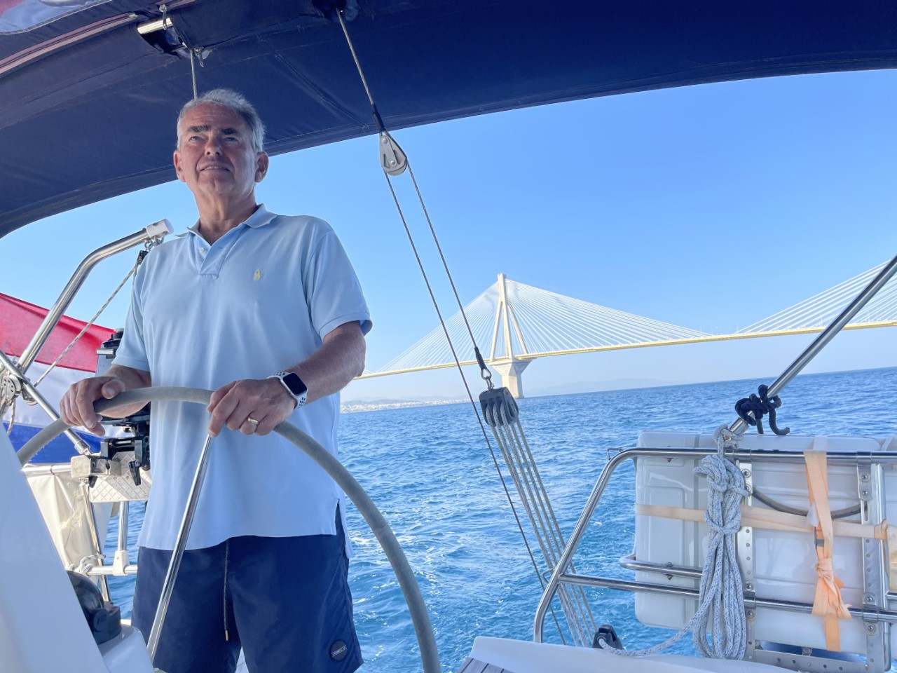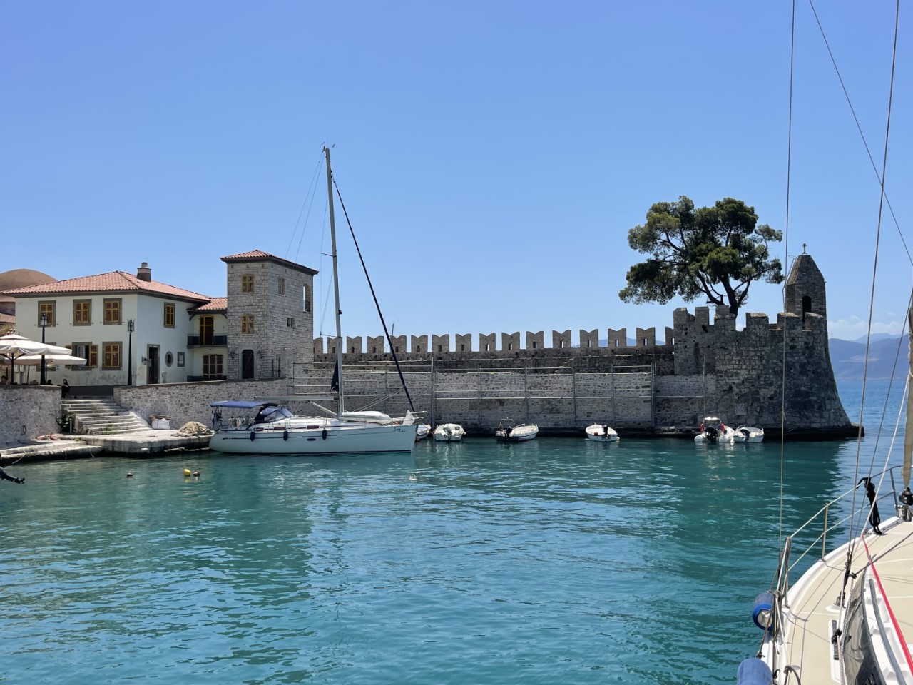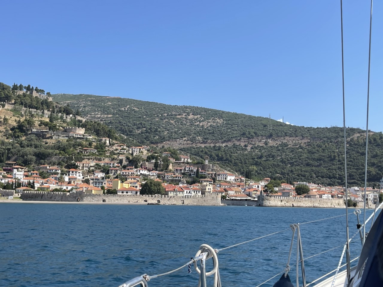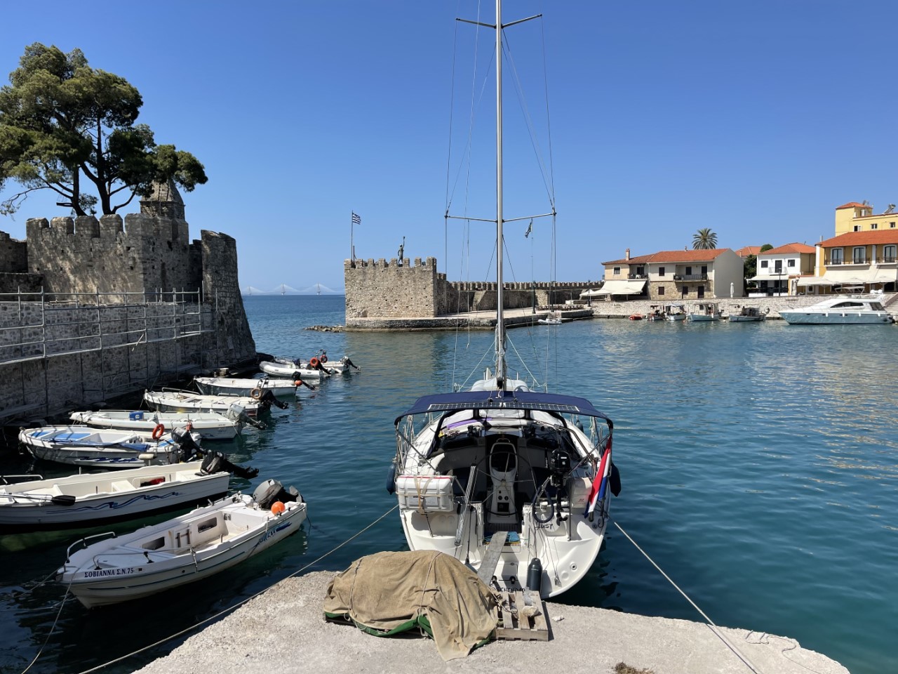 Tegen alle verwachting hebben we in deze baai heerlijk geslapen, geen golven en windstil. De Just lag stil alsof we in de haven lagen. We halen ons anker op en stellen de kaartplotter in voor de haven van Náfpaktos en ook voor de Rionbrug. Het invaren van de Golf van Korinthe is zo een punt dat je toch even de Almanak raadpleegt.