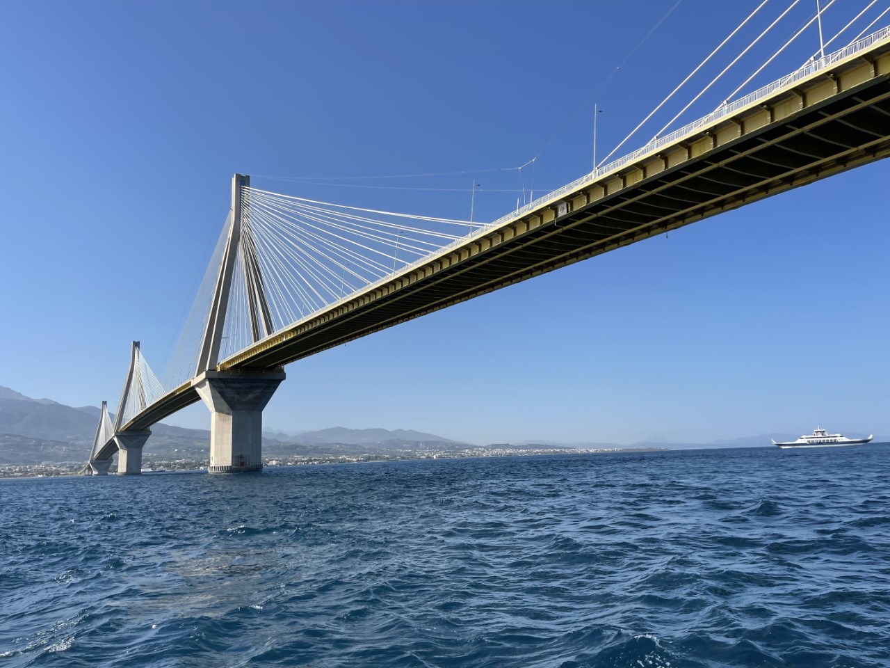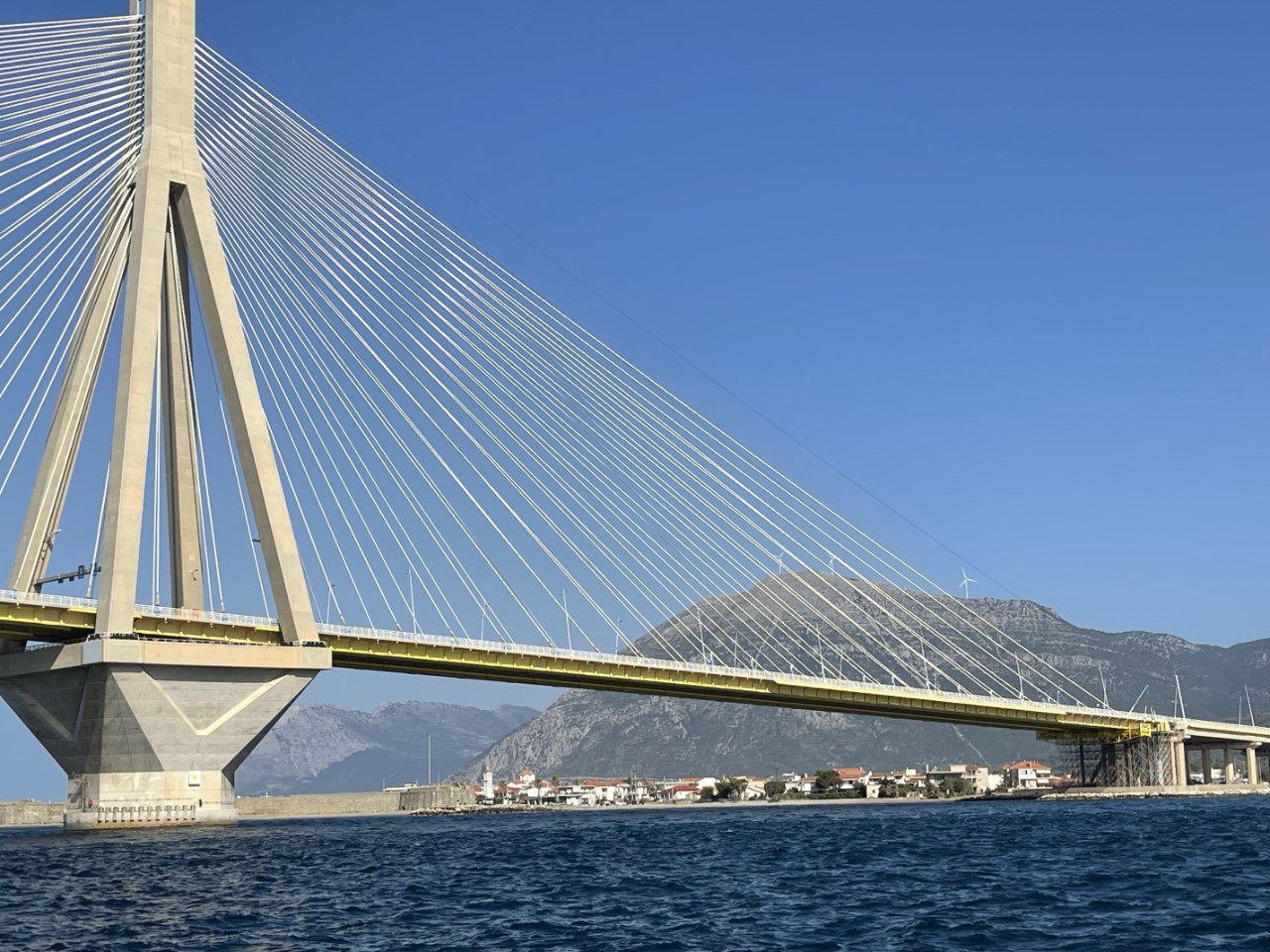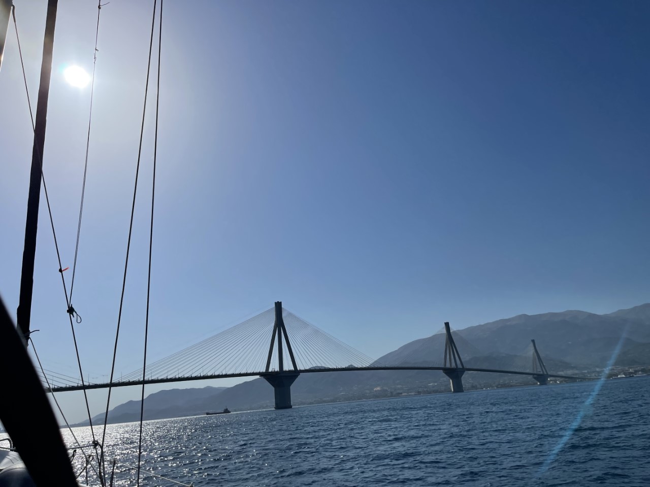 We moeten ons verplicht melden als we binnen de straal van 5 mijl zijn. Dat doen we netjes, ook al weten we niet wat de sancties zijn. Het is iets wat je gewoon doet. Veiligheid voor alles. We luisteren even mee naar het marifoonverkeer. De Griekse brugwachter is goed verstaanbaar en we mogen aan bakboordzijde de brug onder doorvaren. Er wordt zelfs gevraagd of we willen bevestigen dat we het hebben begrepen. De definitieve toestemming krijgen we pas 1 mijl voor de brug, als we ons nog een keer moeten melden. We nemen veel foto’s van de mooie brug.