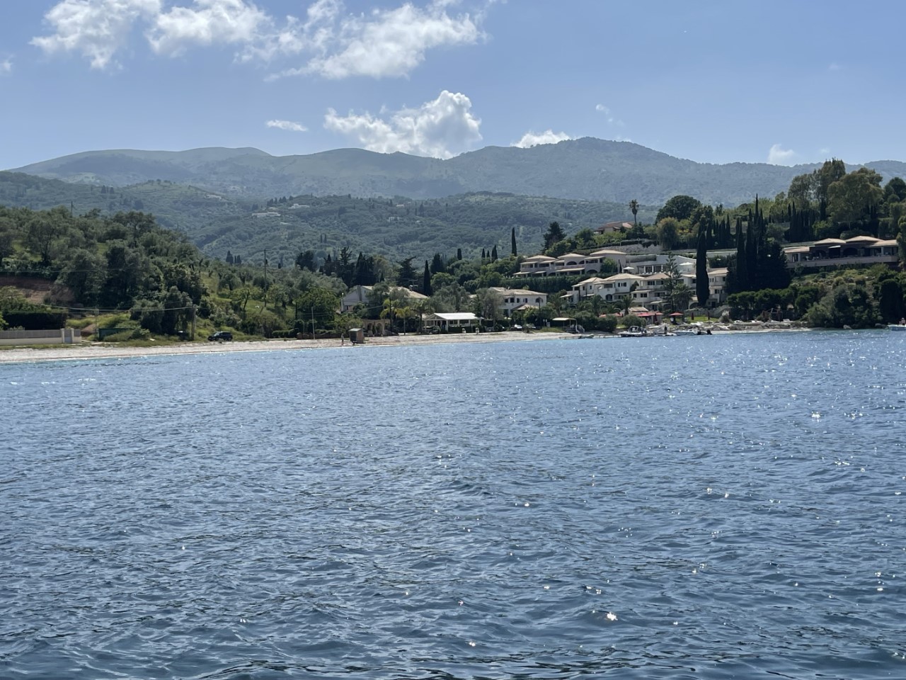 We varen naar de Avlaki Baai bij Kassiopi. We komen tegen half drie aan. Een ruime baai met een half rond kiezelstrand, waar er zelfs mensen het water induiken. Ik doop m’n grote teen even in het water, het valt niet tegen, maar ik laat het daar bij. Ik wacht nog een paar dagen. Het vakantiegevoel begint nu bij ons te komen en we zijn volop aan het genieten.