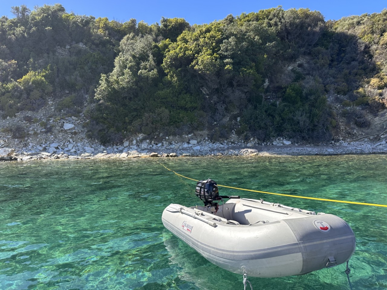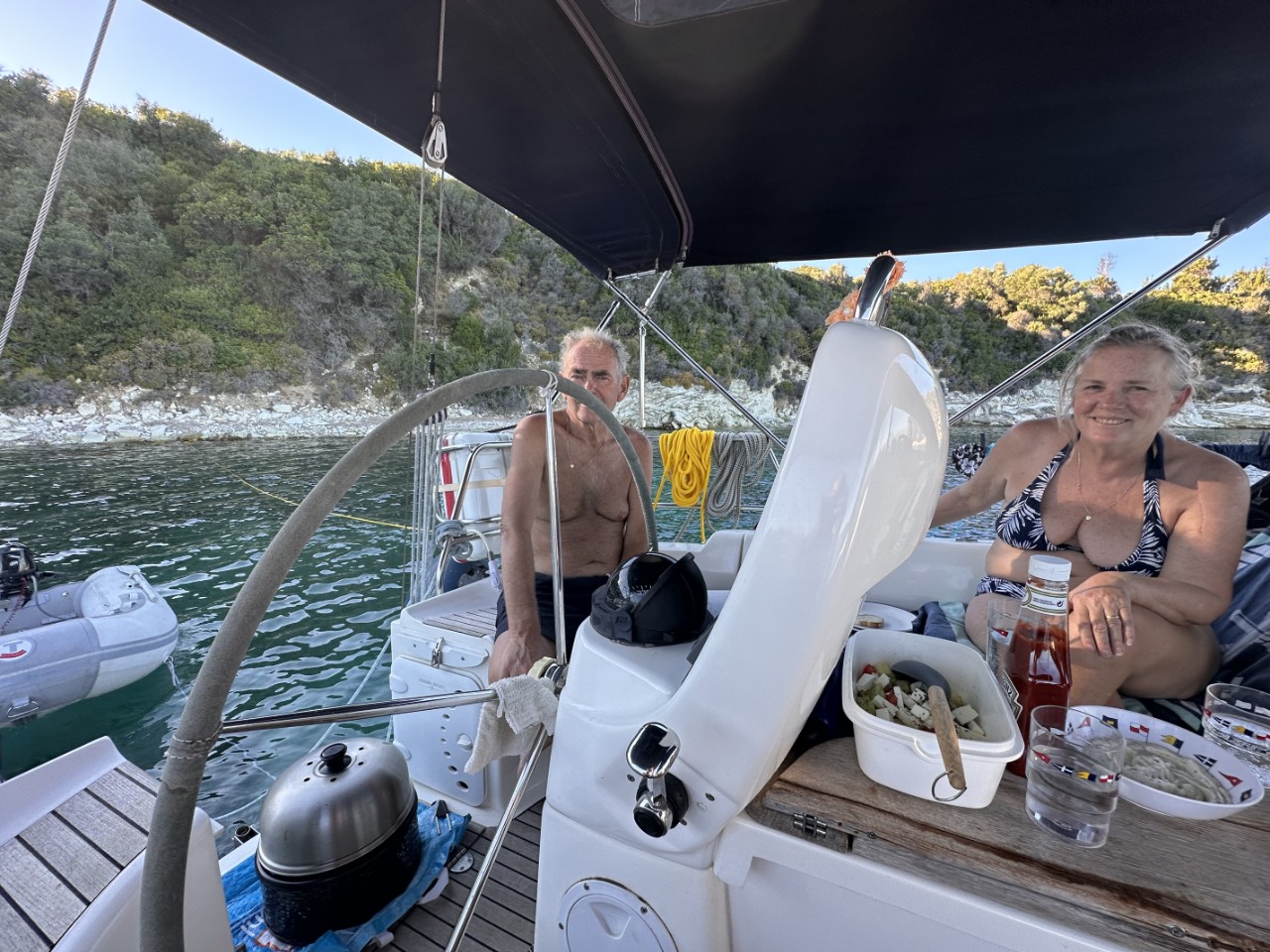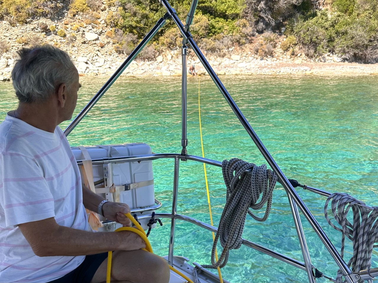 Alles is aan boord en we kunnen vertrekken. We hebben drie baaien bij Meganisi op het oog. De eerste valt af, te diep en erg druk. De tweede is stukken rustiger en we droppen ons anker op een mooie zandplaat. Daniel stelt voor om de lange gele drijvende lijnen naar de kant te brengen en die om een stevige rots te binden. Zo gezegd, zo gedaan. We liggen stevig tussen ons anker en een rots.