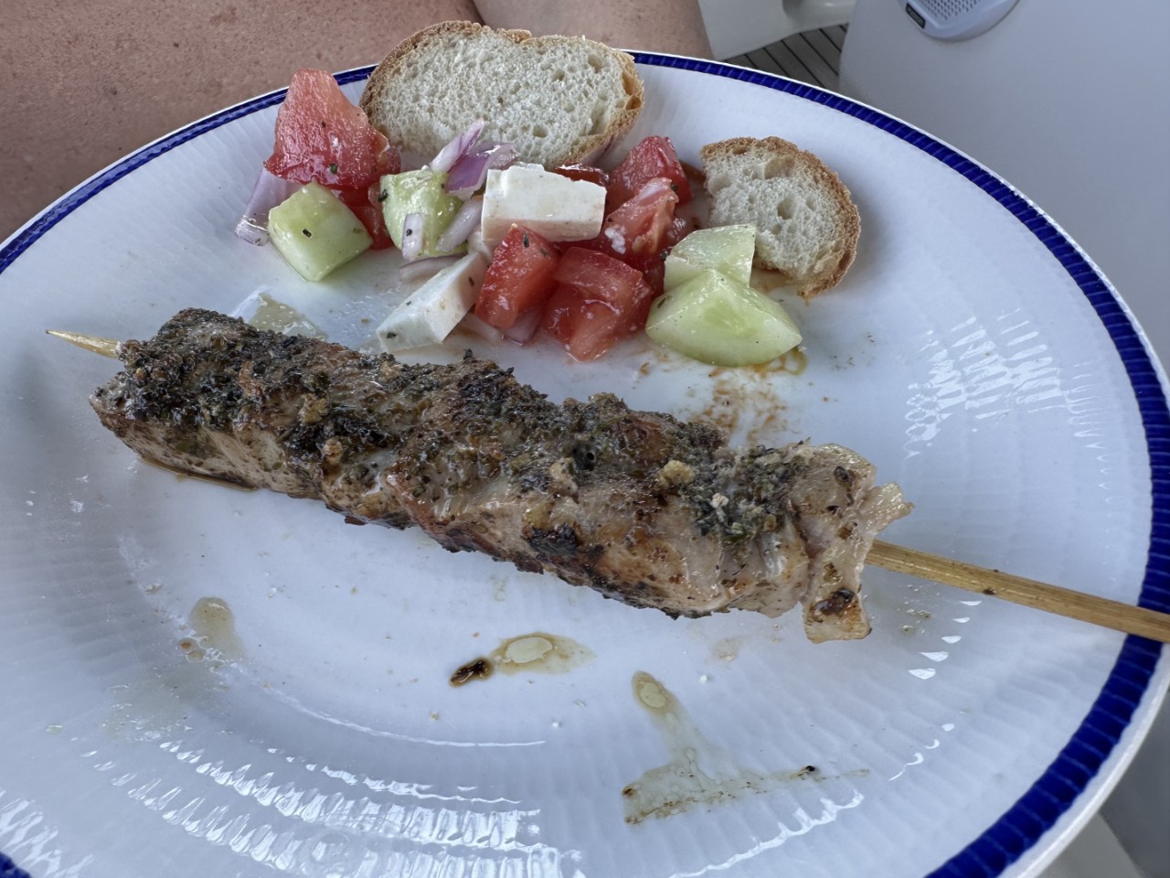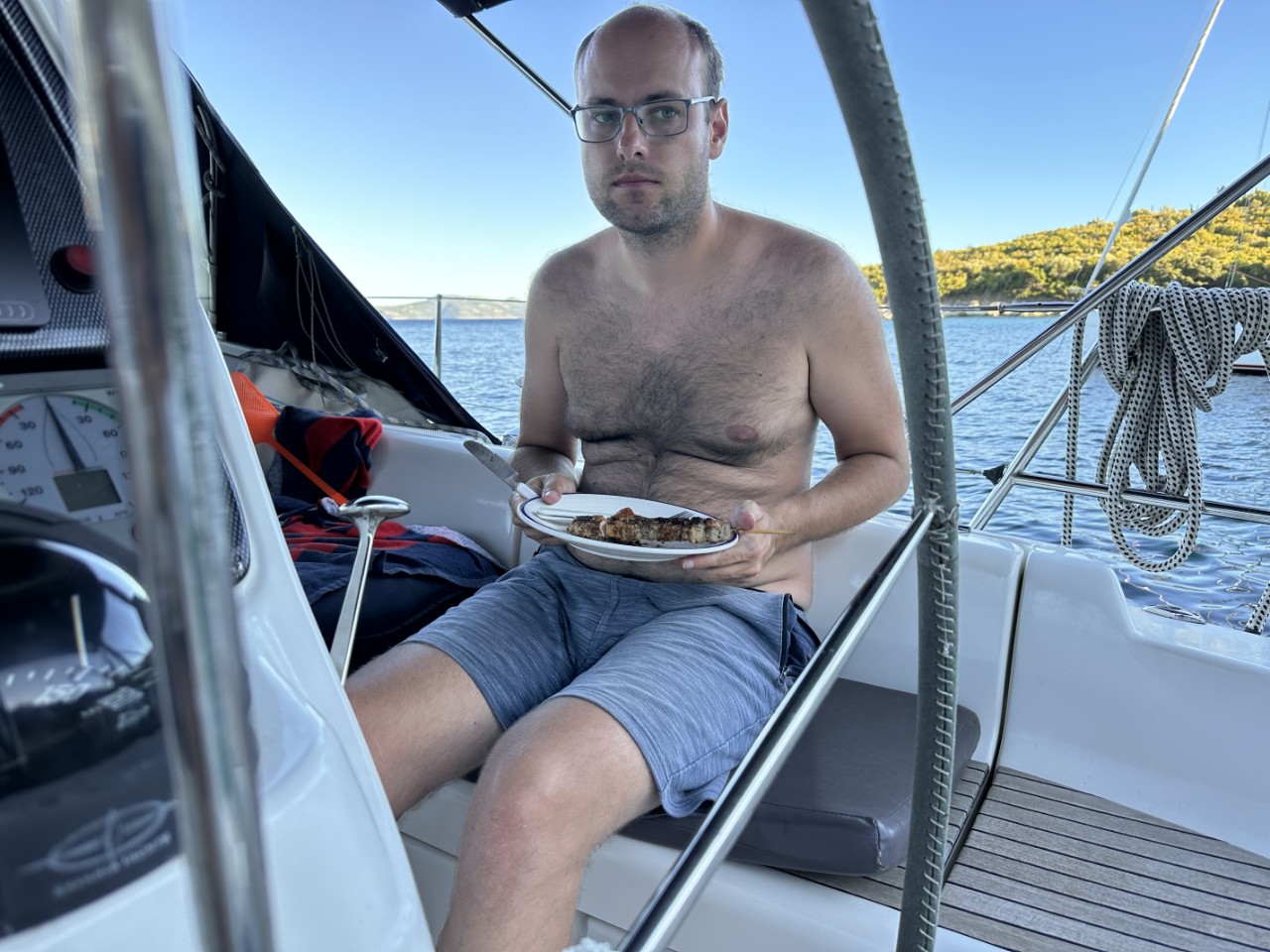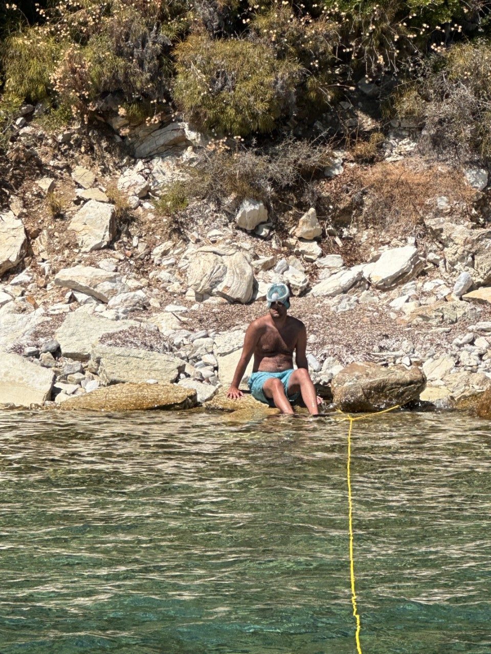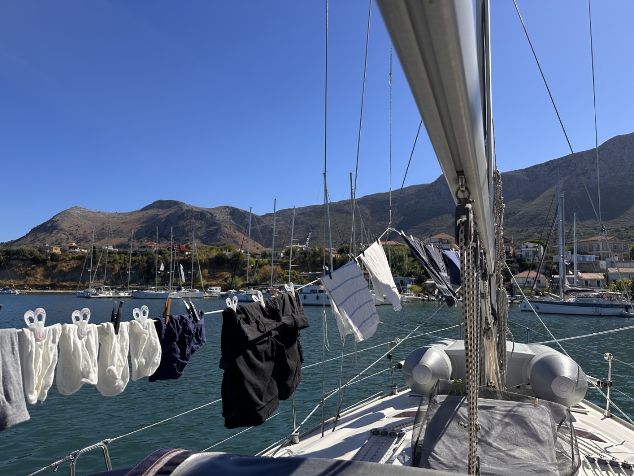 Alles is aan boord en we kunnen vertrekken. We hebben drie baaien bij Meganisi op het oog. De eerste valt af, te diep en erg druk. De tweede is stukken rustiger en we droppen ons anker op een mooie zandplaat. Daniel stelt voor om de lange gele drijvende lijnen naar de kant te brengen en die om een stevige rots te binden. Zo gezegd, zo gedaan. We liggen stevig tussen ons anker en een rots.