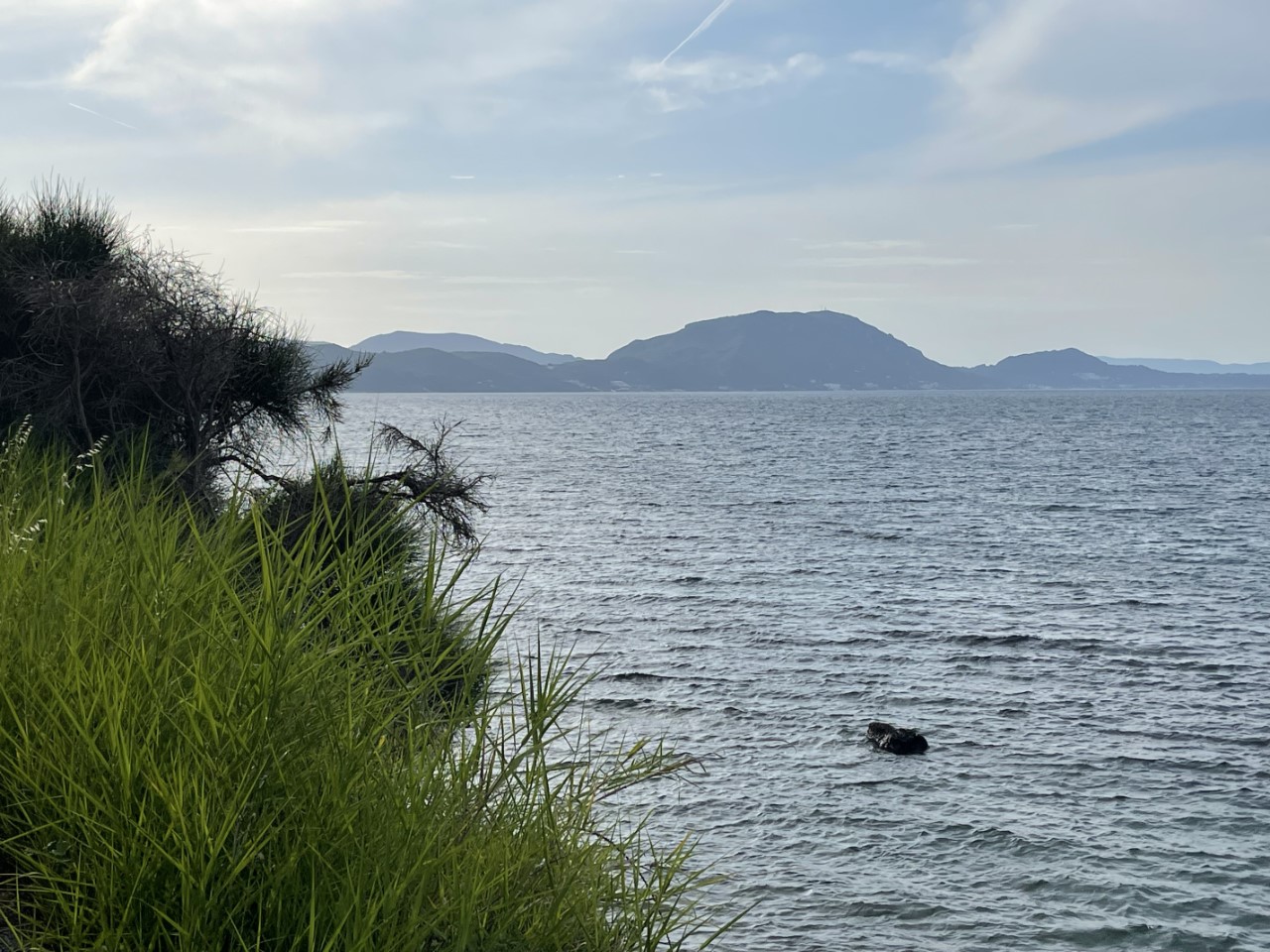 Na onze Spaanse hap (tortilla) en het middag dutje zijn we tegen 18:00 uur naar de wal gevaren. De enige optie was de dingy aanleggen bij de steiger van de taverna. Even afstemmen met de Griek en hij lacht en zegt no problem. We wandelen door de 2 straten en dan houdt de bebouwing op. Er staan olijfbomen. We inspecteren de twee supermarktjes en restaurantjes. Morgen verse broodjes. Langs het kustpad wandelen we om de volgende baai te bekijken, maar dat is niet helemaal gelukt. Links een berg met begroeiing en rechts de zee en na enige tijd zijn we omgekeerd. Na ruim een uur zijn we weer terug op de Just, waar we lekker genieten van het avondzonnetje in de kuip.