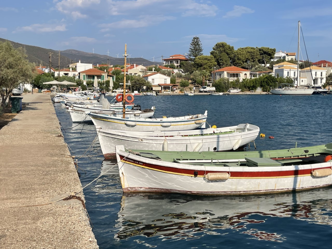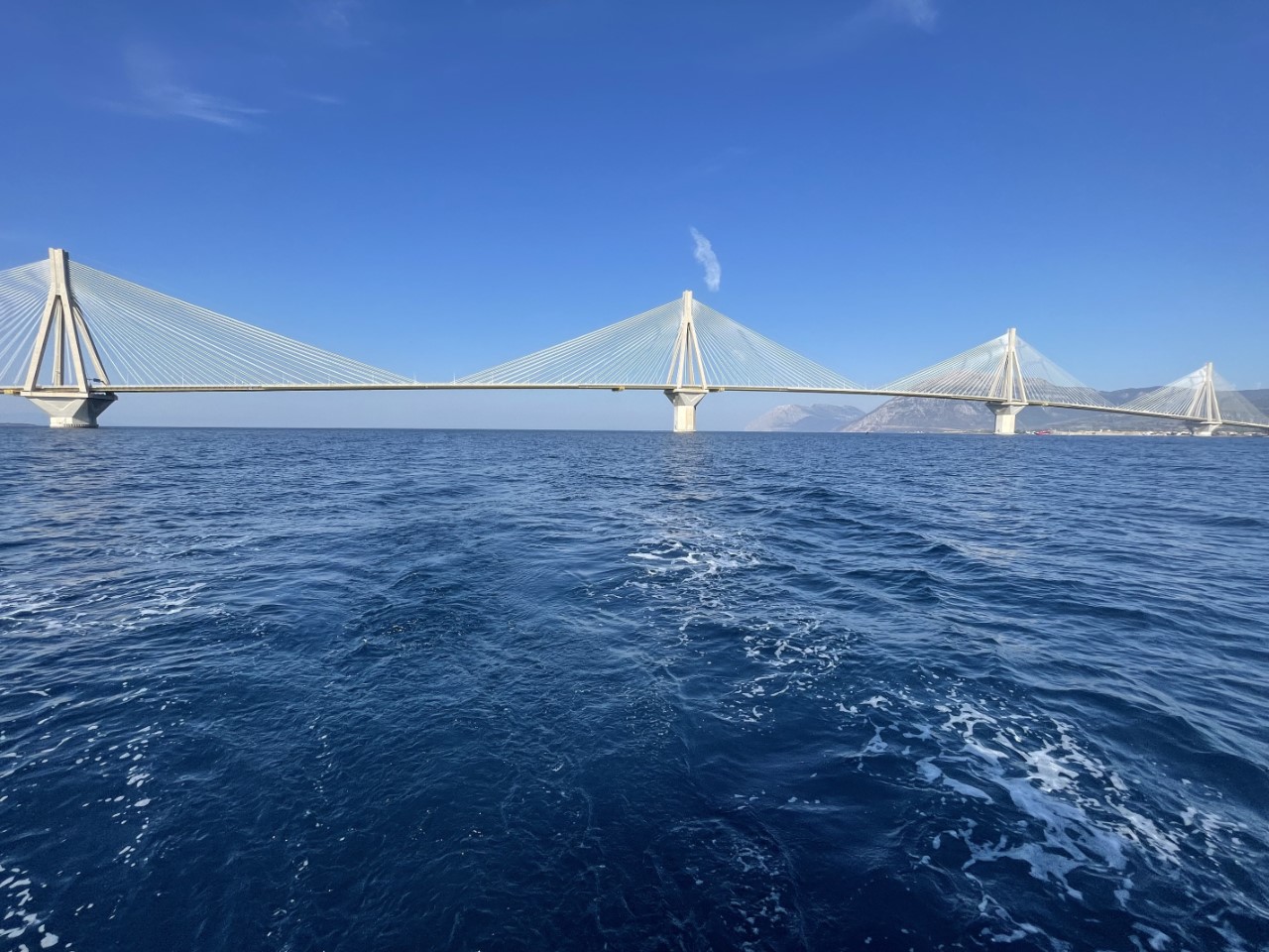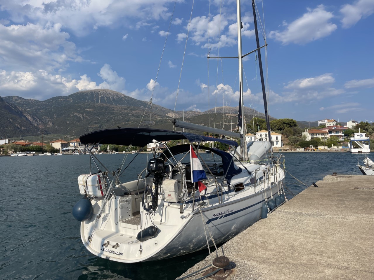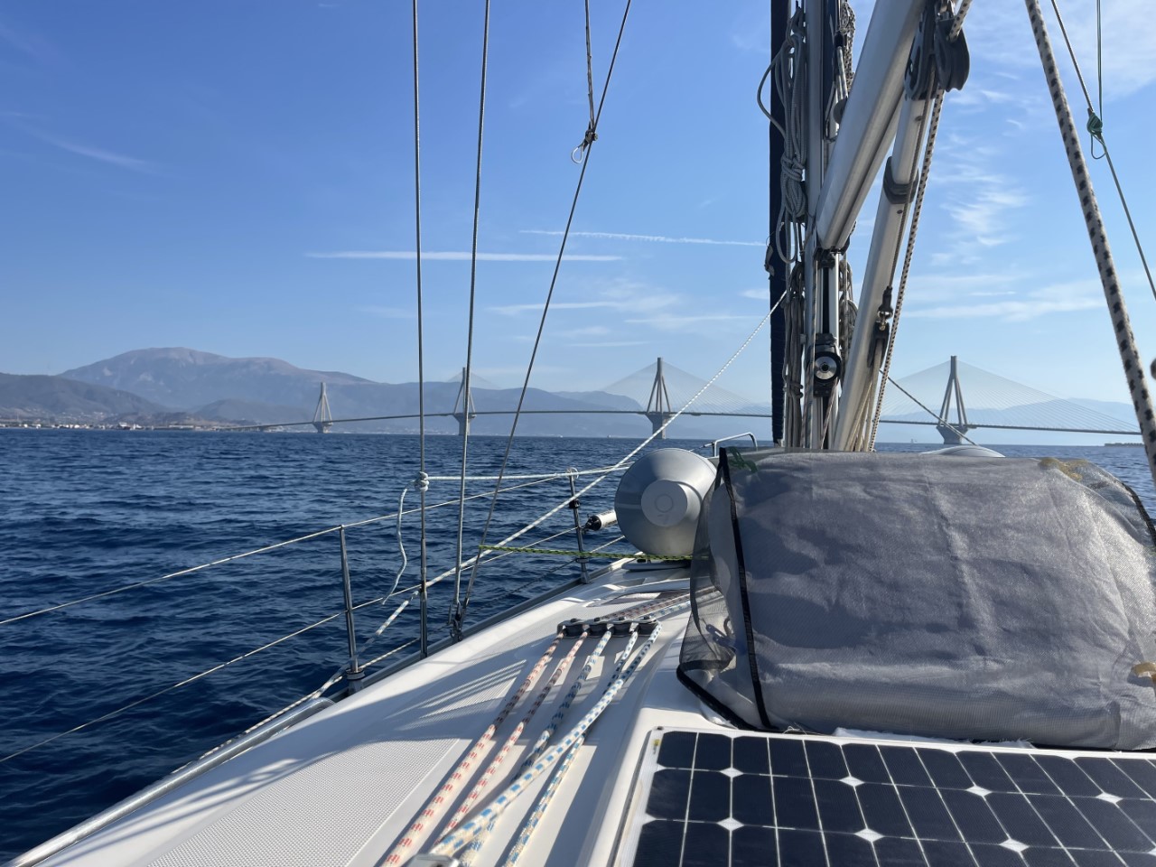 Na een rustige morgen vertrekken we uit Patras. We melden ons via de marifoon netjes bij Patras Traffic Control voor toestemming. En als we de haven uit zijn, melden we ons direct bij de Rian brug voor de onderdoorvaart. Dat moeten we herhalen 1 mijl voor de brug. Het is een beetje een saai tochtje met de wind op de kop. Alles gemotord. Aangekomen bij de ruime haven van Trizonia is er nog voldoende plek. Dat hadden we niet verwacht. We dachten te gaan ankeren.