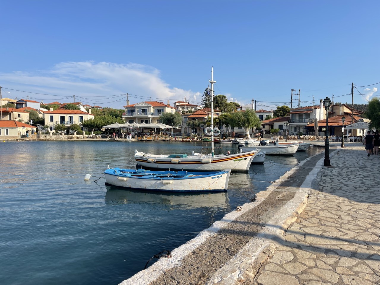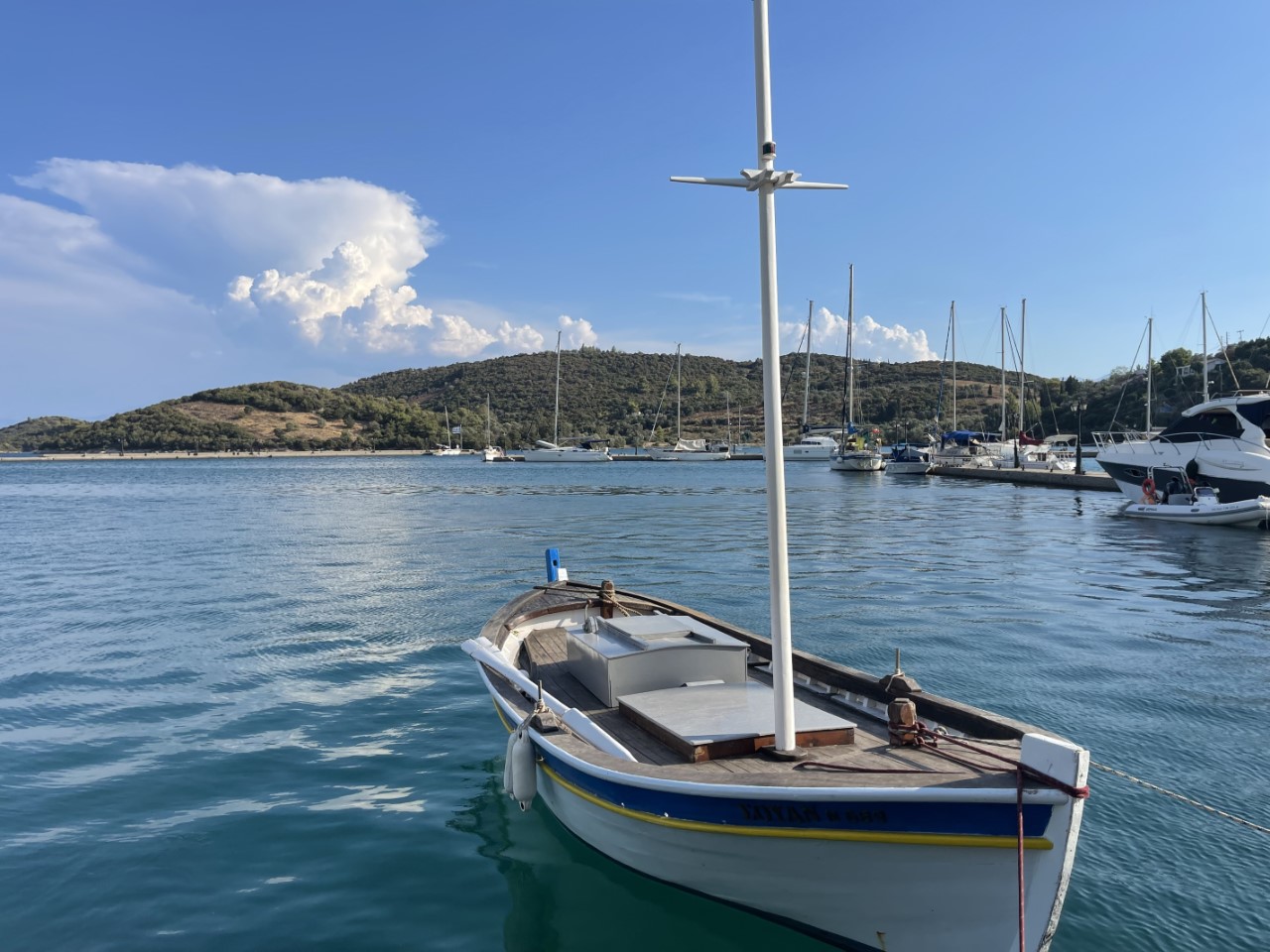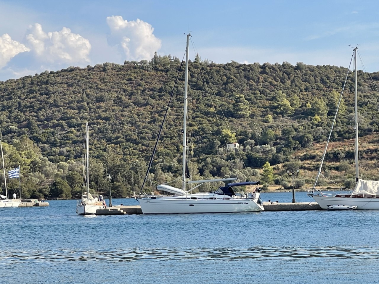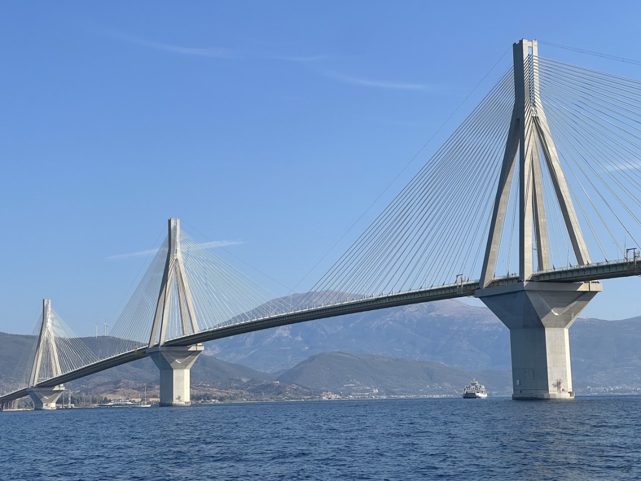 Na een rustige morgen vertrekken we uit Patras. We melden ons via de marifoon netjes bij Patras Traffic Control voor toestemming. En als we de haven uit zijn, melden we ons direct bij de Rian brug voor de onderdoorvaart. Dat moeten we herhalen 1 mijl voor de brug. Het is een beetje een saai tochtje met de wind op de kop. Alles gemotord. Aangekomen bij de ruime haven van Trizonia is er nog voldoende plek. Dat hadden we niet verwacht. We dachten te gaan ankeren.