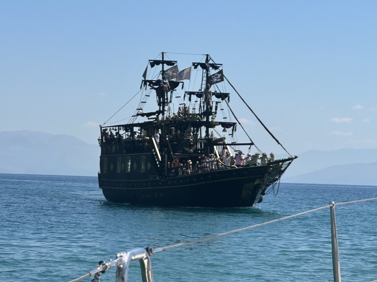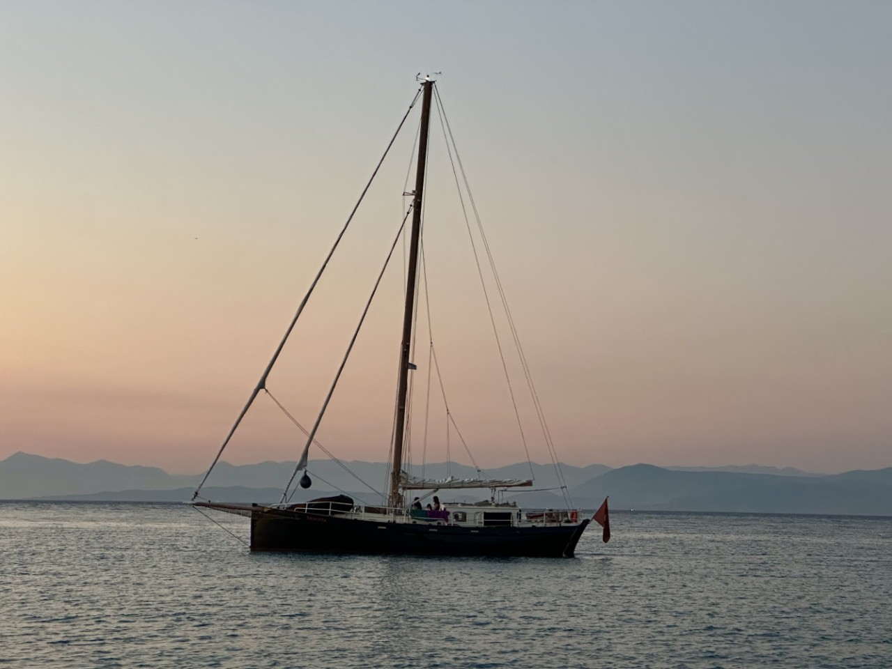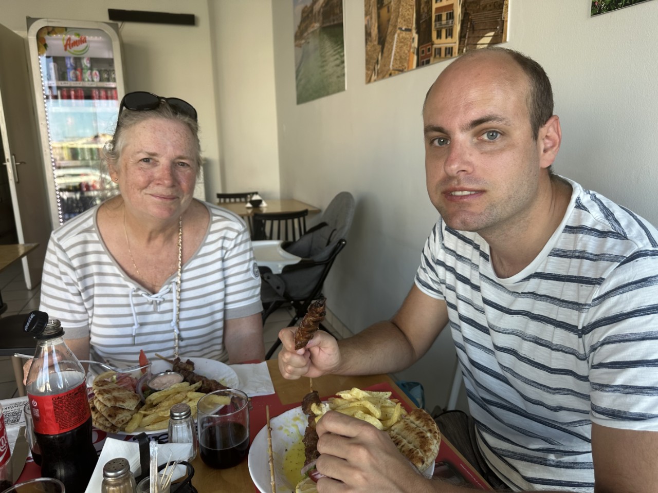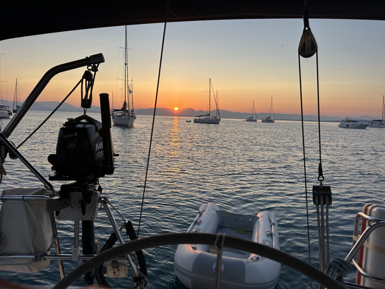 Na de lunch vertrekken we naar de Garitsa-baai vlakbij Corfu-stad. We zoeken een ankerplekje dichtbij de kade, omdat we in de namiddag naar de Lidl willen en naar de Varta-accushop voor een nieuwe startaccu. Tegen 18:00 uur roeien we naar de kade. Er is een stenen trapje met leuning aangelegd, waar alle bijbootjes bij elkaar liggen. We wurmen ons bootje ook erbij. Daarna zetten we de pas erin voor het shoppen. Bij een restaurantje maken we een pitstop. Marianne gaat winkelen bij de Lidl en samen met Daniel loop ik verder om een accu te kopen. Maar helaas, iedere maandag- en woensdagmiddag vanaf 15:00 uur zijn de winkels gesloten, dus we kunnen morgen terug. Dan ga ik wel met het stepje, want om nou weer ruim 7 kilometer te wandelen, heb ik geen zin in. Daniel roeit ons terug naar de Just. We worden onderweg aangevallen door een zwerm muggen, die ons aardig leeg zuigen. Nadat alle boodschappen een plekje hebben gevonden, gaan we in relaxstand.