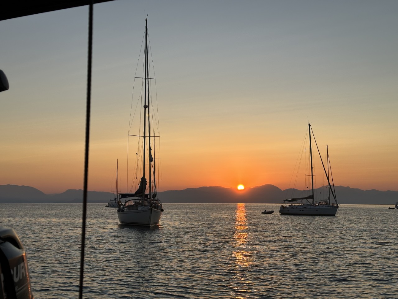 Eindelijk hadden we een rustige nacht. Geen swell, geen wind en geen vervelend dichtbij ankerende bootjes. We hebben dan ook heerlijk geslapen. We halen vroeg ons anker op voor een klein vaartochtje. Zeilen zit er niet in, er is geen zuchtje wind. Maar we genieten van de mooie, groene kustlijn van Corfu. Ons eerste ankerplekje voor vandaag is vlak voor de start- en landingsbaan van het vliegveld. Heel leuk om te zien, al die laag vliegende vliegtuigen met ronkende motoren. Marianne neemt er een verfrissende duik.