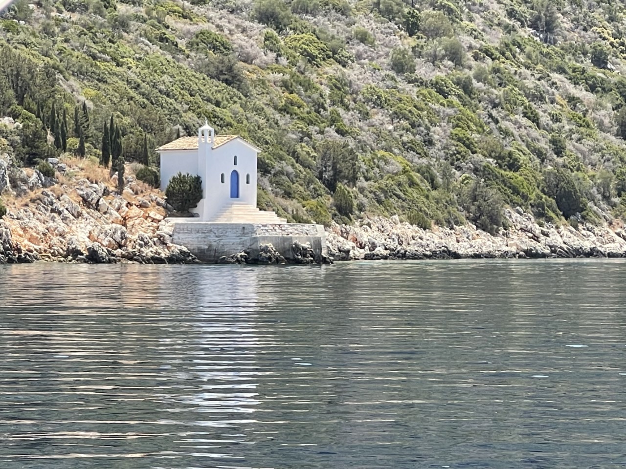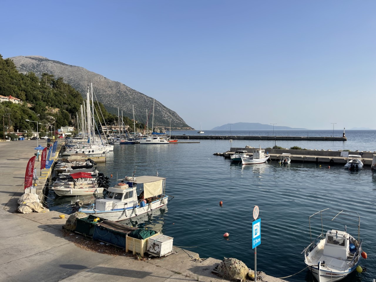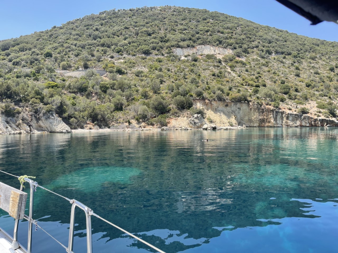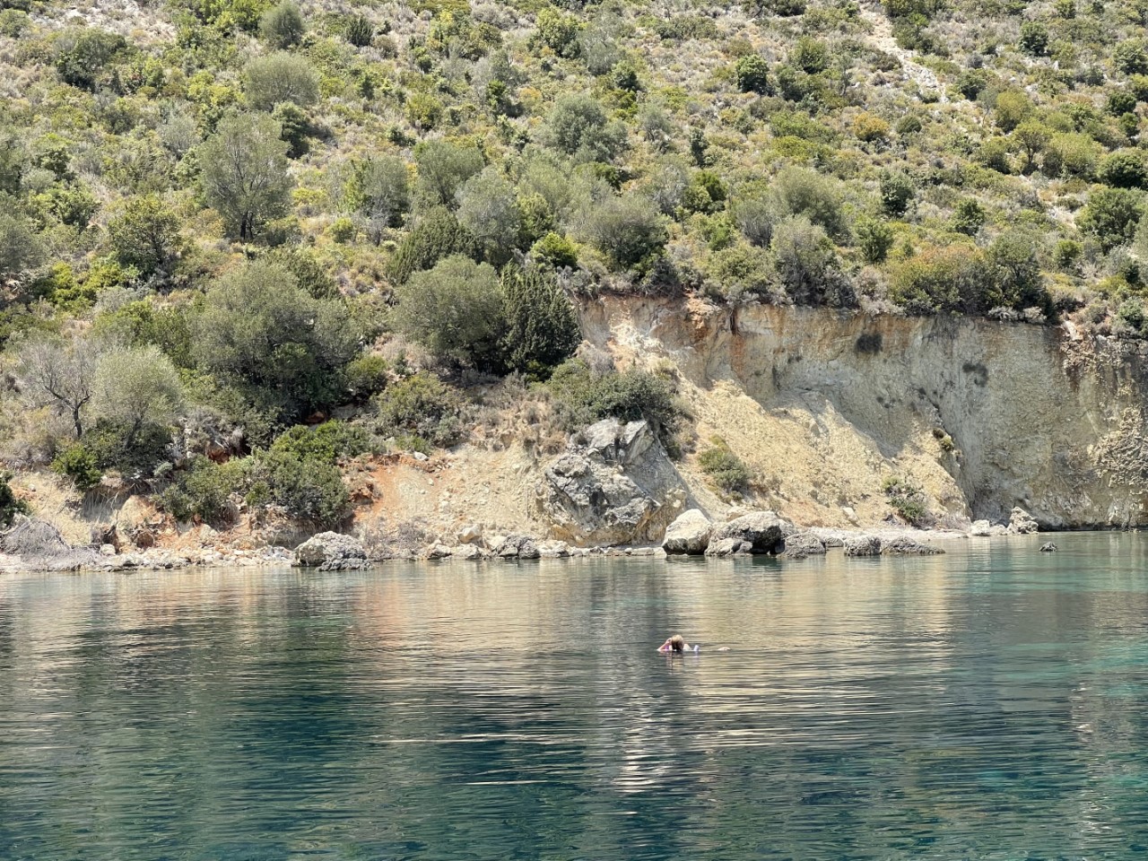 We zetten op onze tablet de koers naar het eiland Atakos. Onderweg komen we mooie baaien tegen en ik zit constant op Navily te kijken of het wat voor ons is. De vier baaien bij Atakos zijn wel mooi, maar er zijn nog veel meer mogelijkheden. Zo zien we de baai Exo Aetou. We zijn er al een paar keer langs gevaren, toen we naar Vathy op Ithaka gingen. De baai is heel ruim en er liggen maar drie andere zeilboten. We kiezen voor een plekje vlakbij de rotsen en ons anker laten we zakken op een ruime zandplaat. Direct liggen we in het water, want de temperatuur loopt vandaag op tot 45 graden. De rest van de middag liggen we dan ook vaak in het water en Marianne is drie kwartier aan het snorkelen rond de rotsen. Ze is blij dat het allemaal weer lukt met haar arm.