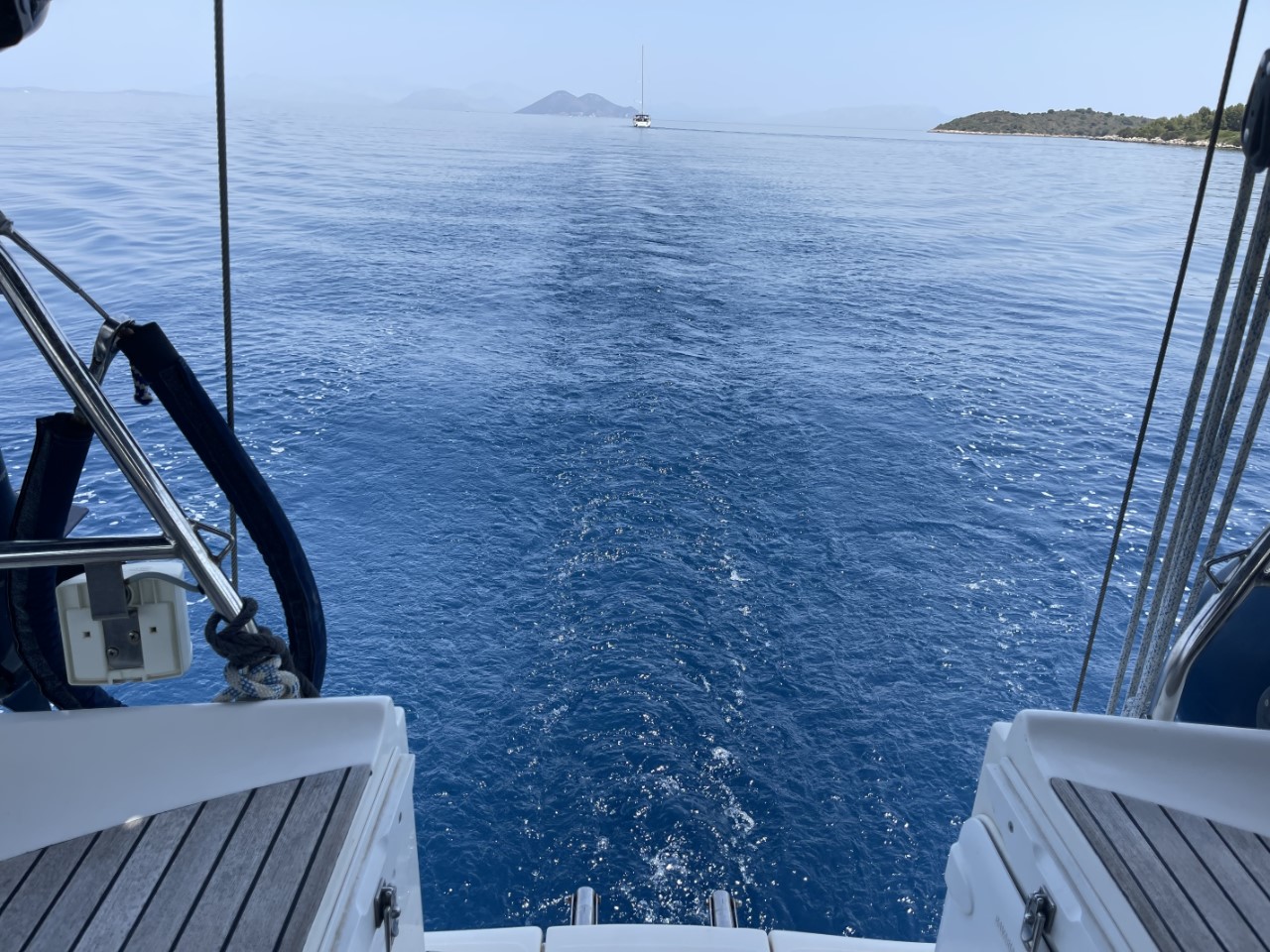 De supermarkt is inmiddels ook open en we halen voor een paar dagen verse producten. Dat is ook wel nodig, want zondag en maandag is alles dicht in verband met Pinksteren. Voor ons doen verlaten we laat de haven van Poros. De meeste boten zijn al vertrokken.