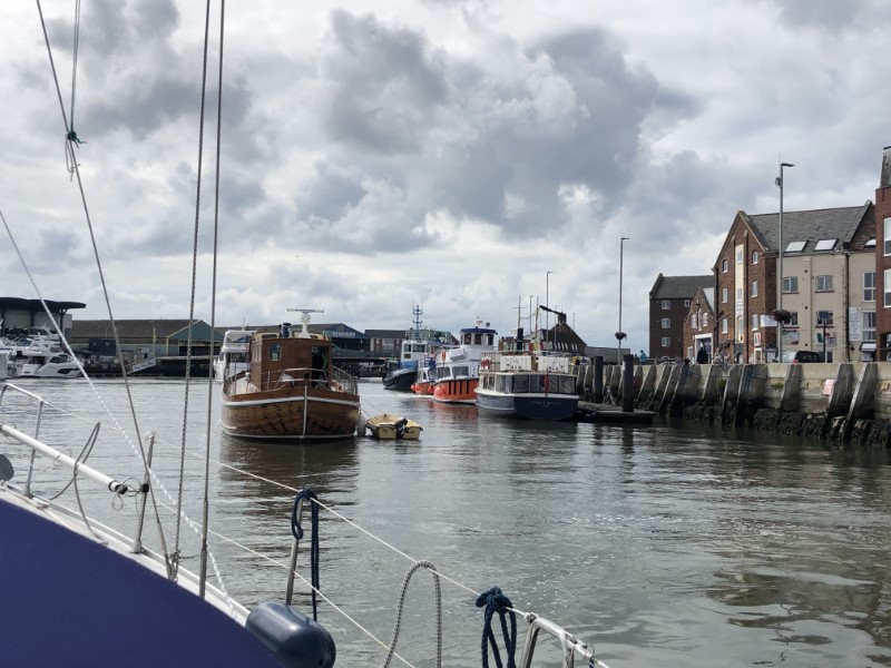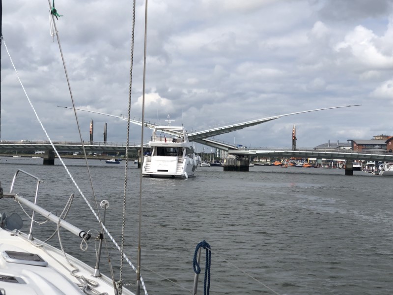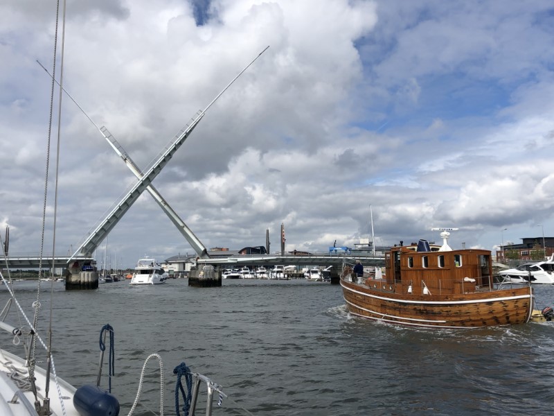 We waren weer vroeg uit de veren. Even snel stokbroodjes halen en direct na het ontbijt gingen de lijntjes los. We wilden 09:00 uur vertrekken, maar we varen iets eerder naar het tankstation voor wat diesel. Te vroeg! Ze beginnen daar pas om 09:00 uur, maar om 09:20 uur kunnen we toch koers zetten naar Poole. Met een lekker zonnetje en weer wind tegen varen we de Solent op. Deze keer niet naar Cowes, een haven die we meestal niet overslaan. Maar we willen westwaarts en je kan niet alles. Even voor de Needles begon de stroming te kenteren en met ruim 8 knopen vaarden we op grote afstand langs dit mooie stukje natuur. Ik had graag met de drone willen vliegen, maar we vaarden te snel, de Needles waren te ver en het waaide te hard. We hadden tot Poole profijt van de stroming, maar in het boeienkanaaltje hadden we de stroming van 2 knopen flink tegen. We laverden tussen de veerboot, de havenrondvaartboten, andere zeiljachtjes, snelle speedbootjes en een sleepboot met aanhang. De tijd tikte door, want er moest een brug gehaald worden en het schoot niet erg op. Gelukkig precies op tijd na een spannend kwartiertje gingen we gelijk mee de brug door. Er volgde een tweede hele speciale brug, de Twin Sails Bridge, wat een bouwwerk (zie de foto’s). Je zeg de twee zeilen erin ontworpen. Dan breekt voor ons nog een spannend laatste stukje varen aan. Het tij was flink dalend en de havenmeester had ons verzekerd dat het goed zou gaan. Het was door een smal kronkelig geultje met een paar palen, die de vaarrichting aangeven. We moesten flink in het midden blijven en de dieptemeter protesteerde flink. We bereikten de haven, het boxnummer hadden we al per telefoon doorgekregen en we konden bijna direct de box invaren. Alhoewel niet helemaal. De boeg stopte 2 meter voor de steiger. We hebben de Just nog wel met wat lijntjes vastgelegd, maar het was niet nodig, want we lagen vast op de bodem. Zo we zijn in Poole, morgen maar ontdekken wat er hier te doen is.