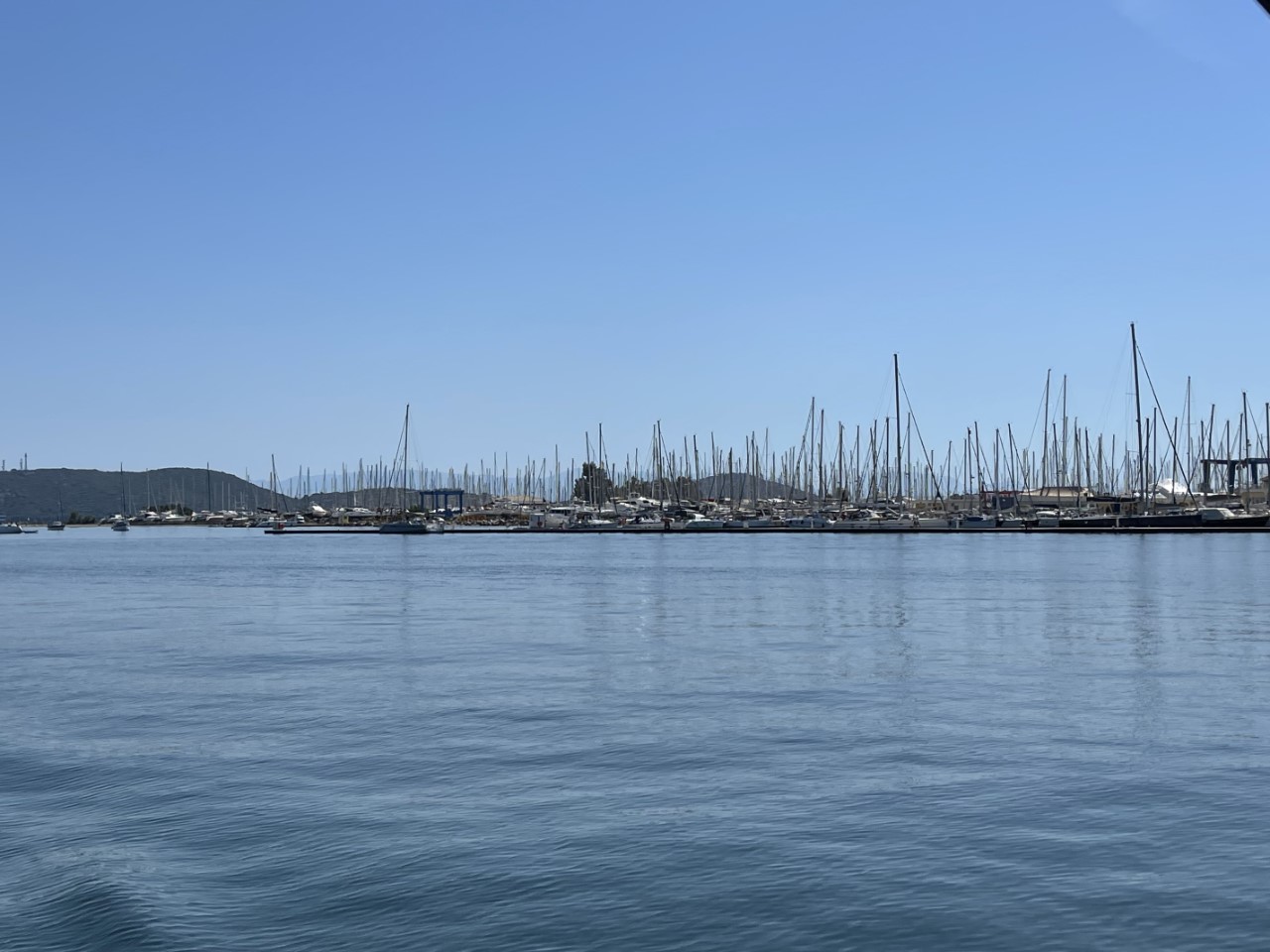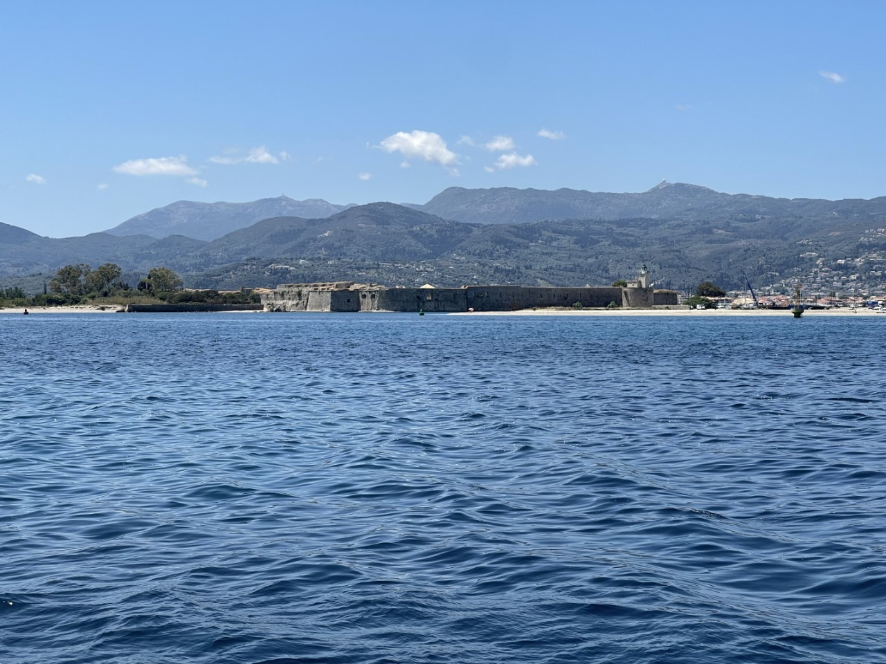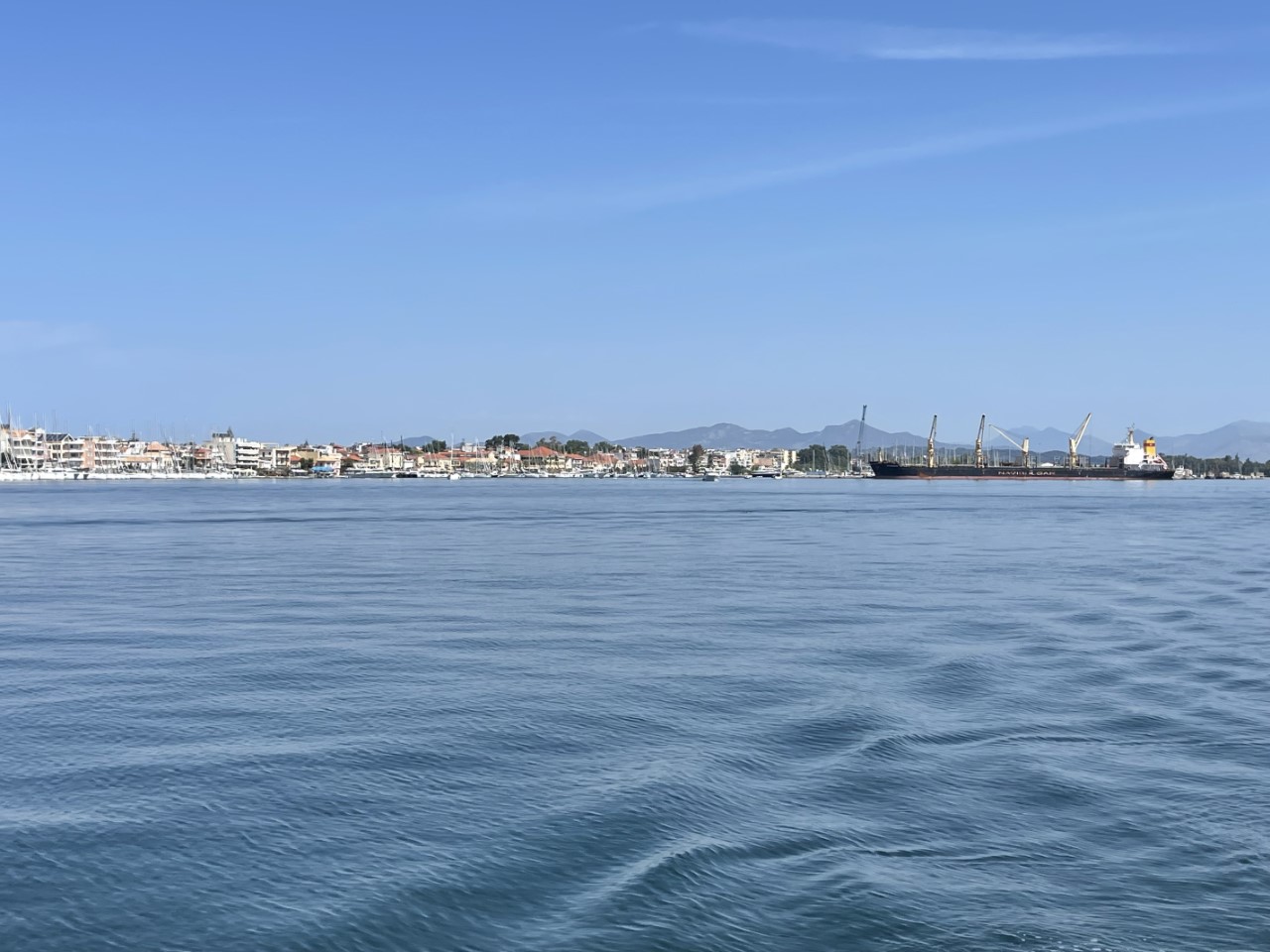 We stappen voor 09:00 uur in het bijbootje. Ik zie een oud mannetje driftig aan het roeien dezelfde richting op en ik vraag of hij een sleepje wil. Nee bedankt, zegt hij, het is goed voor m’n conditie. Wij zoeken verder, waar we het bijbootje achter kunnen laten in deze vreemde vissershaven. Uiteindelijk vinden we een plekje op de kopse kant van een kade. Er zit daar een visser z’n nachtvangst te verzamelen. Wij vragen of het goed is om daar aan te leggen en dat is geen probleem. Het blijft toch altijd een gok of het bijbootje er nog is, als we terug willen. We hebben nu al van twee havens gelezen over inbraken en diefstallen. De eerste was Argostoli en gisteren lazen we dat ook bij Itea veel diefstallen zijn. Meestal door zigeuners, die zelfs aan boord stappen, als je ligt te slapen. Het oude Franse mannetje komt ook aanroeien en neemt een ruime ligplaats in. We lopen een stukje samen op en hij vertelt dat hij al 6 jaar onderweg is en op z’n 71-ste zijn huis in Parijs heeft verkocht en sindsdien op zijn boot woont.