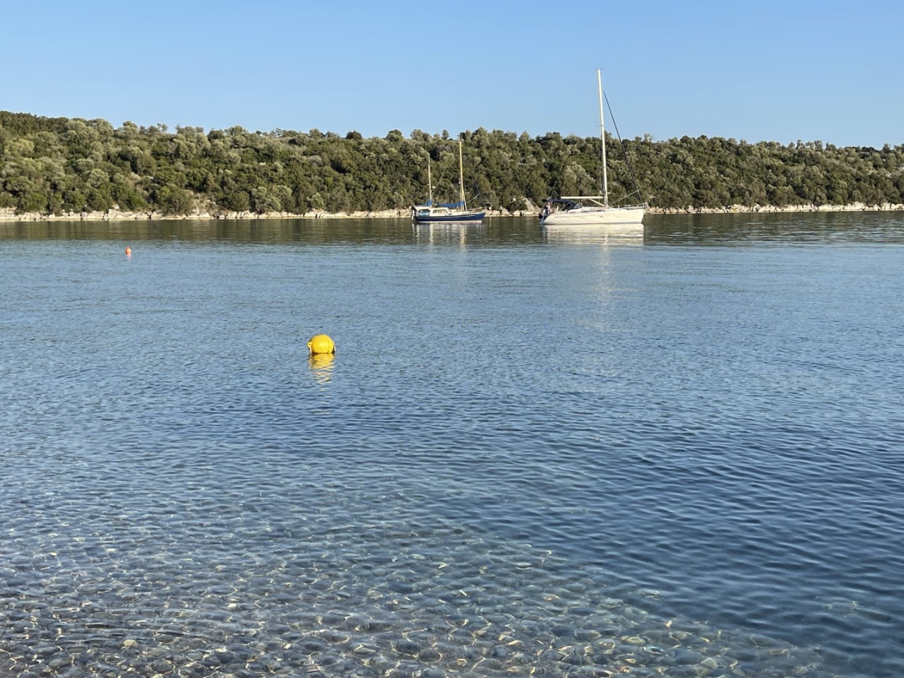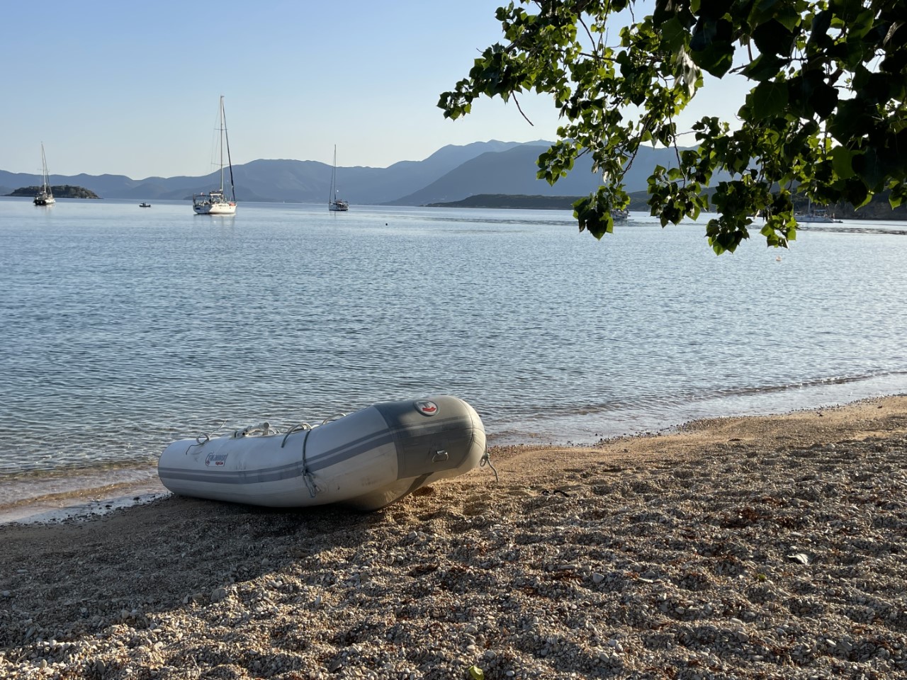We hebben een aardig plekje, maar na twee uur vertrekken er veel bootjes en verplaatsen we de Just nog iets dichterbij het strandje. Tegen de avond zijn we even naar het strandje geroeid. We lopen een stukje langs het kiezelstrand en zien een weggetje bergop, waar we een stukje tegenop gelopen zijn. Misschien dat we morgen verder gaan wandelen, maar op een paar slippers is het geen doen.