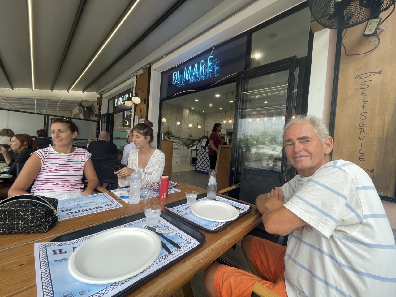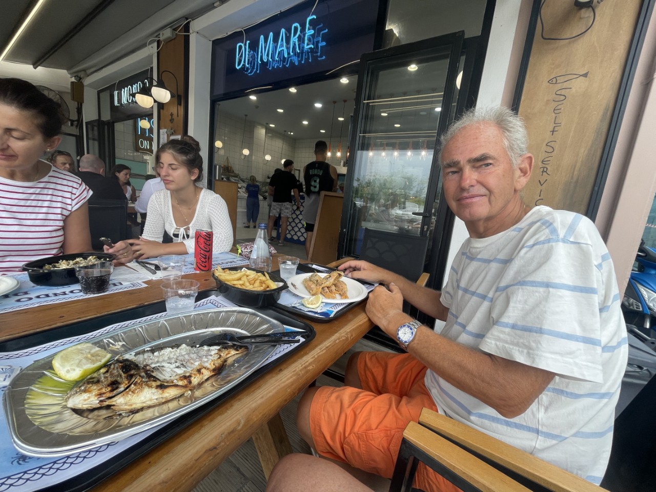 We wandelen naar het visrestaurantje, waar je een vis kan aanwijzen, die ze vervolgens voor je grillen op de bbq of voor je frituren. Ze hebben ook een bord staan met een menukaart met dingen als spaghetti met gamba’s en kabeljauw met knoflook in de oven. Marianne wijst een lekkere dorade aan en ik kies een paar rode muls. Zelf je bestek en je bordje pakken en een plaatsje zoeken tot de vis bereid is. Eerst komt een grote bak frietjes op tafel en daarna de rest. We zitten gezamenlijk met de Grieken aan tafel. Zo hebben we een lekkere en gezellige lunch.