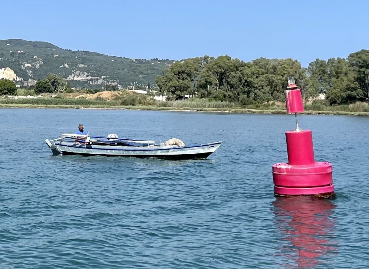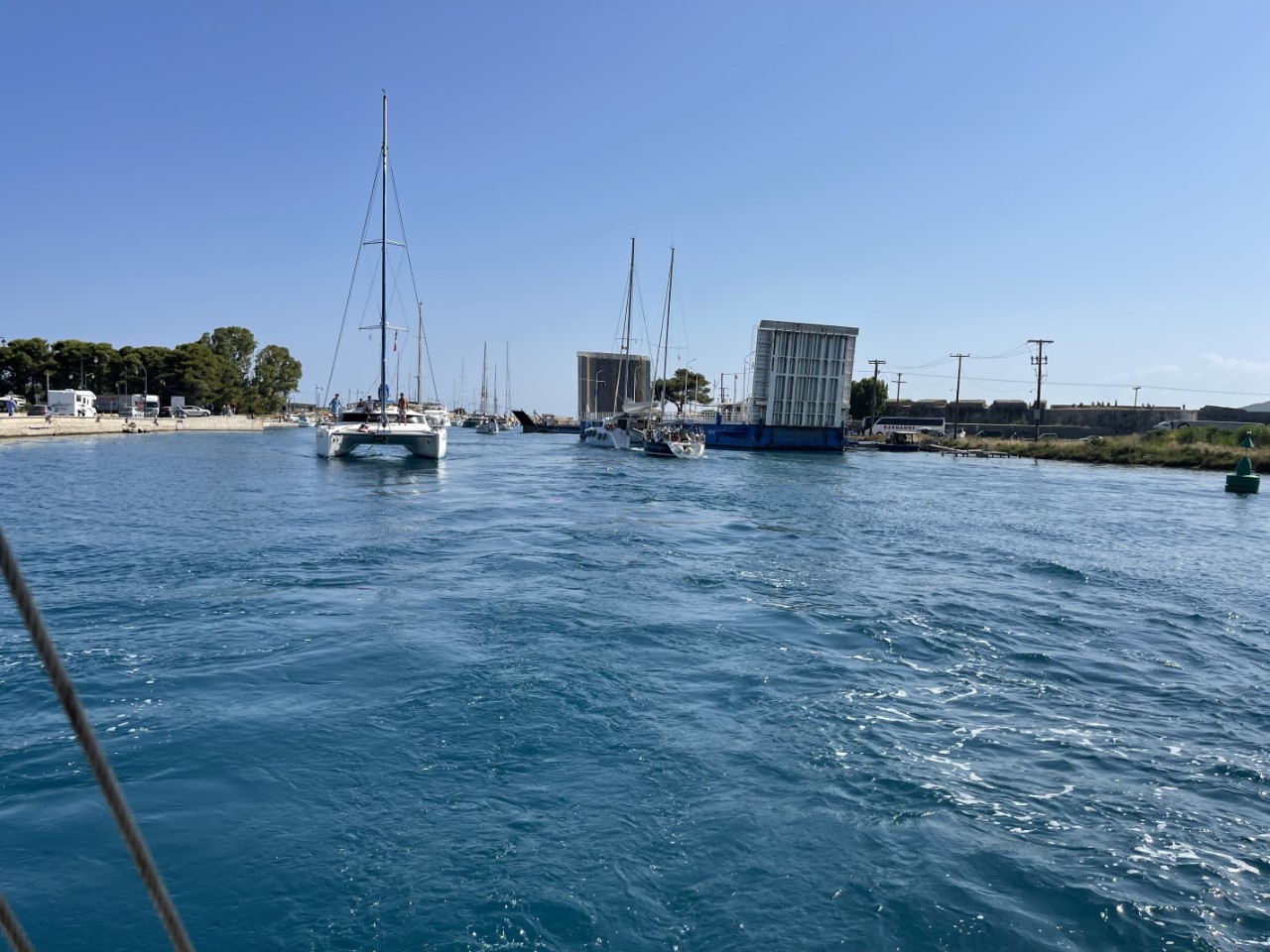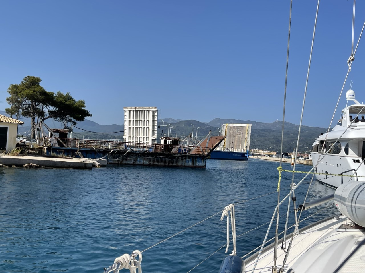 We hadden verwacht, dat veel boten samen met ons richting Lefkas zouden gaan om daar door de swingbrug te gaan. We arriveren alleen bij de swingbrug en leggen even voor een half uurtje de Just aan de kade. De Swingbrug draait alleen op de hele uren, zuidwaarts gaande jachten hebben voorrang volgens de Pilot. Even voor 10:00 uur wordt het iets drukker. Een groot jacht, die ons toch zal inhalen, laten we voor gaan. Een eigenwijze Fransman op leeftijd, die op zeil probeert aan te leggen, geven we maar wat meer ruimte, want die manoeuvre blijkt hij nog niet onder de knie te hebben. Ook het grote jacht begrijpt het niet helemaal, want de swingbrug staat al helemaal open en hij blijft wachten, waarop weten we niet, misschien wel op het handsignaal van Marianne, dat hij moet gaan varen.
